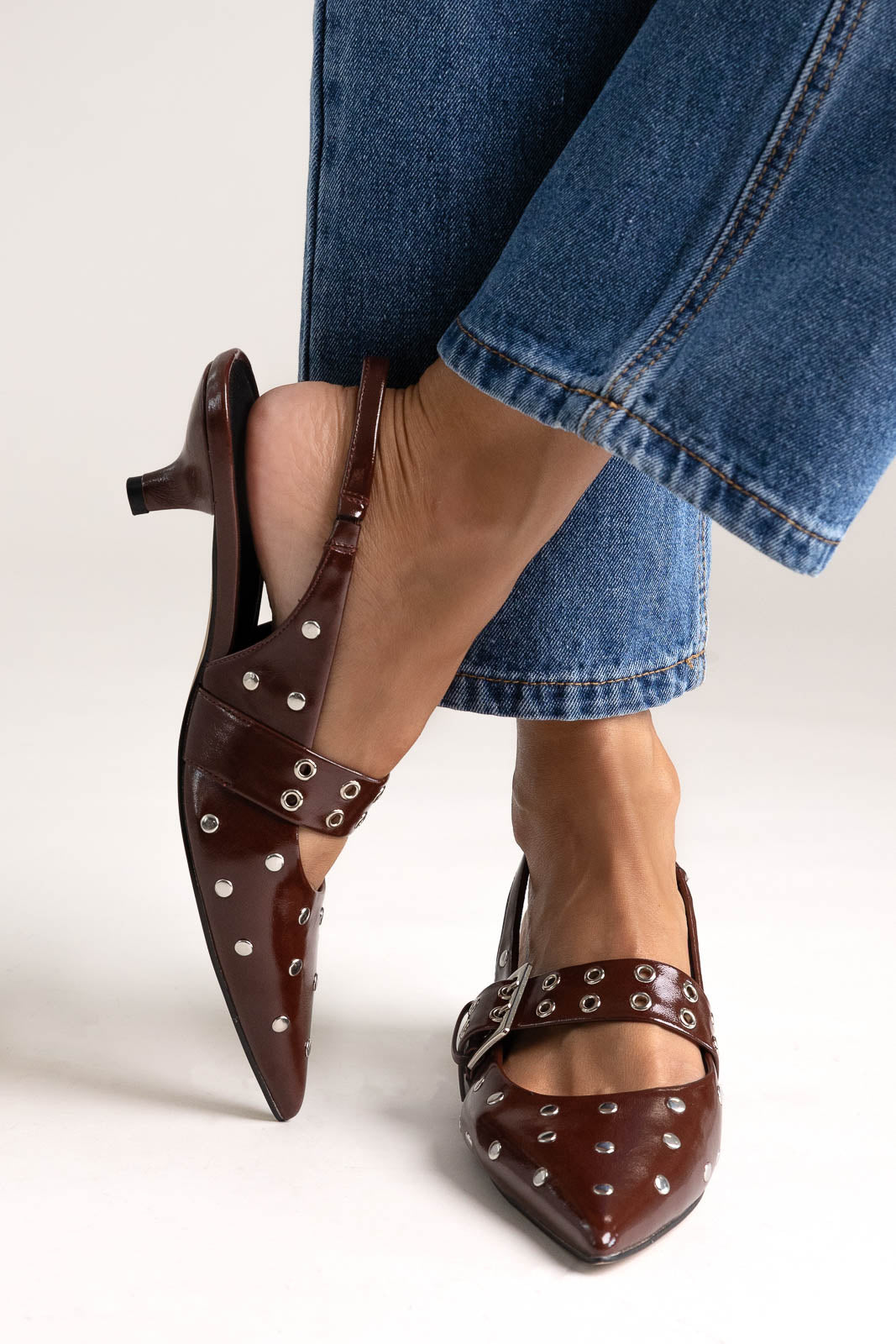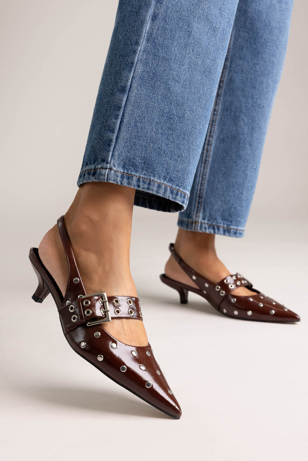 Διακοσμημένες λουστρίνι slingback γόβες από την CORINA με χαμηλό τακούνι kitten και λουράκι με αγκράφα. Κομψή, μαλακή εφαρμογή—σχεδιασμένες για κομψότητα από το πρωί ως το βράδυ.