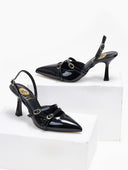 Γόβες λουστρίνι μυτερές με ανοιχτή φτέρνα TFP. έχουν λεπτά ρυθμιζόμενα λουράκια στο κουτεπιέ. Λουράκι με κούμπωμα στο πλάι στο πίσω μέρος. Ελληνικής κατασκευής.