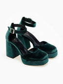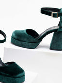 Γόβες velvet TFP. Φιάπα και ψηλό χοντρό τακούνι. Ανοιχτά πλαίνά. Κλειστή φτέρνα. Δένουν με μπαρέτα στο ύψος του αστραγάλου. Δερμάτνος πάτος. Ελληνικής κατασκευής.