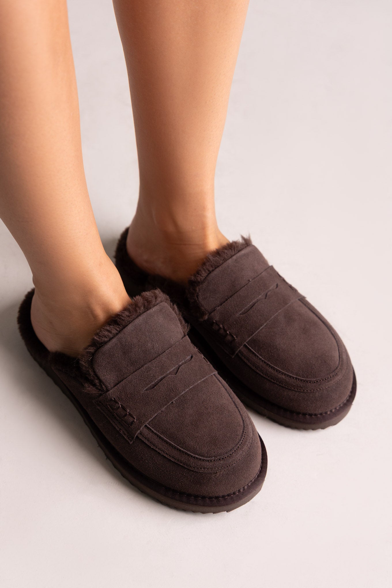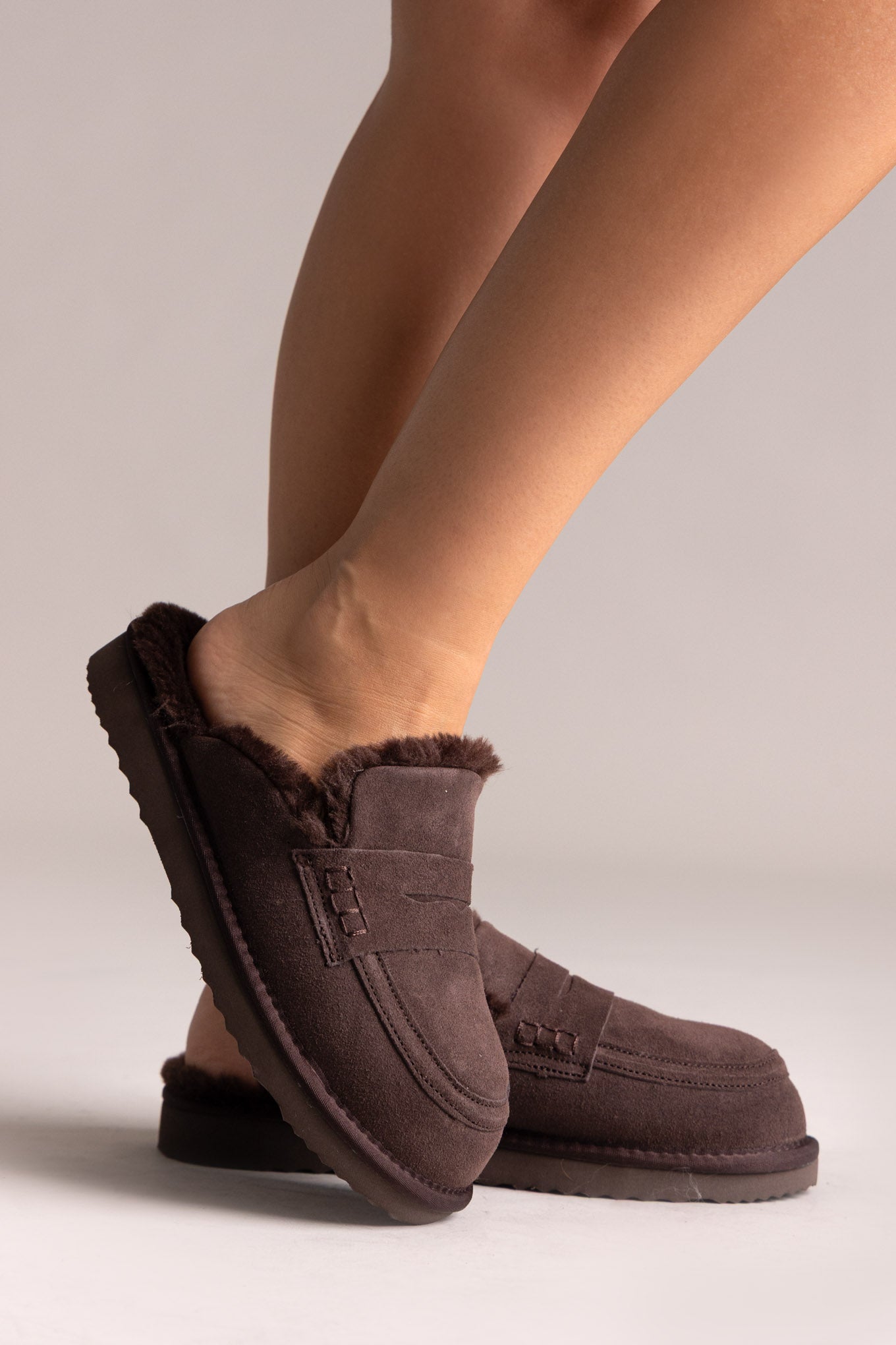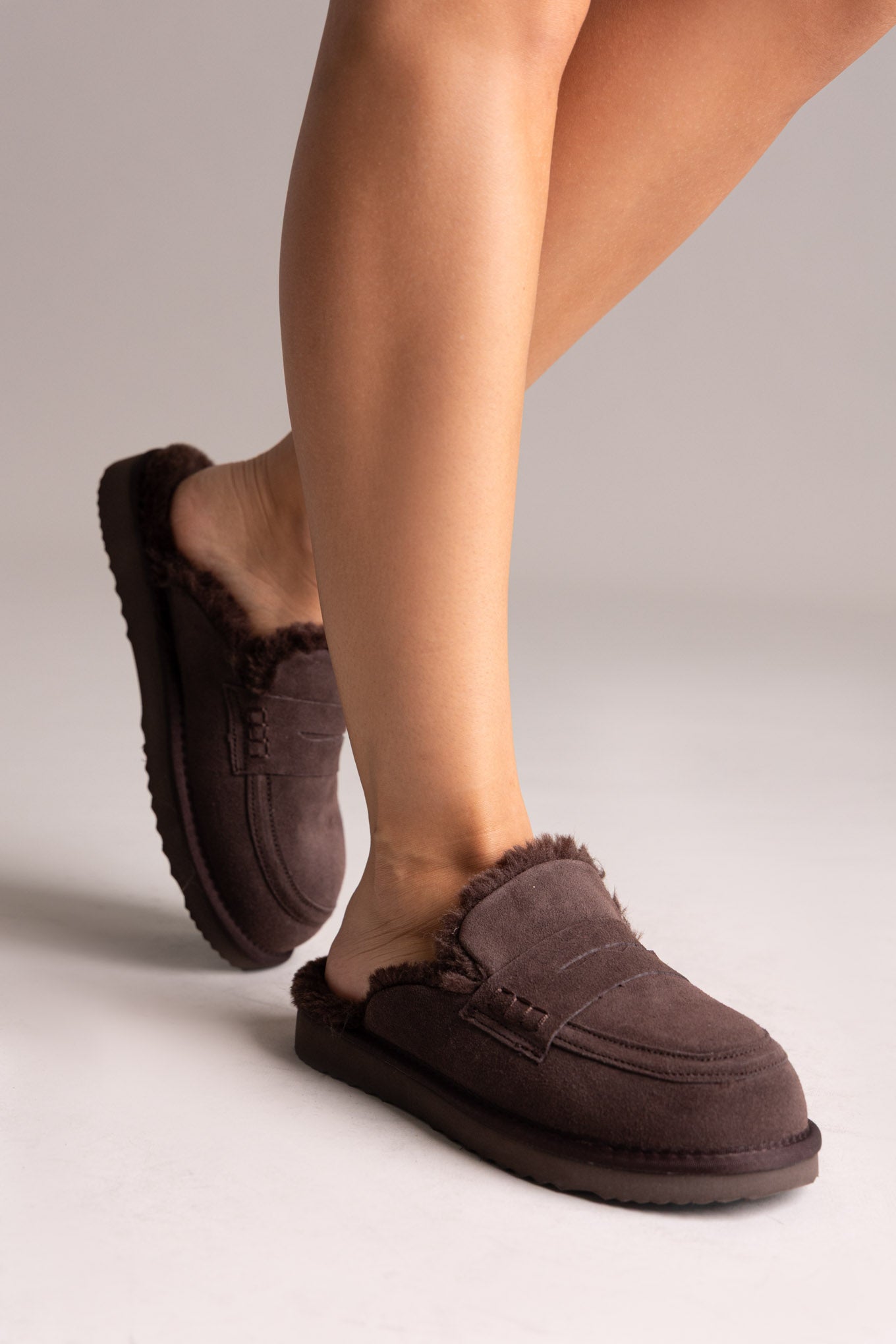 Χειμερινές παντόφλες με γούνα KELARA - Καφέ Σουέτ
