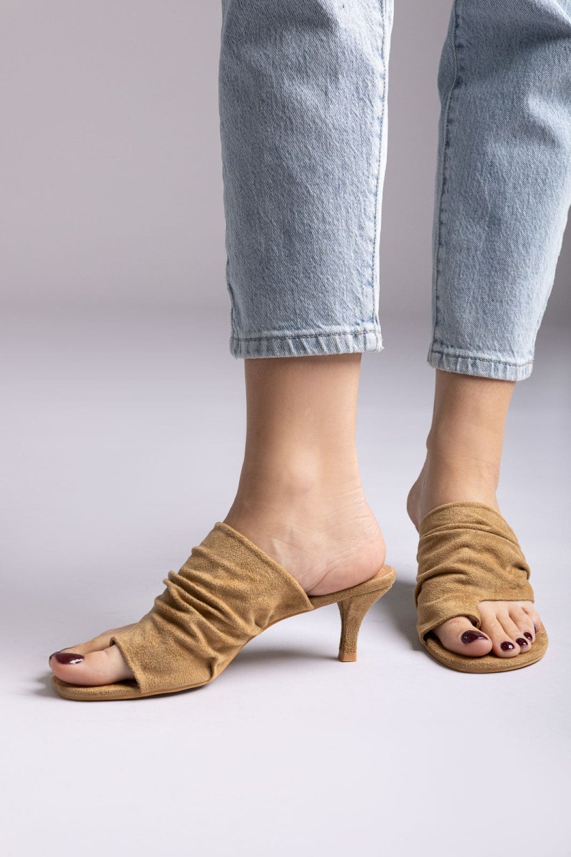 Σουέντ mules με φαρδύ λουρί στο κουντεπιέ και λεπτό χαμηλό kitten heel. Κομψή σιλουέτα με ισορροπημένη άνεση. Εκλεπτυσμένη καθημερινή κομψότητα φτιαγμένη για σύγχρονες γυναίκες.