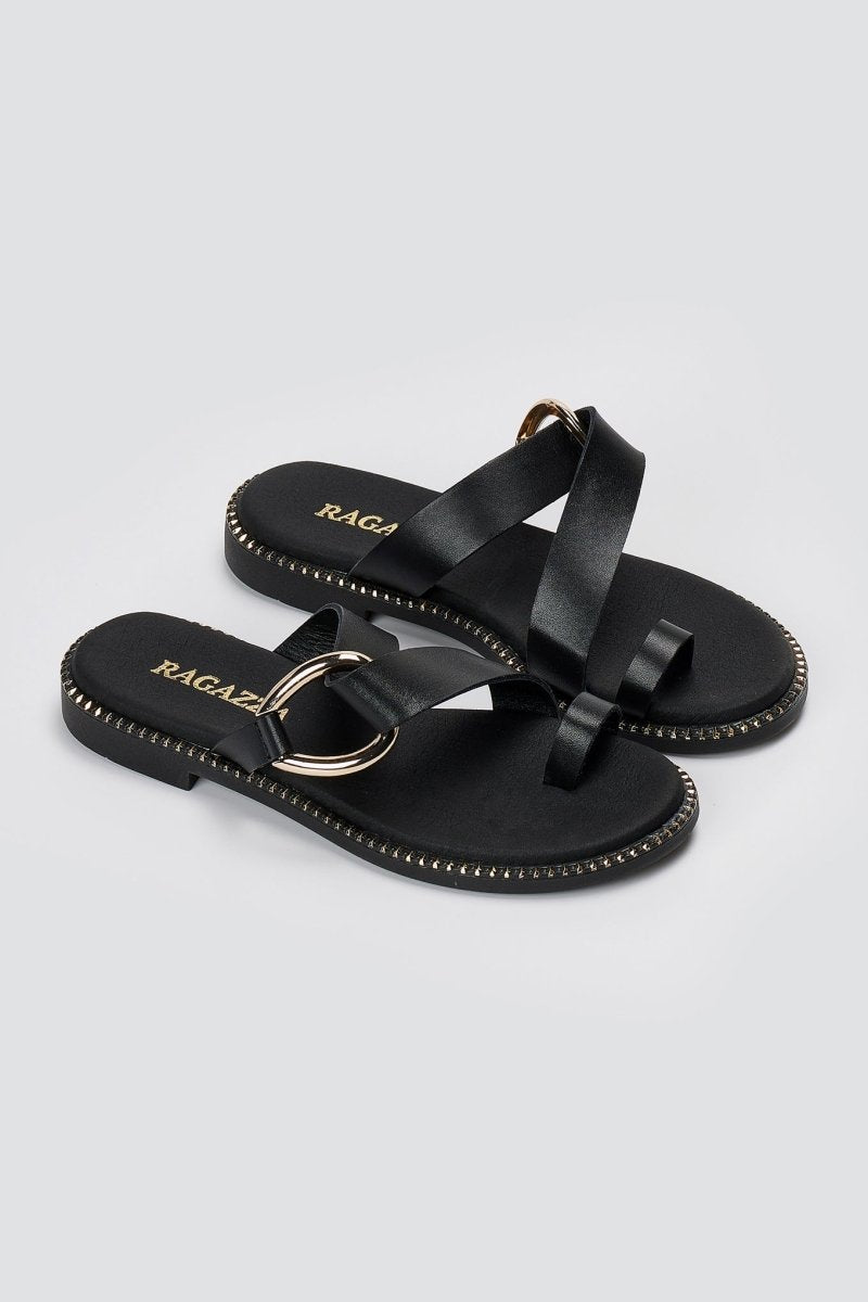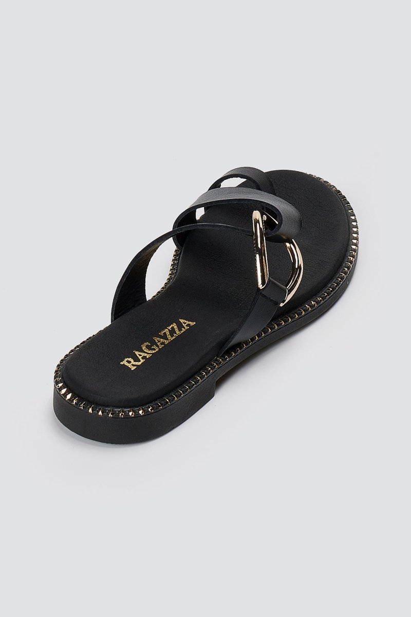 Γυναικεία σανδάλια από γνήσιο δέρμα με λοξό λουρί, μεγάλη μεταλλική αγκράφα και διακοσμητικά γύρω από τη σόλα. Η άνεση Ragazza Dryflex προσφέρει διαπνοή, απορρόφηση κραδασμών και φρεσκάδα όλη μέρα—κατασκευασμένα στην Ελλάδα για άνετη χρήση.