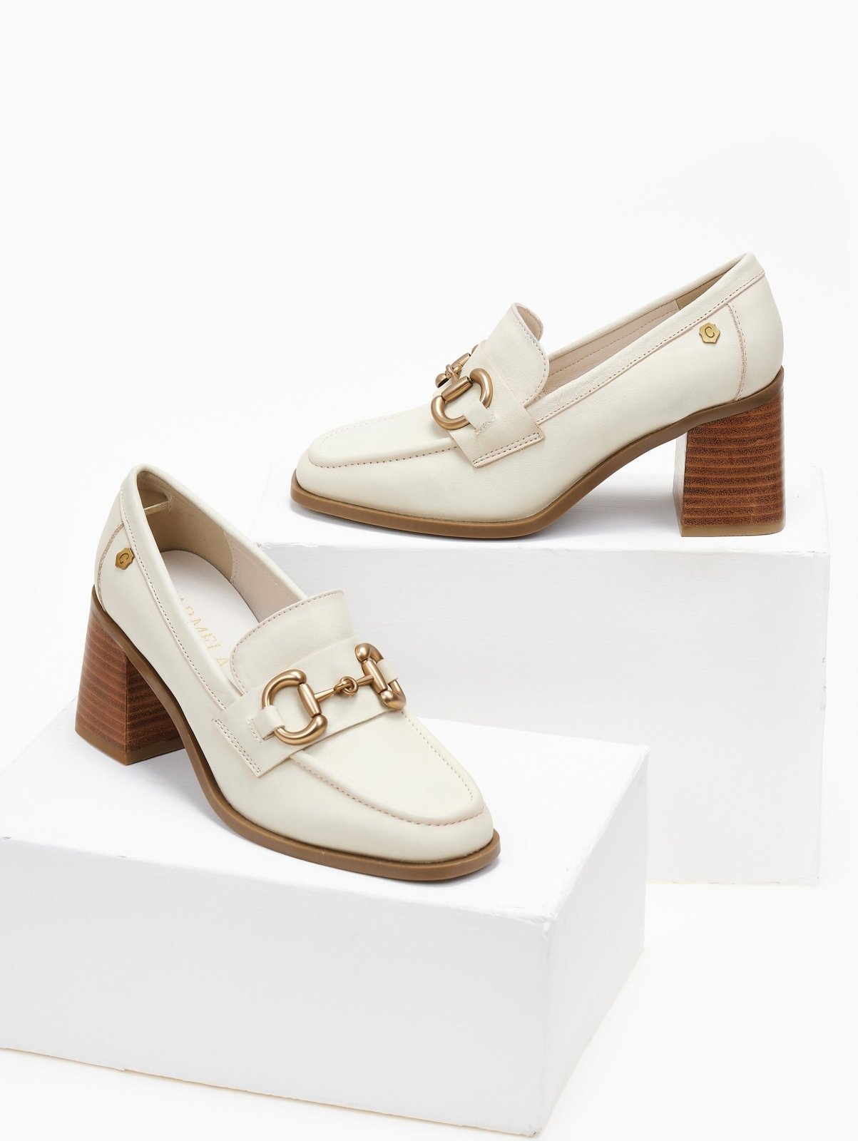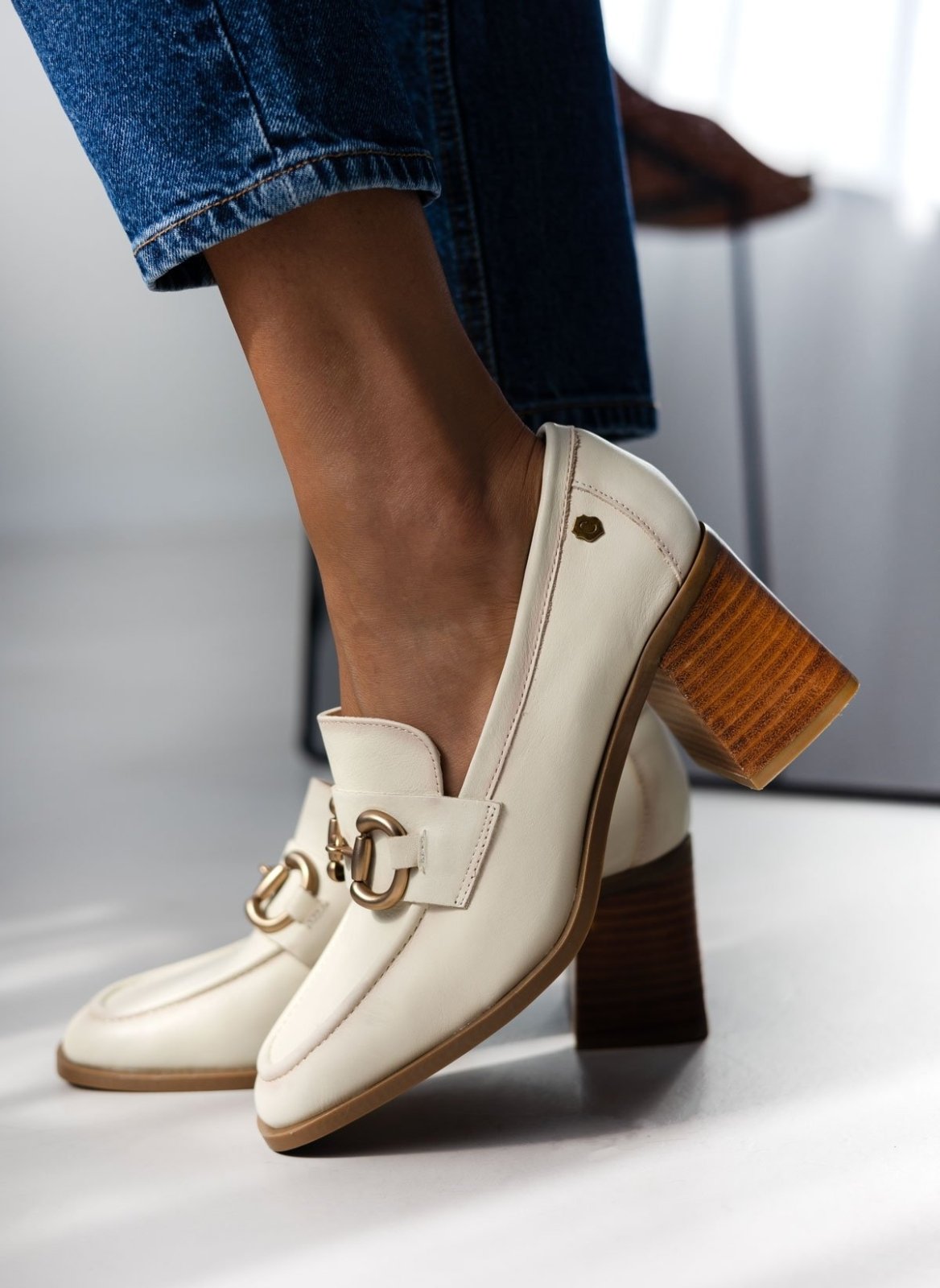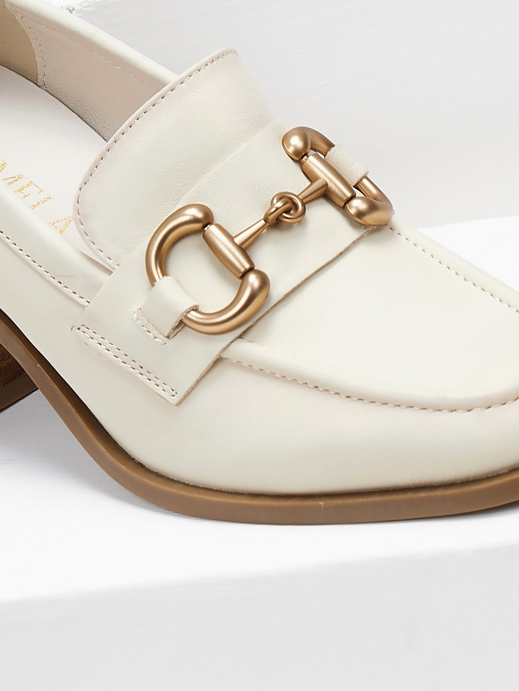 Loafers δερμάτινα με τακούνι Carmela. έχουμε ματ μεταλλικό διακοσμητικό σε χρυσό χρώμα. Comfort δερμάτινος πάτος.