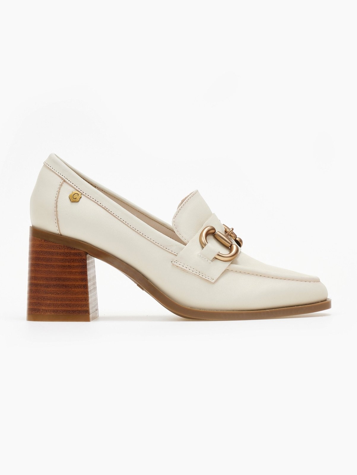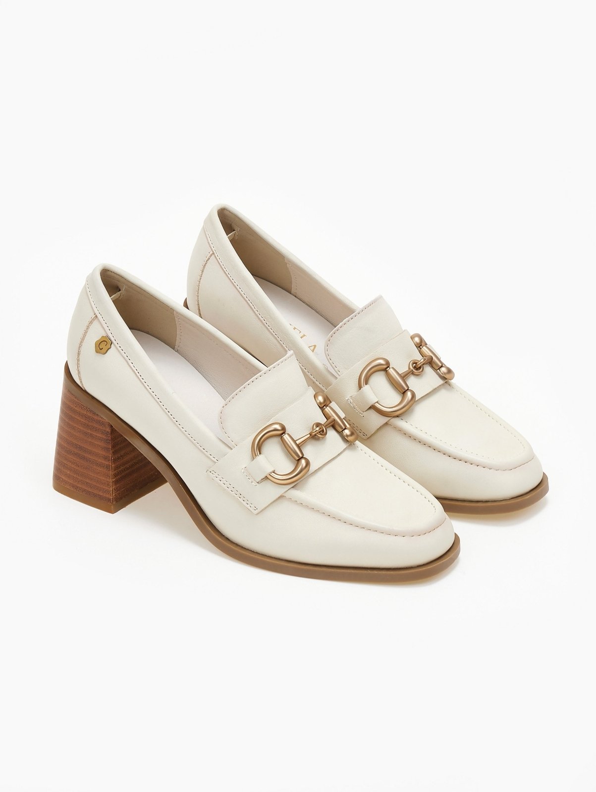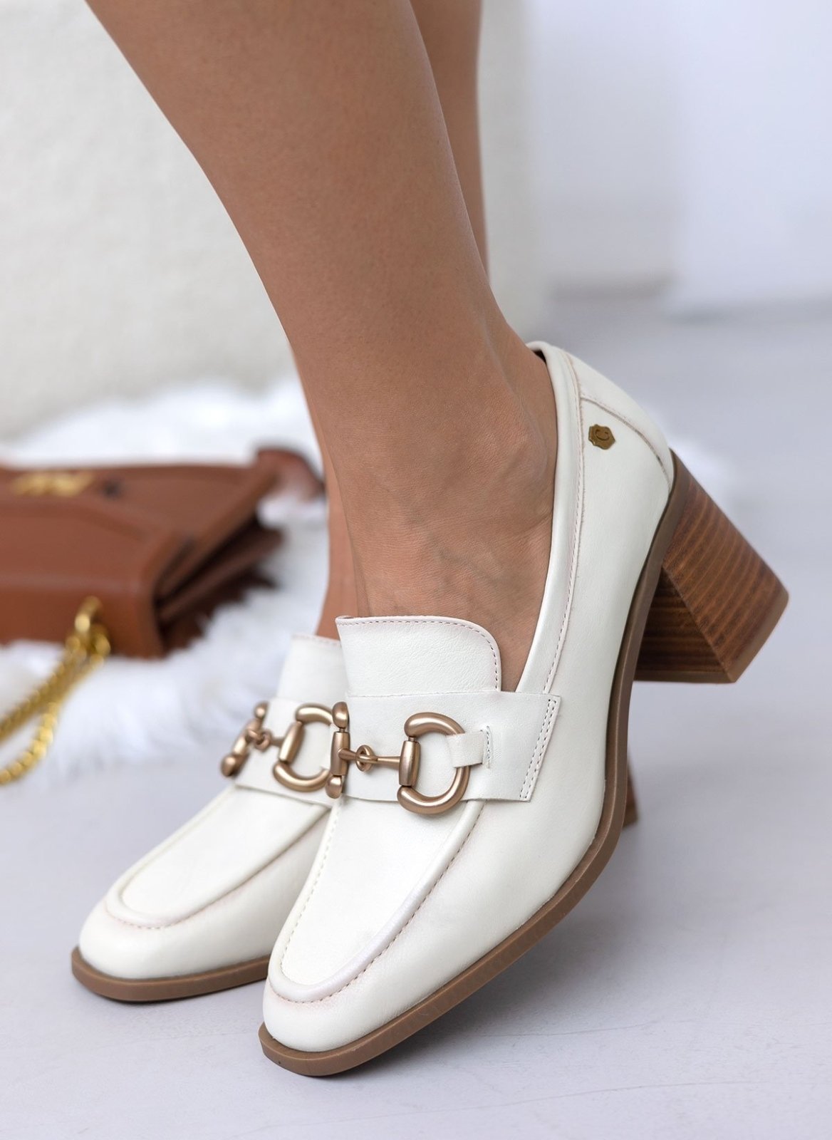 Loafers δερμάτινα με τακούνι Carmela. έχουμε ματ μεταλλικό διακοσμητικό σε χρυσό χρώμα. Comfort δερμάτινος πάτος.