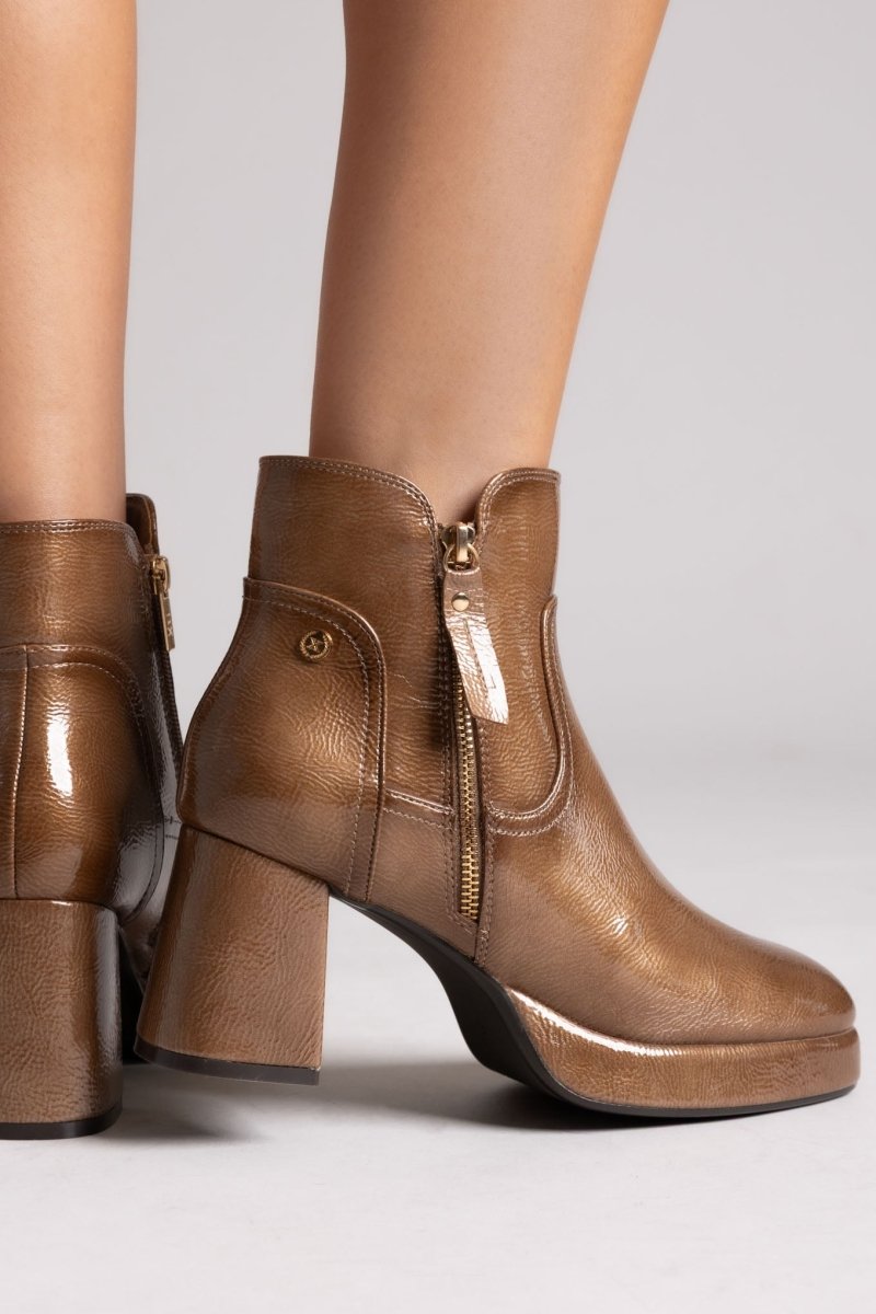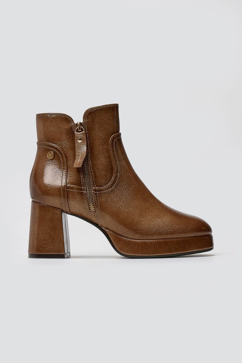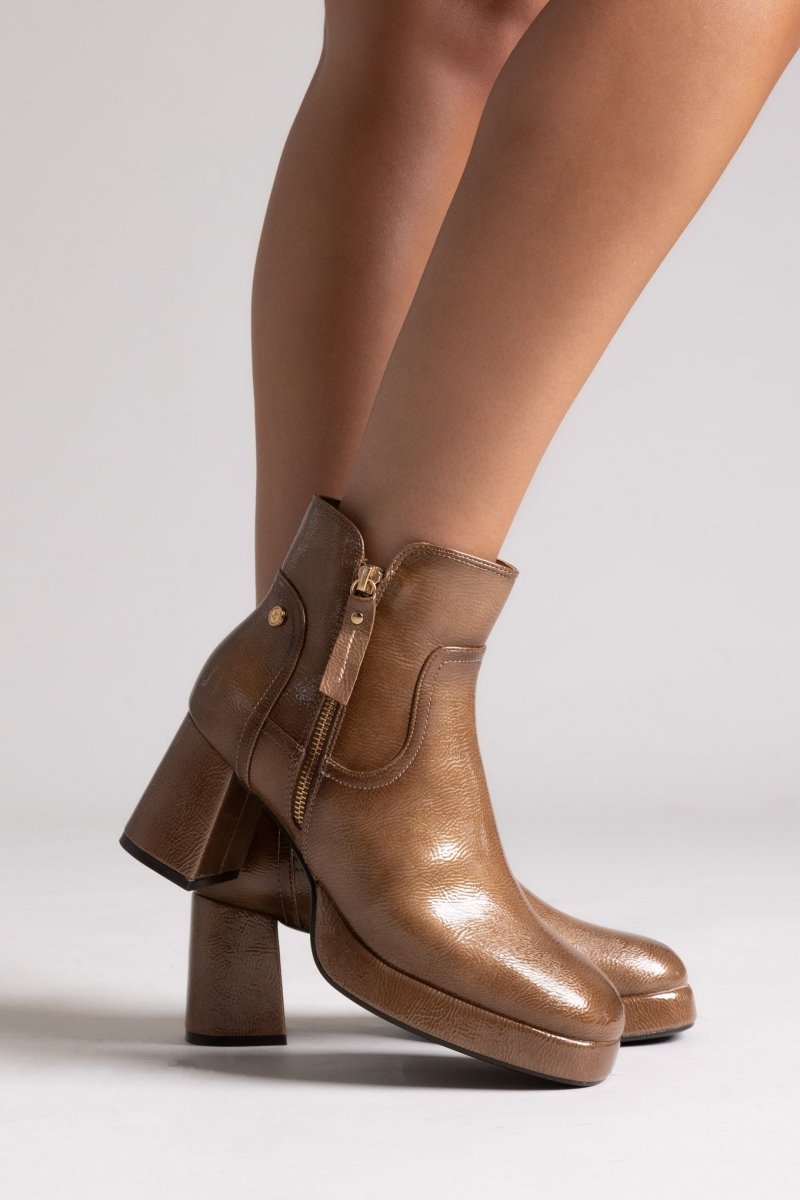 <p>Γυναικεία μποτάκια Xti 144272 σε ταμπά λουστρίνι με block τακούνι, τετράγωνη μύτη και πλαϊνό φερμουάρ. Με ανατομικό suede πάτο memory foam για άνεση. Vegan PETA approved.</p>