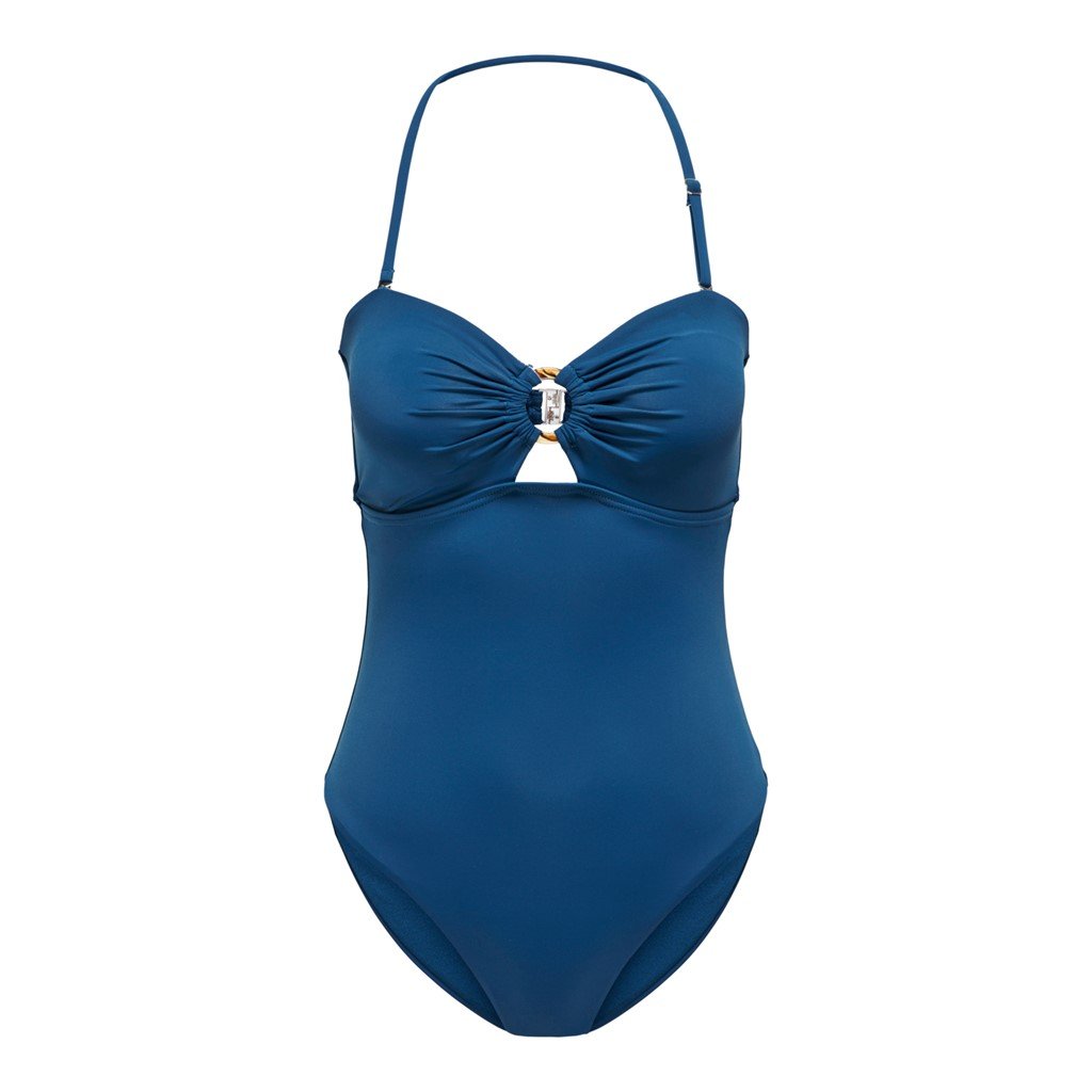 ΜΟΝΟ Στράπλες Μαγιό ολόσωμο. Έχει σιλικόνη στο μπούστο για καλύτερο κράτημα. Κοκκάλινο κρίκο. Ενίσχυση που αφαιρείται. Βραζιλία. Δένει με κορδόνι στο λαιμό. Άνοιγμα στην πλάτη.