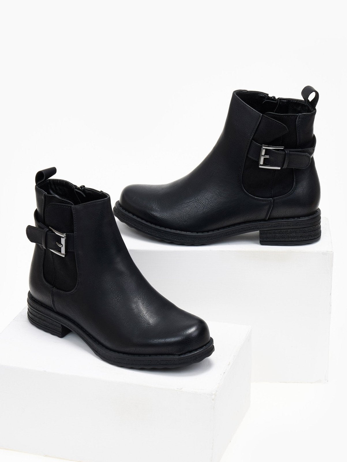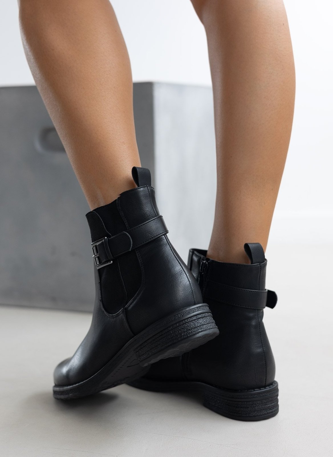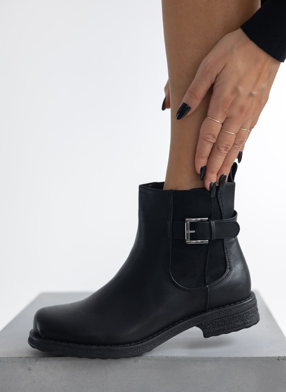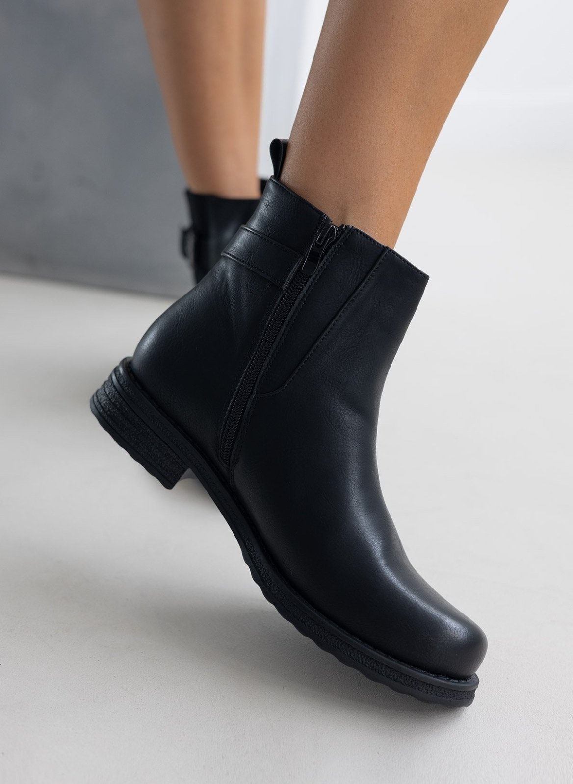 Μποτάκια αστραγάλου σε στρογγυλή γραμμή. Έχει σουέντ λεπτομέρεα με ζωνάκι στην εξωτερική τους πλευρά.