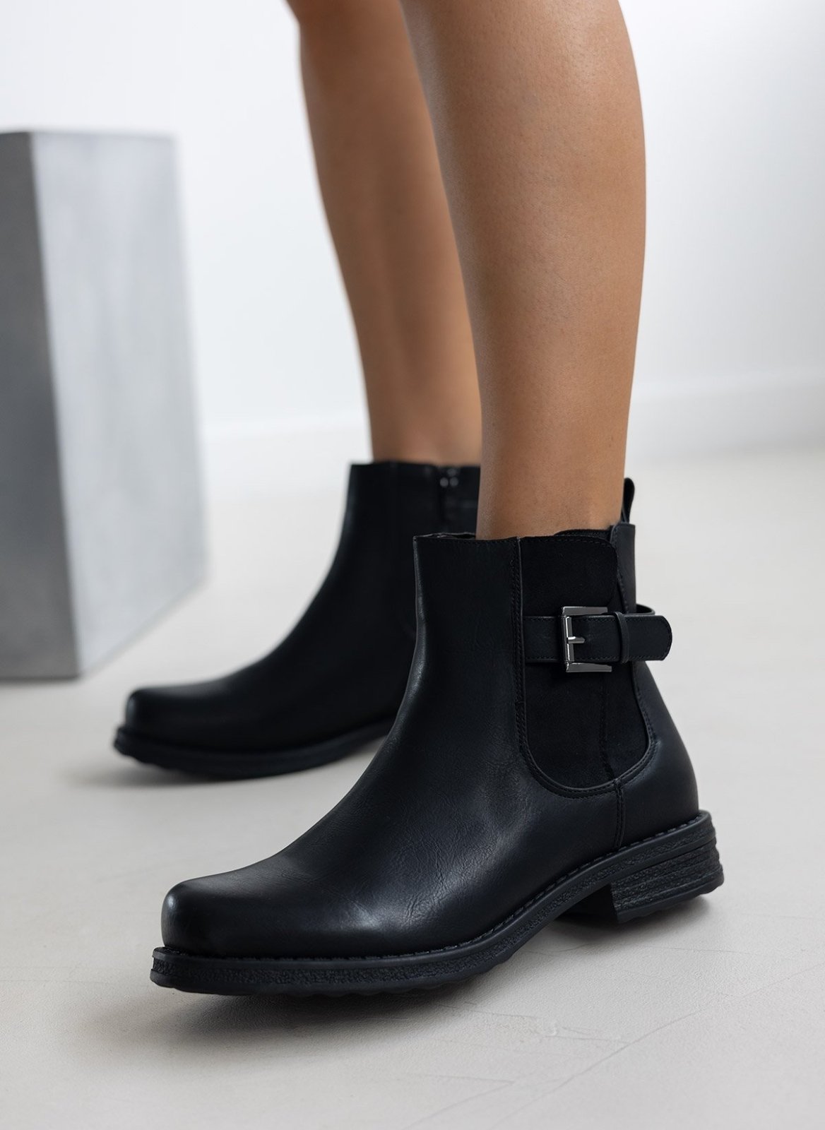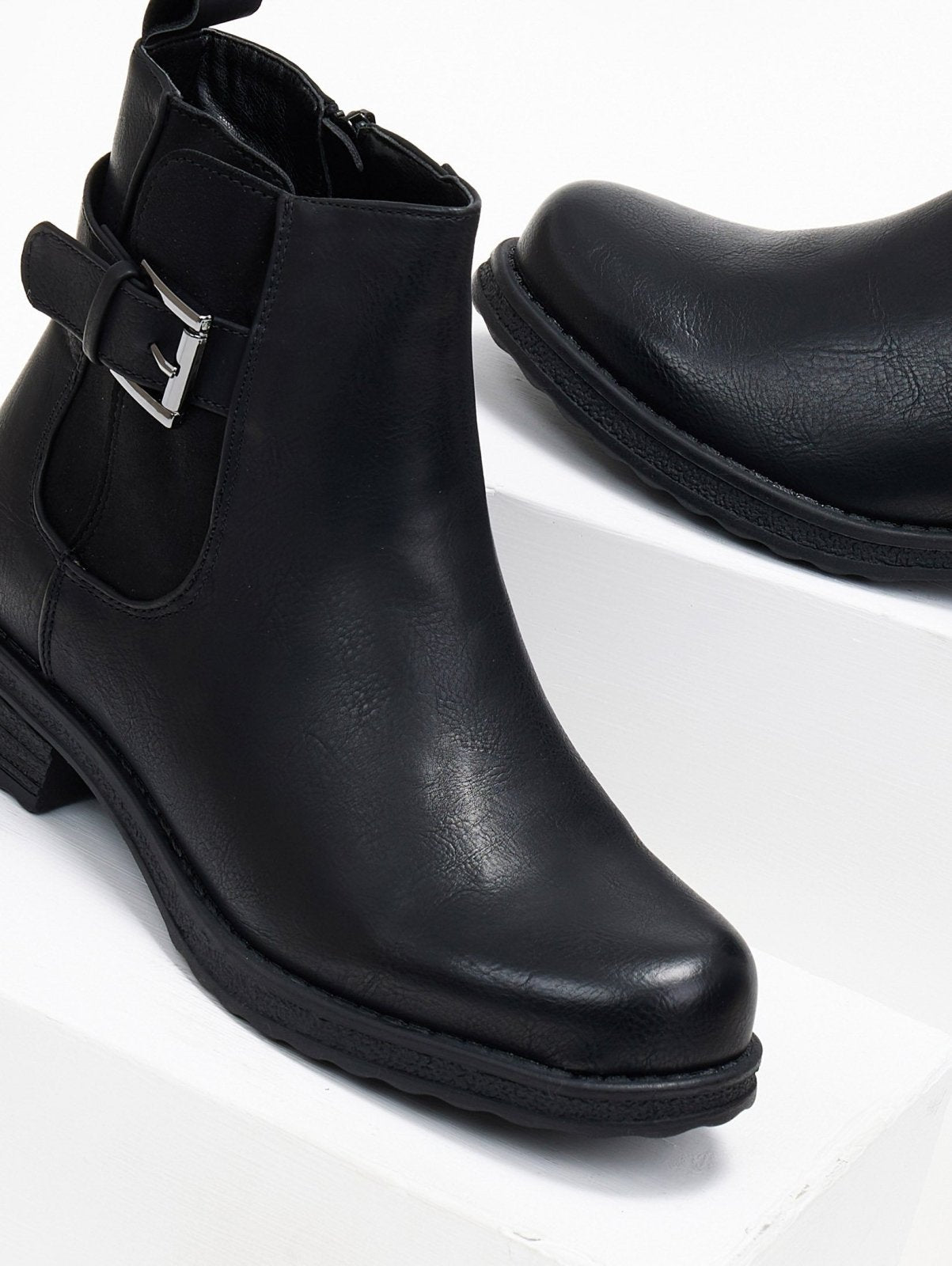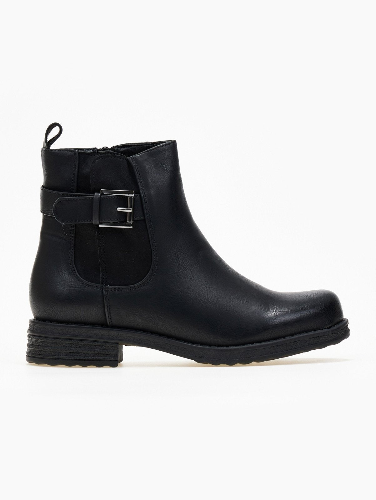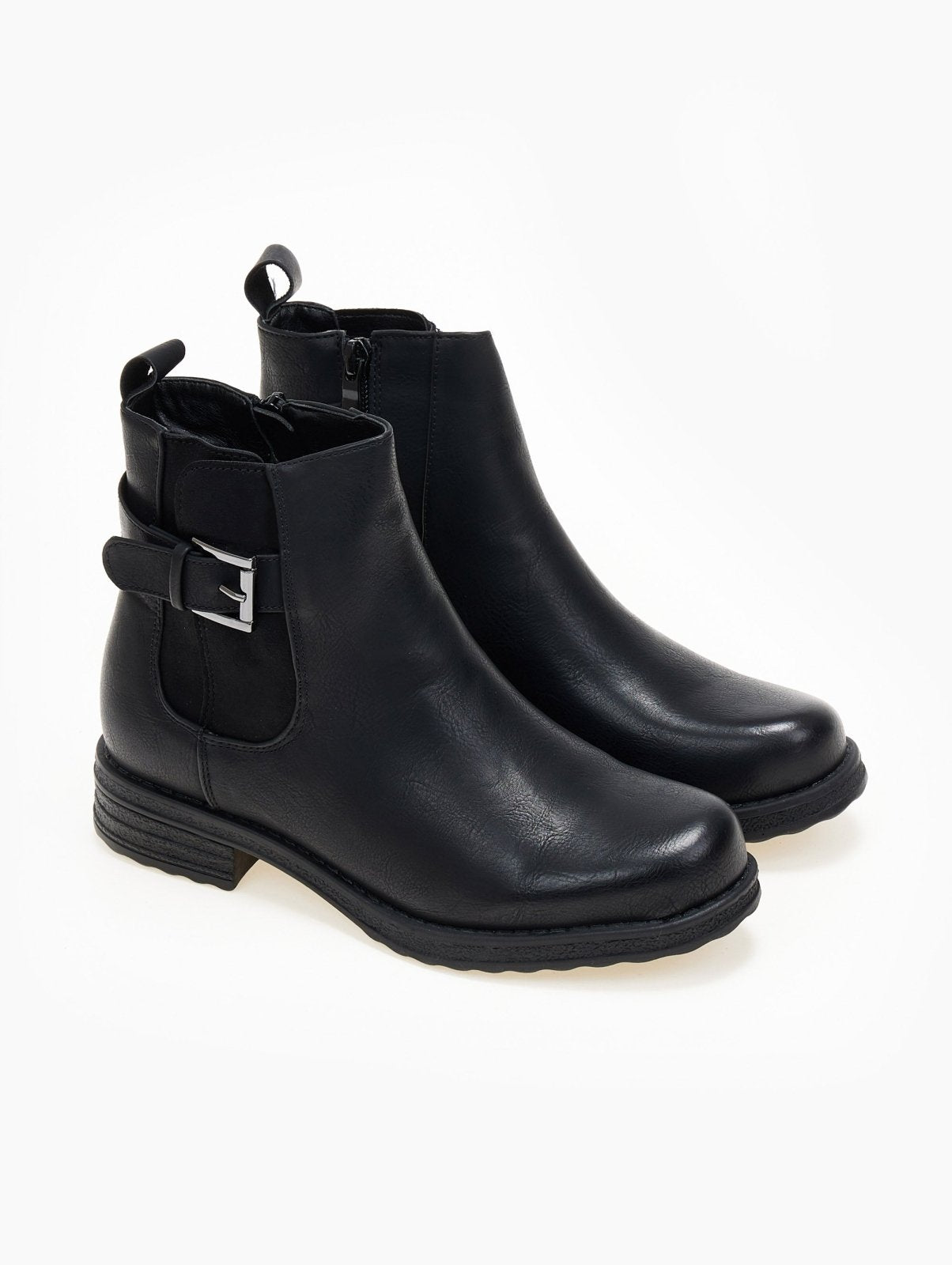 Μποτάκια αστραγάλου σε στρογγυλή γραμμή. Έχει σουέντ λεπτομέρεα με ζωνάκι στην εξωτερική τους πλευρά.
