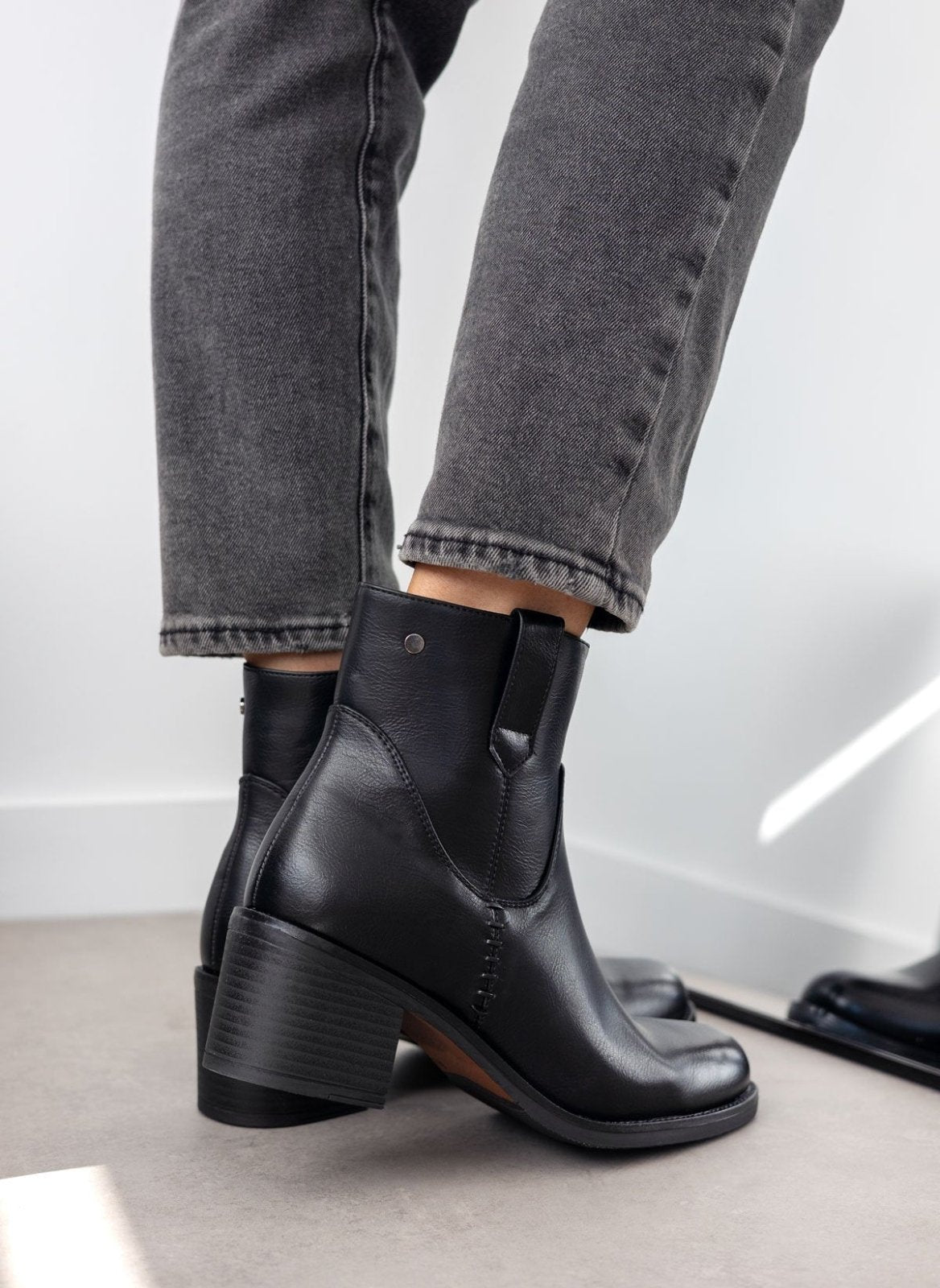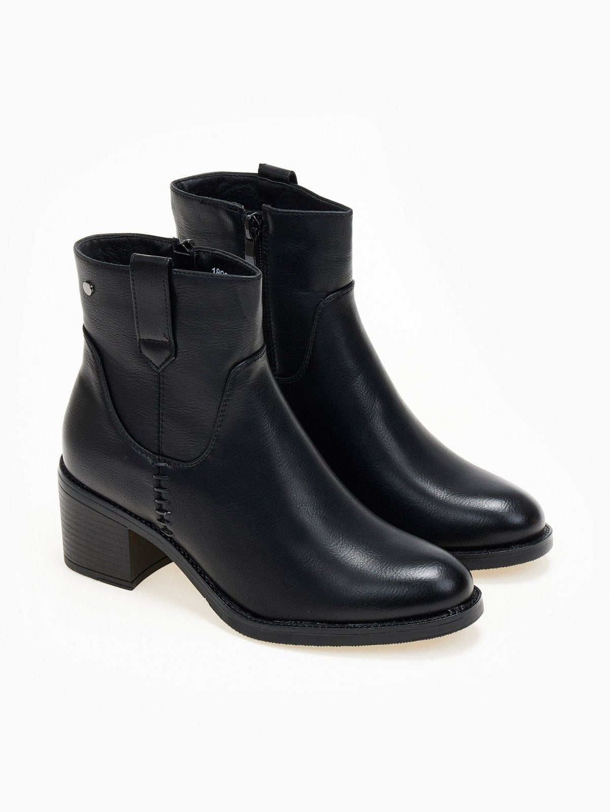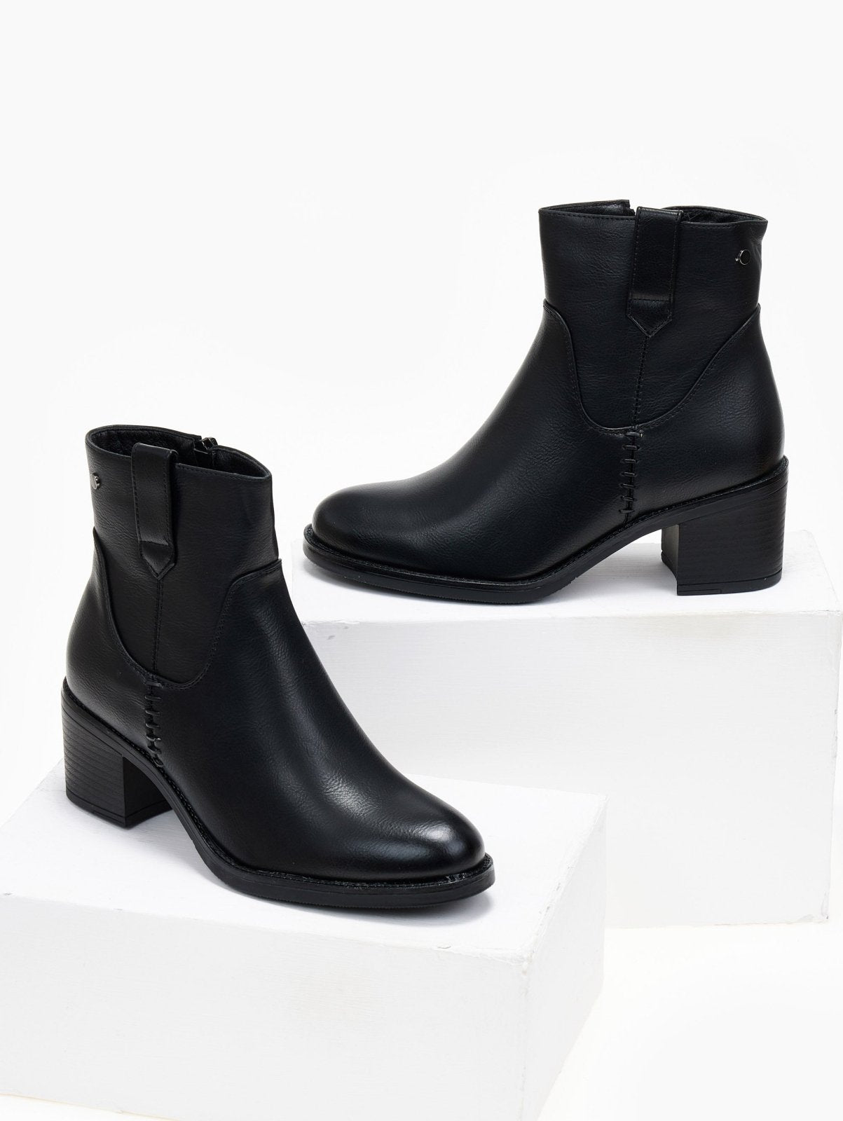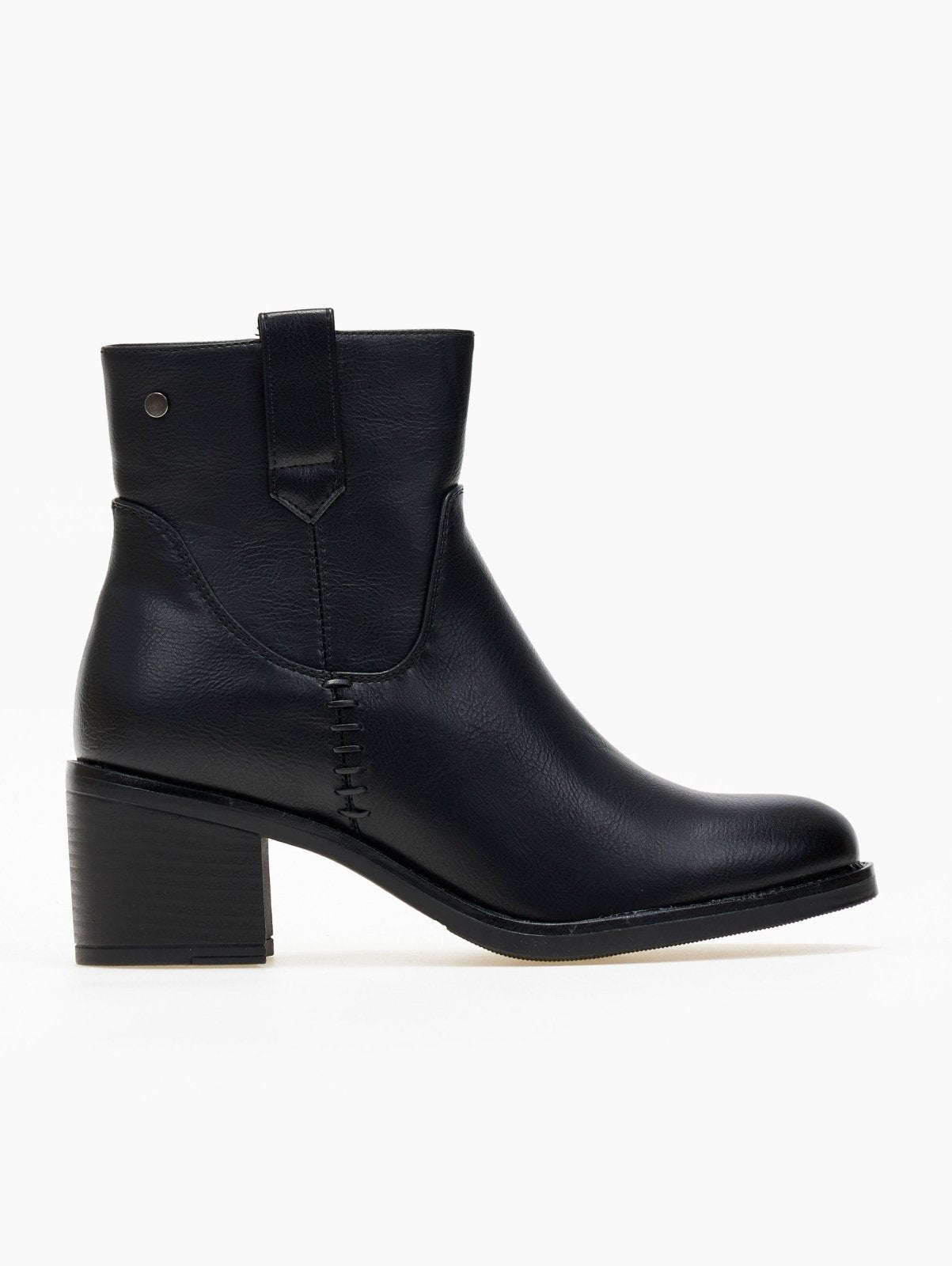 Μποτάκια casual με χαμηλό τετράγωνο τακούνι. Διακριτικό μεταλλικό στοιχείο στο πλάι. Σχέδιο με εξωτερικές ραφές. Θηλάκι στο τελείωμα. Στρογγυλή γραμμή.