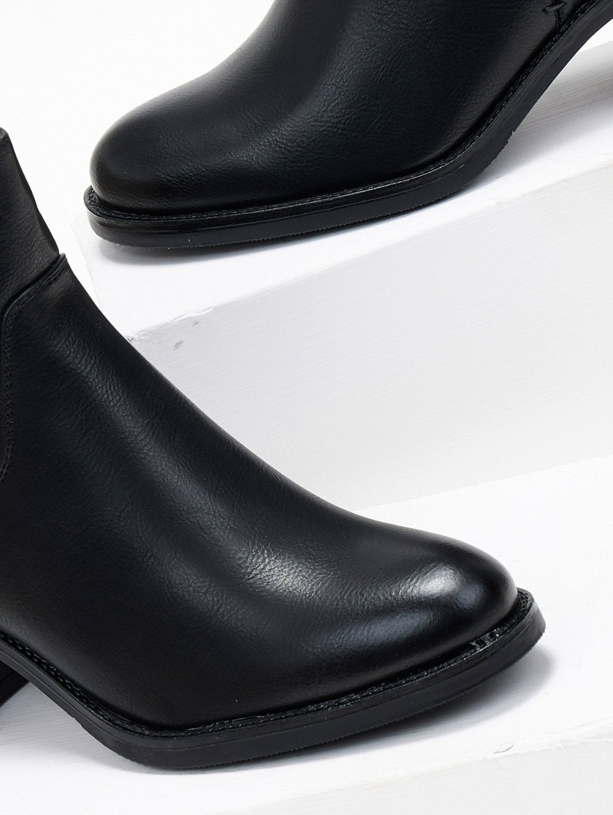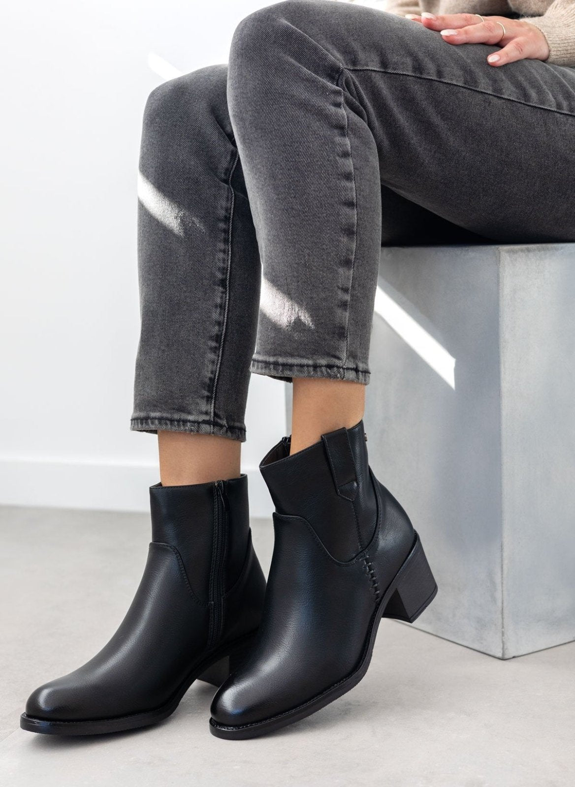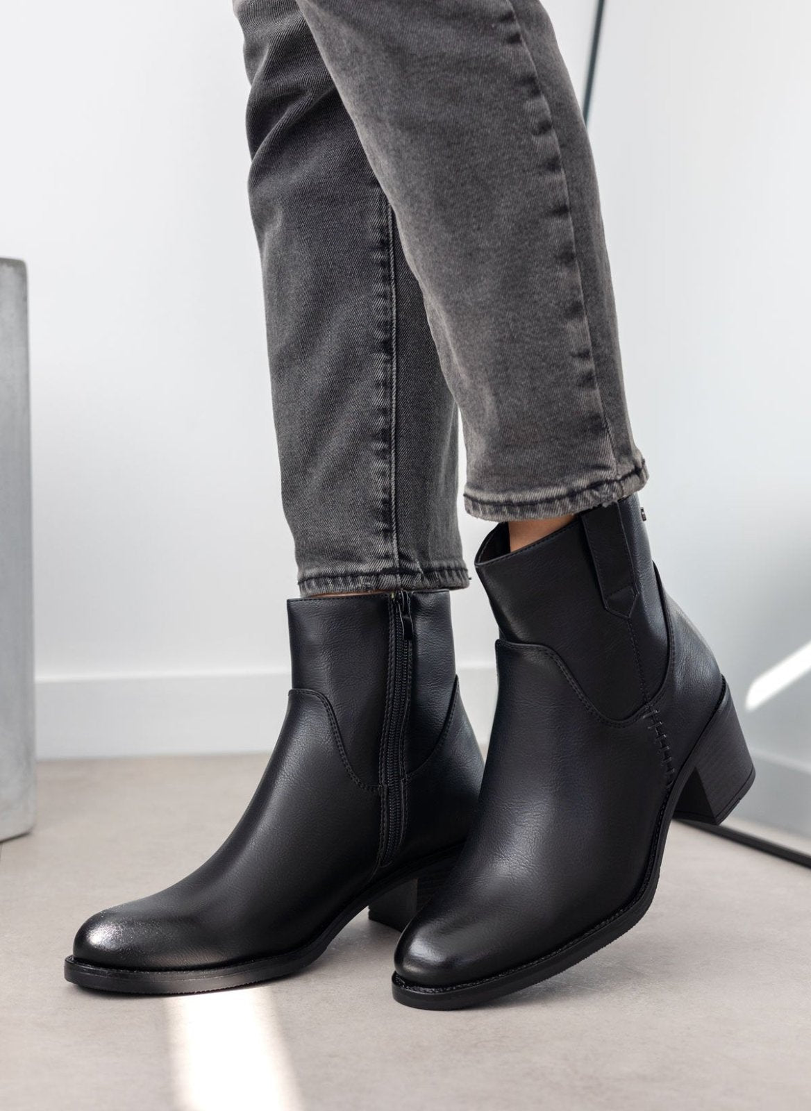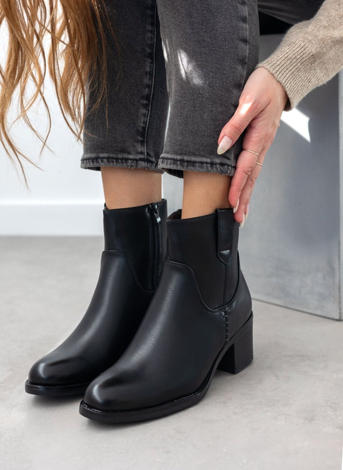 Μποτάκια casual με χαμηλό τετράγωνο τακούνι. Διακριτικό μεταλλικό στοιχείο στο πλάι. Σχέδιο με εξωτερικές ραφές. Θηλάκι στο τελείωμα. Στρογγυλή γραμμή.