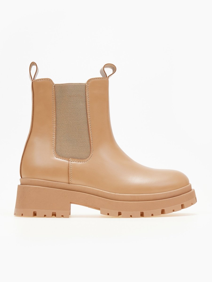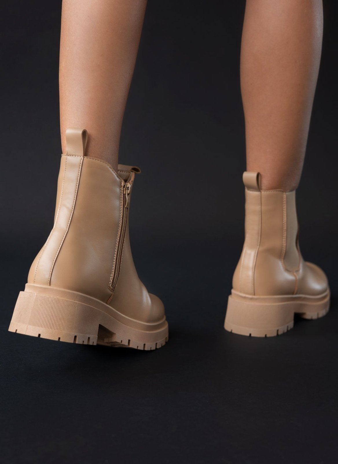 Μποτάκια chelsea με λάστιχο στην εξωτερική τους πλευρά. Έχουν θηλάκια στο τελείωμα. Χοντρός τρακτερωτή σόλα. Κλείνουν με φερμουάρ.