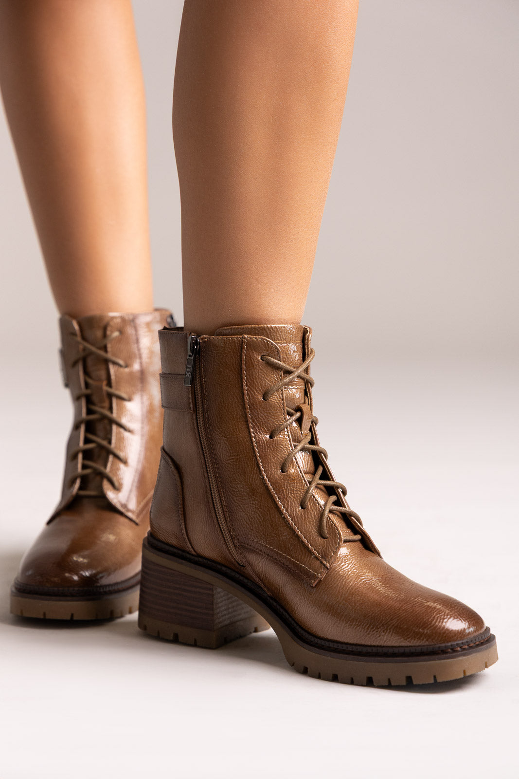 Xti δερμάτινες lace-up combat μπότες με πλαϊνό φερμουάρ και λουράκι με αγκράφα. Εσωτερικός πάτος Comfort Biotech suede με memory foam. PETA-Approved Vegan—σχεδιασμένες για καθημερινό στυλ.