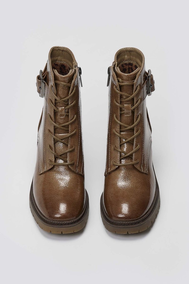 Xti δερμάτινες lace-up combat μπότες με πλαϊνό φερμουάρ και λουράκι με αγκράφα. Εσωτερικός πάτος Comfort Biotech suede με memory foam. PETA-Approved Vegan—σχεδιασμένες για καθημερινό στυλ.