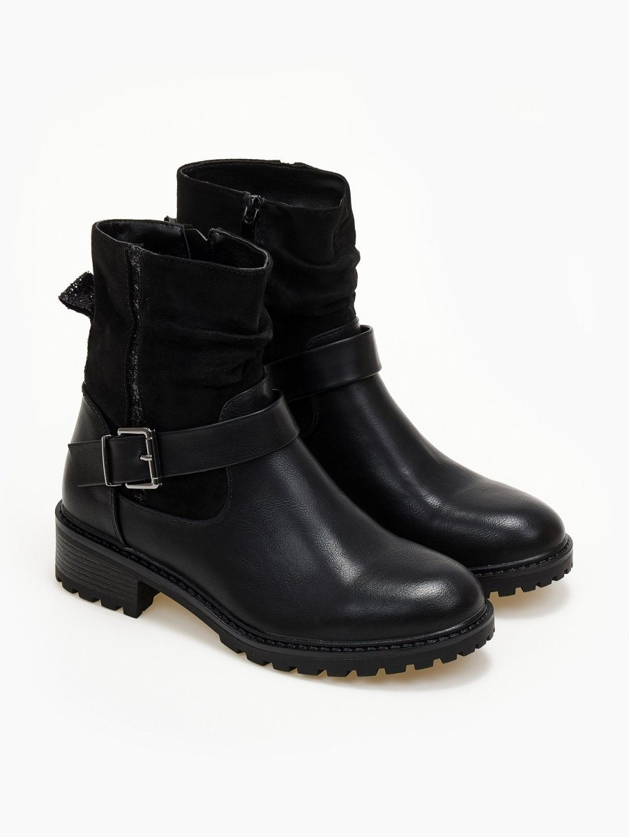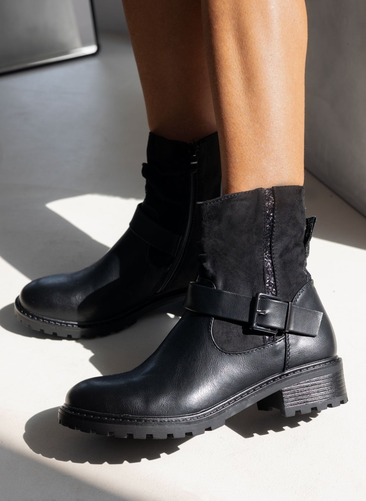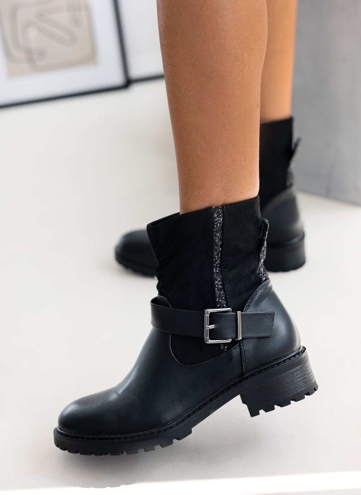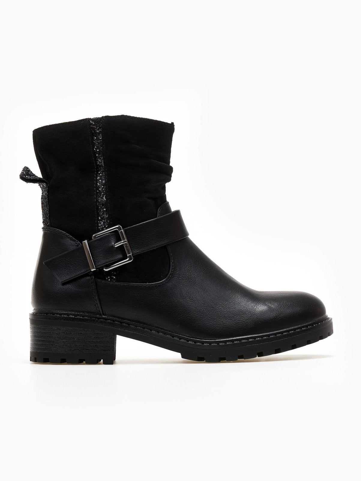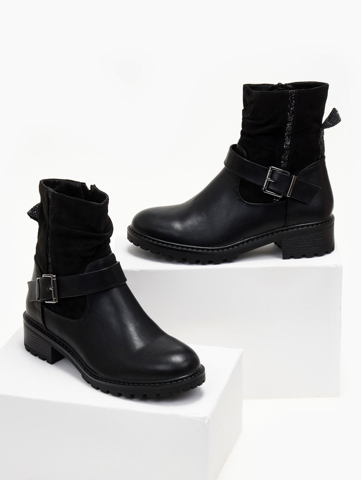 Μποτάκια με λεπτομέρεια glitter ρίγα και θηλάκι ERYNN. Στρογγυλή γραμμή. Τρακτερωτή σόλα. Συνδυάζουν τεχνόδερμα και σουέντ. Διακοσμητικό ζωνάκι στο ύψος του κουτεπιέ. Κλείνουν με φερμουάρ στην εσωτερική τους πλευρά.