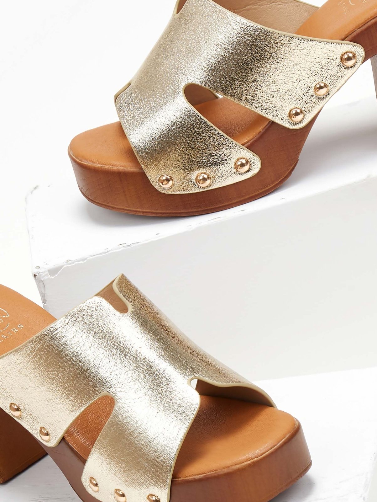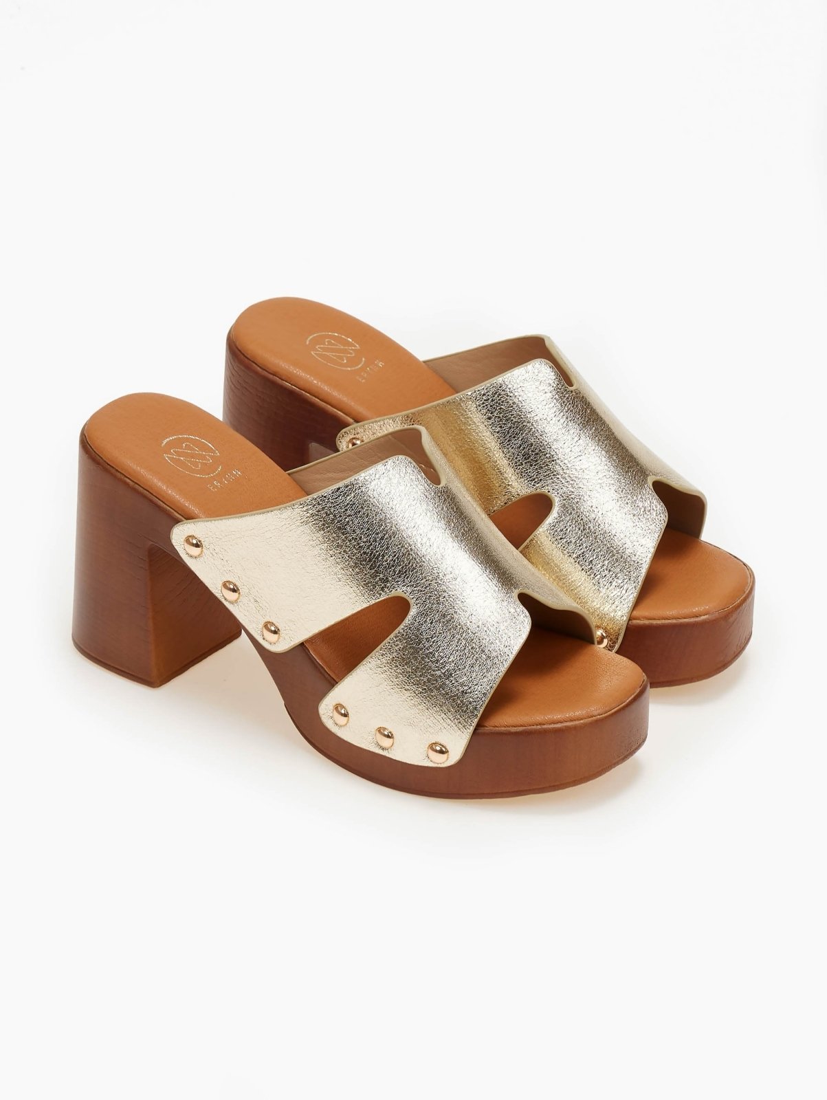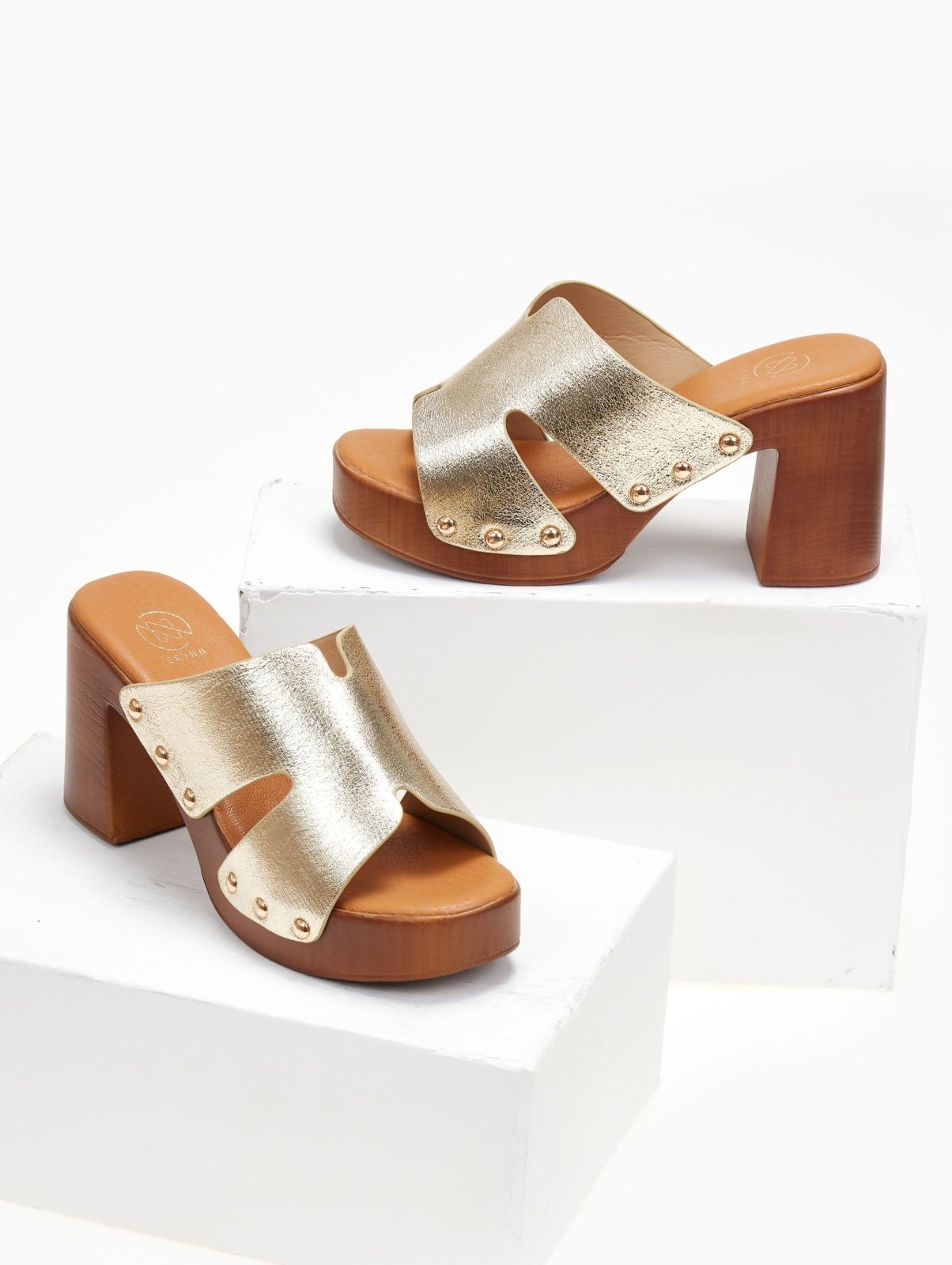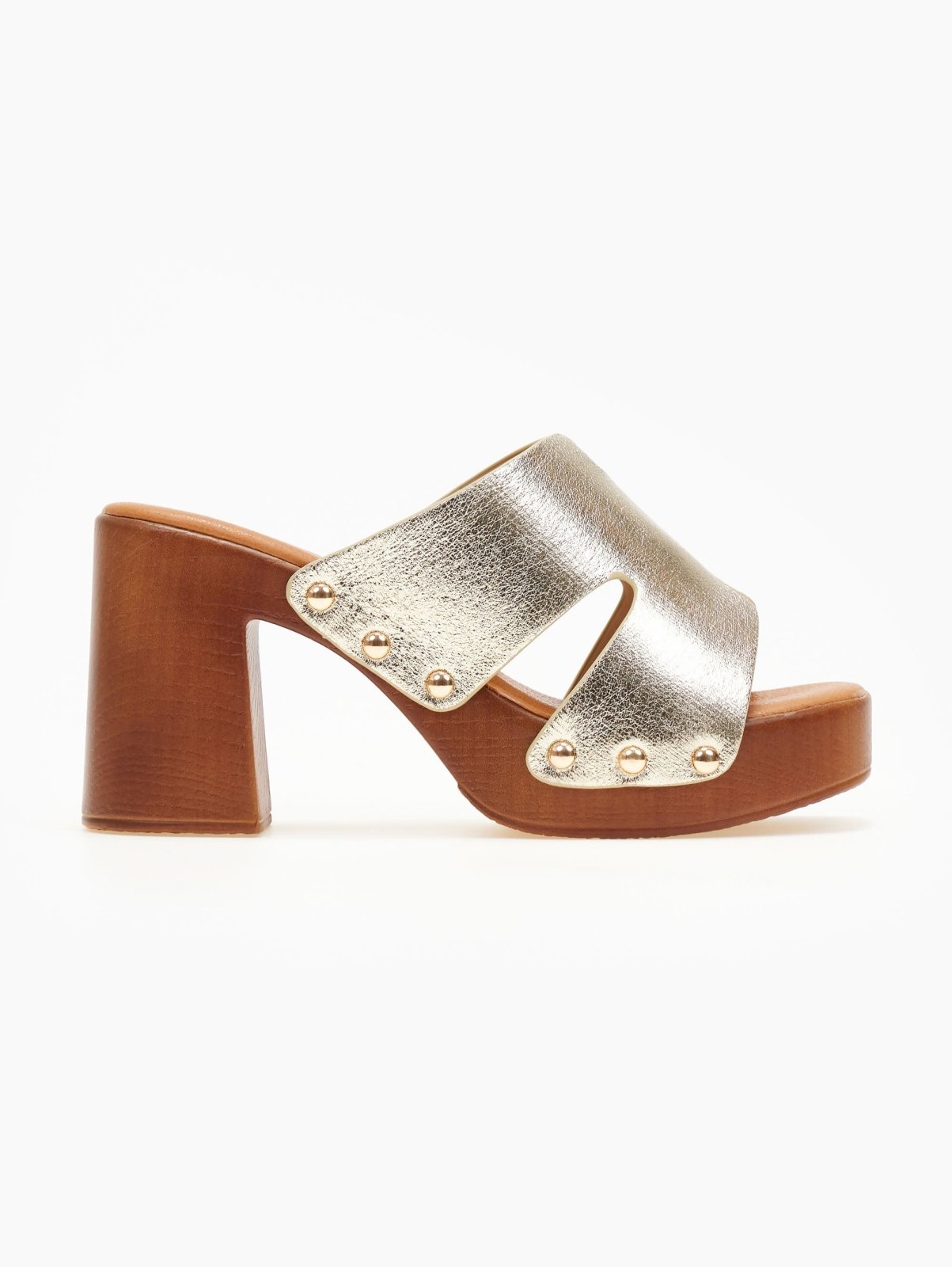 Mules ανοιχτά ERYNN. Φαρδιά φάσα με ανοίγματα στο πλάι. Τρουκς σε μεταλλικό χρώμα στα πλαϊνά. Ψηλή σόλα με χοντρό τακούνι.