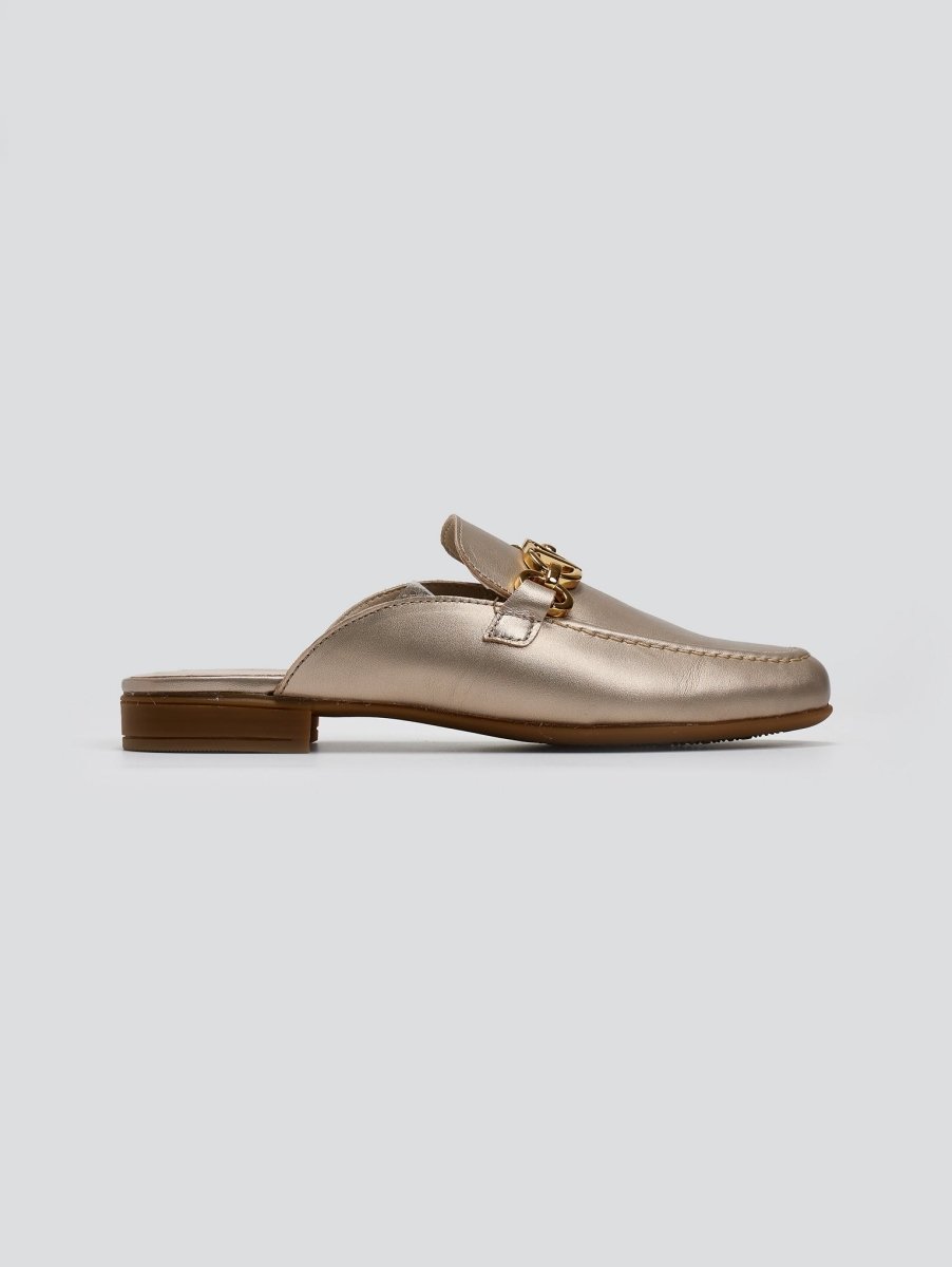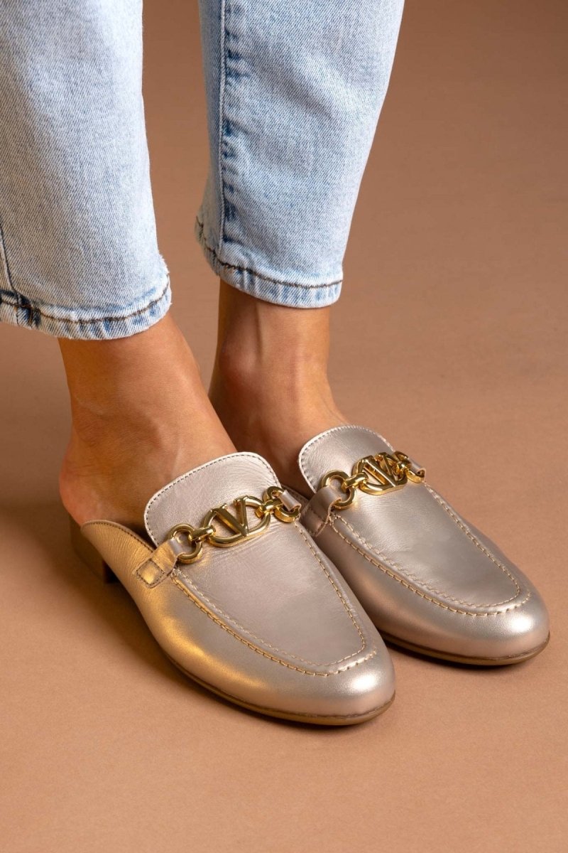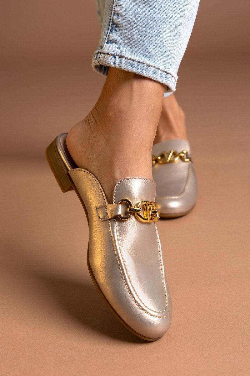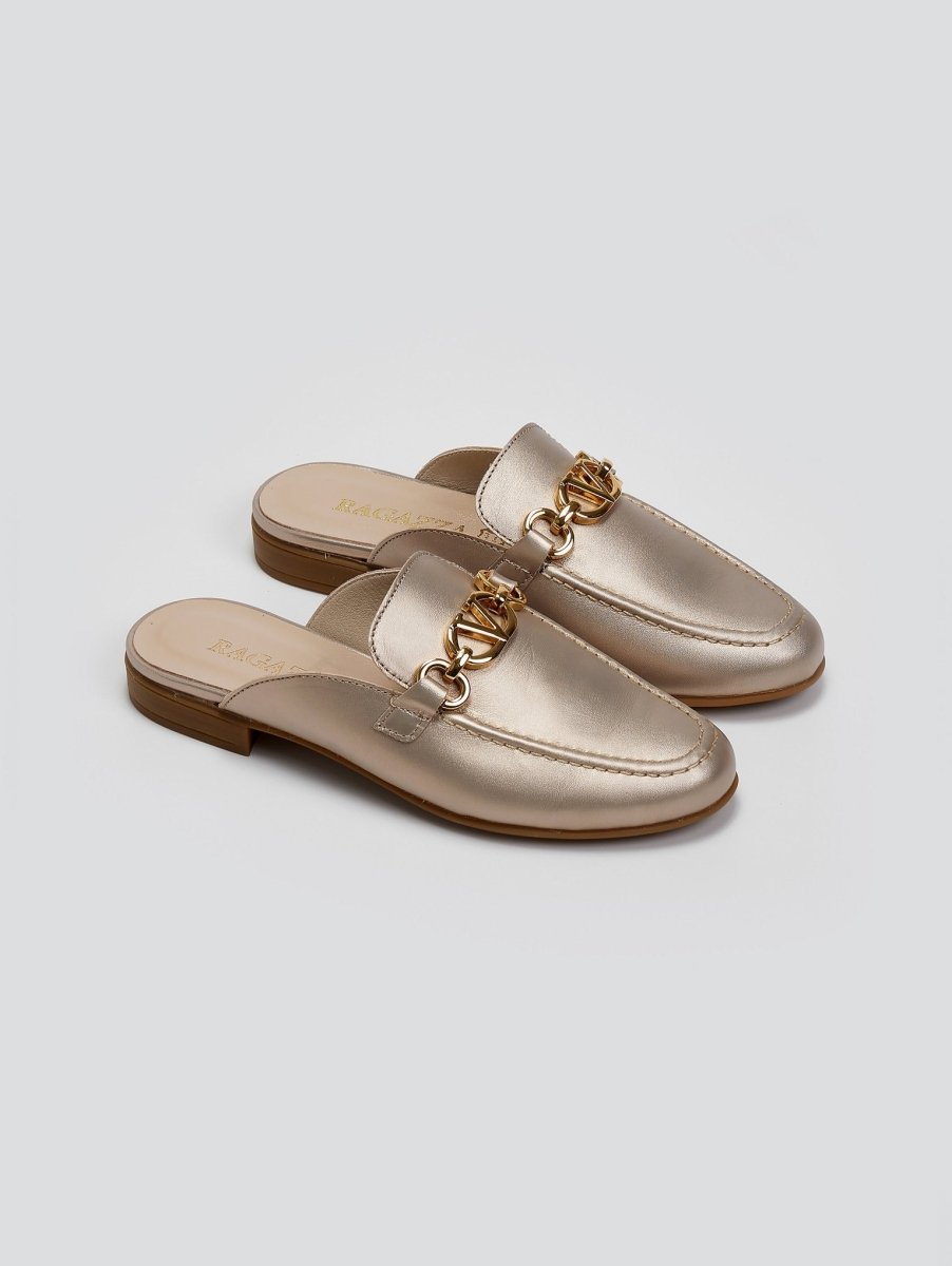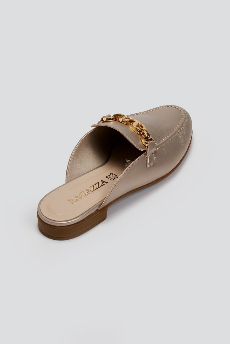 Mules δερμάτινα κλειστά Ragazza. Μεταλλικό διακοσμητικό στο επάνω μέρος. Δερμάτινος πάτος. Comfort μαλακή σόλα από λάστιχο. Ελληνικής κατασκευής.
