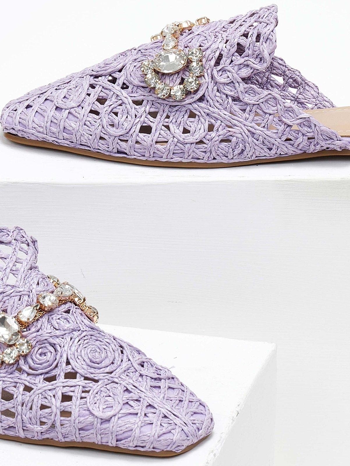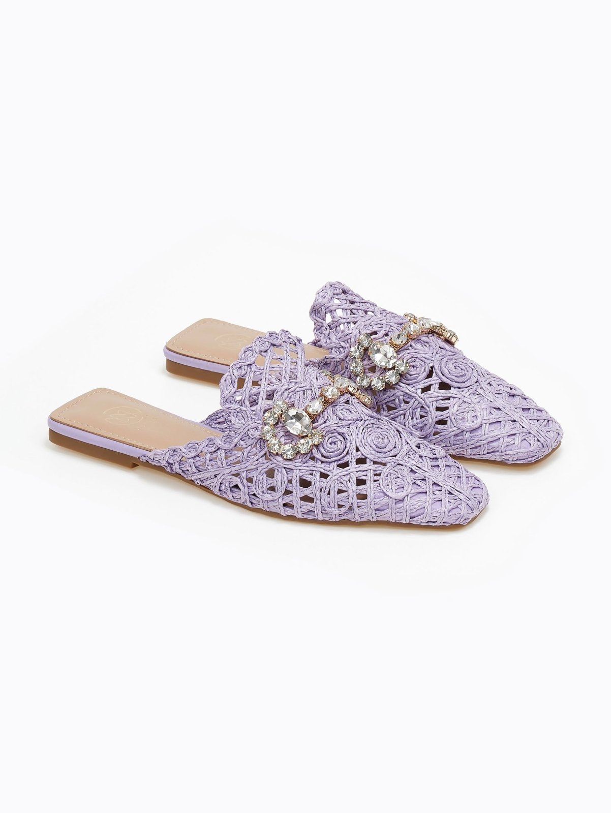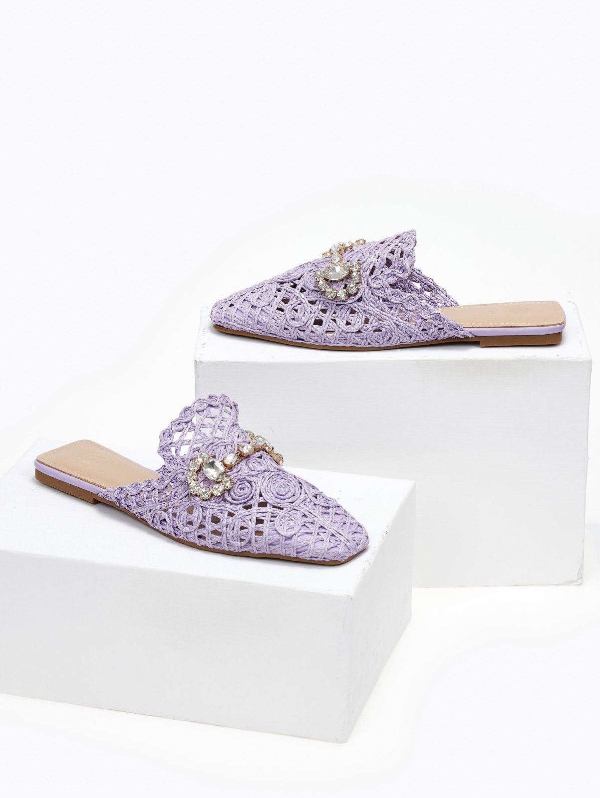 Mules χαμηλά με πλεκτό διάτρητο σχέδιο από ψάθα. έχει διακοσμητικό στοιχείο με πέτρες. Καρέ γραμμή. Λάστιχο στη σόλα.