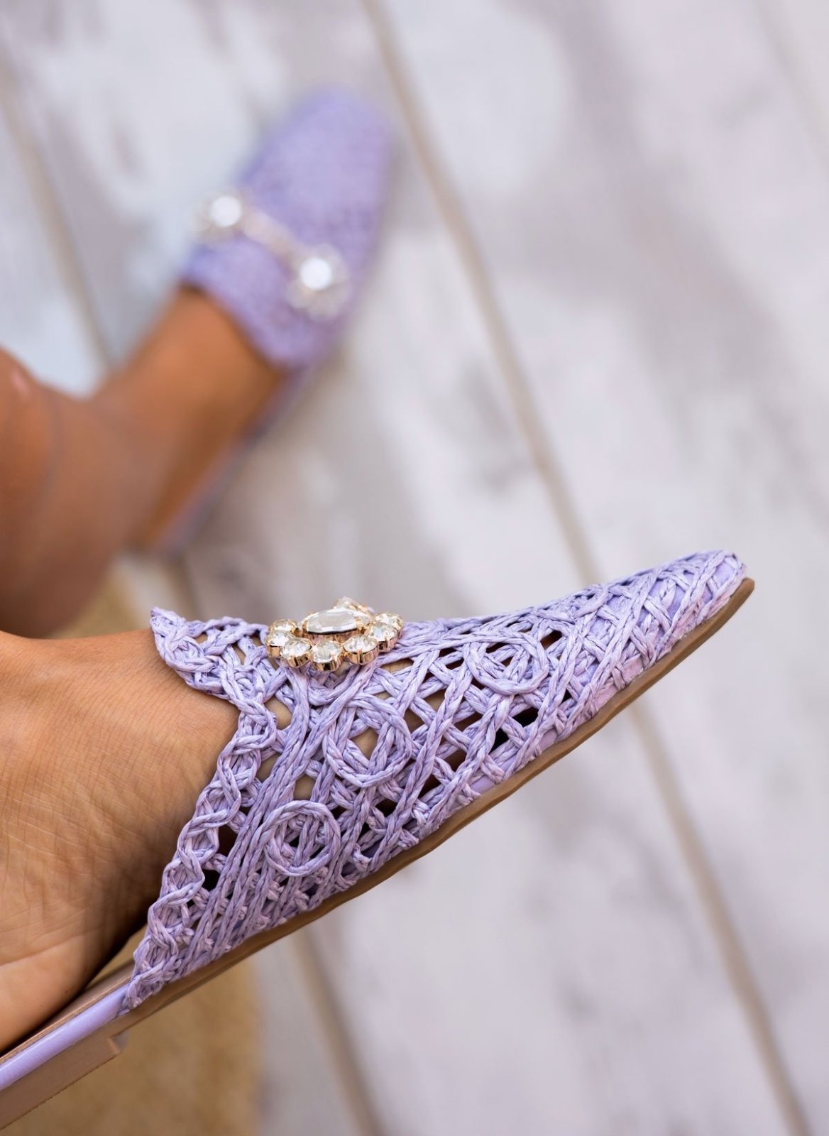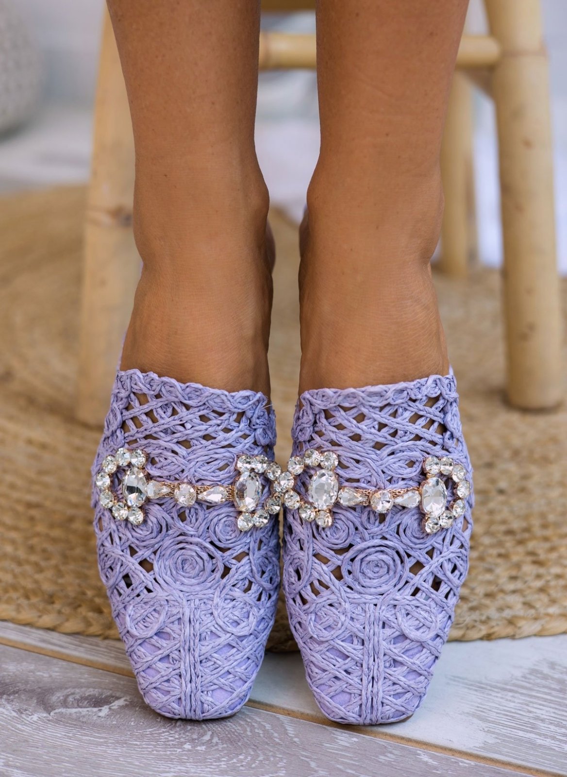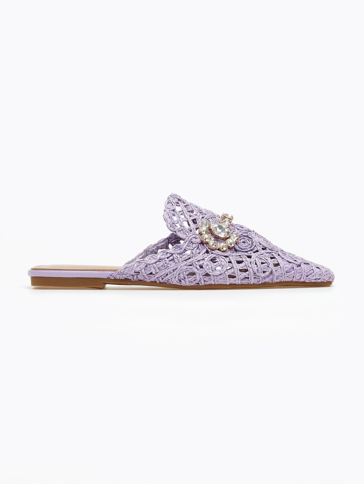 Mules χαμηλά με πλεκτό διάτρητο σχέδιο από ψάθα. έχει διακοσμητικό στοιχείο με πέτρες. Καρέ γραμμή. Λάστιχο στη σόλα.