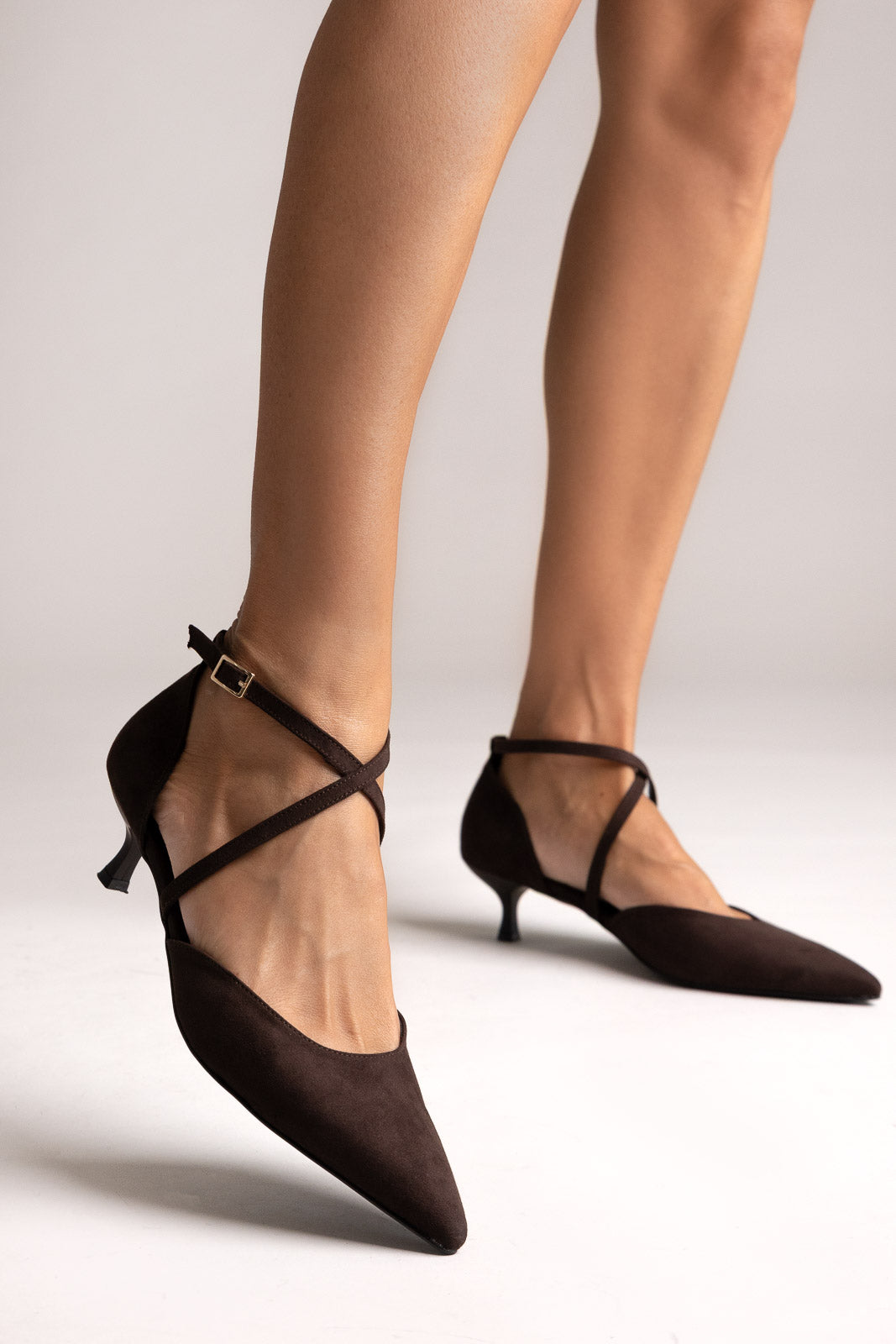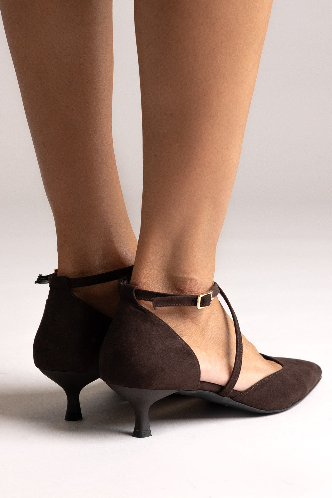 Σουέτ μυτερές γόβες με πλαϊνά κοψίματα, χιαστί λουράκια και χαμηλό τακούνι kitten. Μια εκλεπτυσμένη ισορροπία κομψότητας, άνεσης και σύγχρονης φινέτσας.