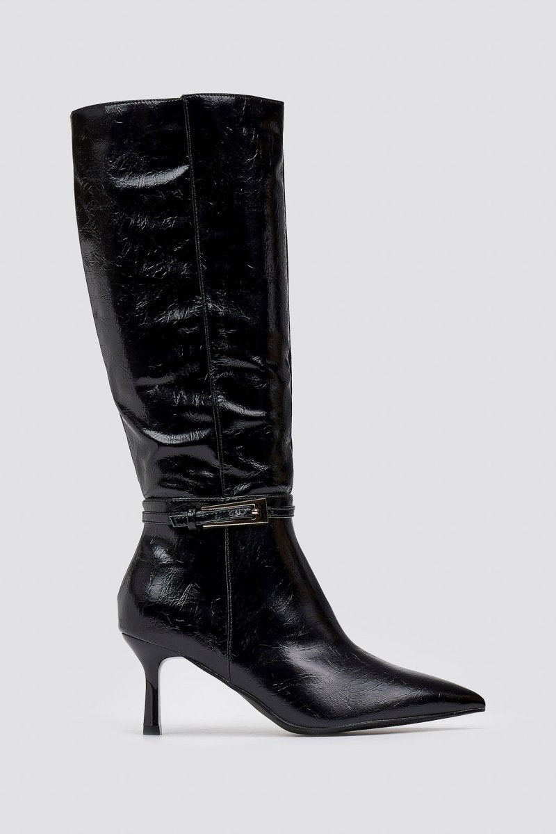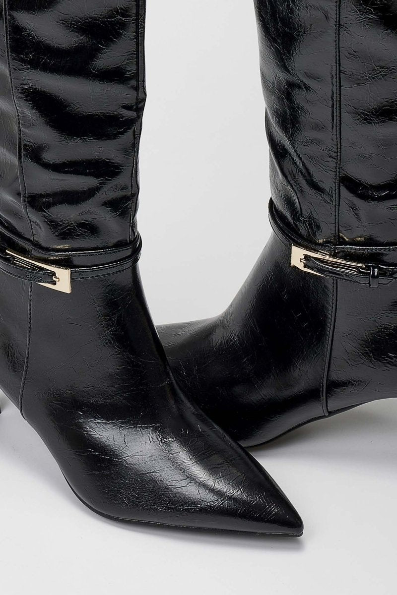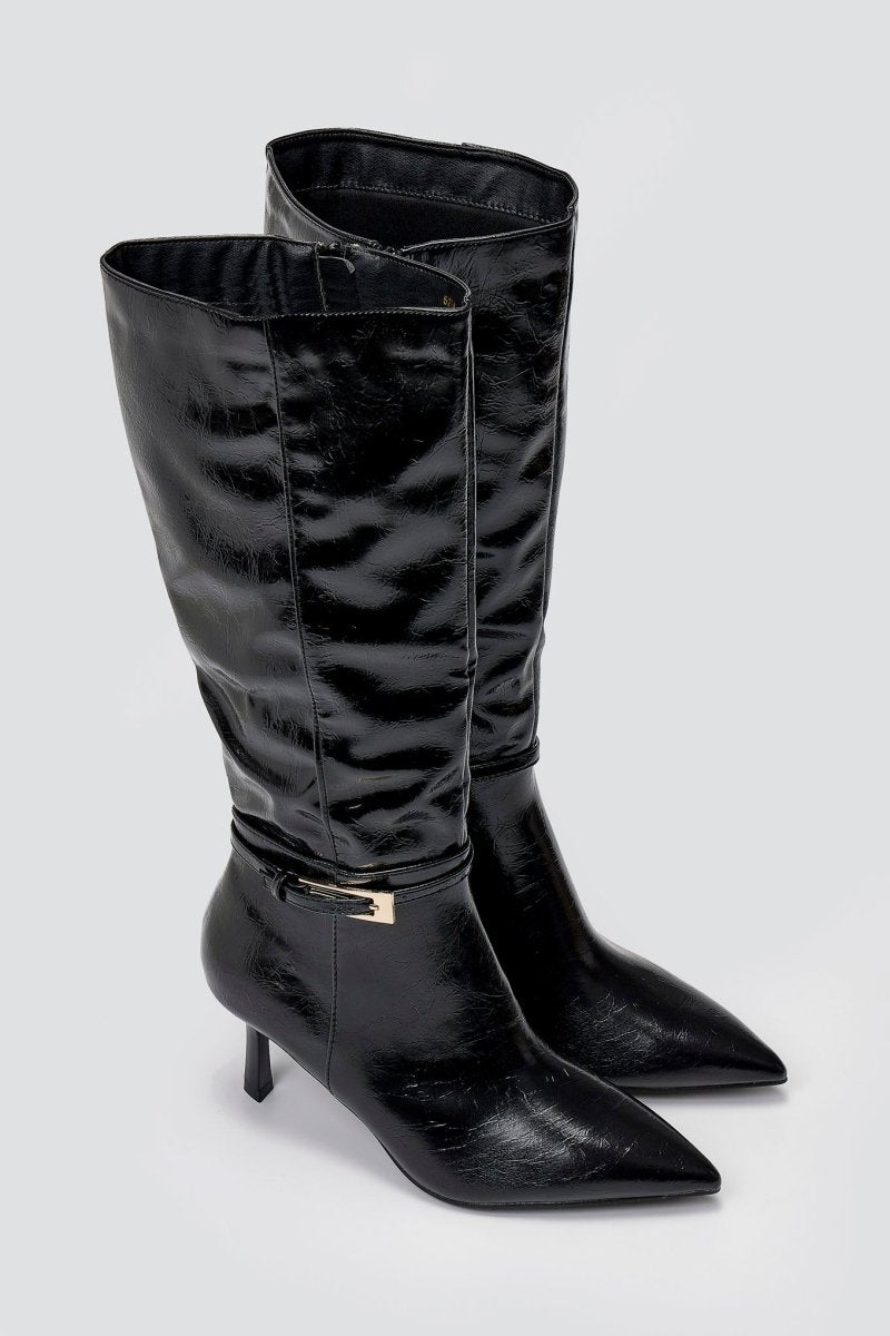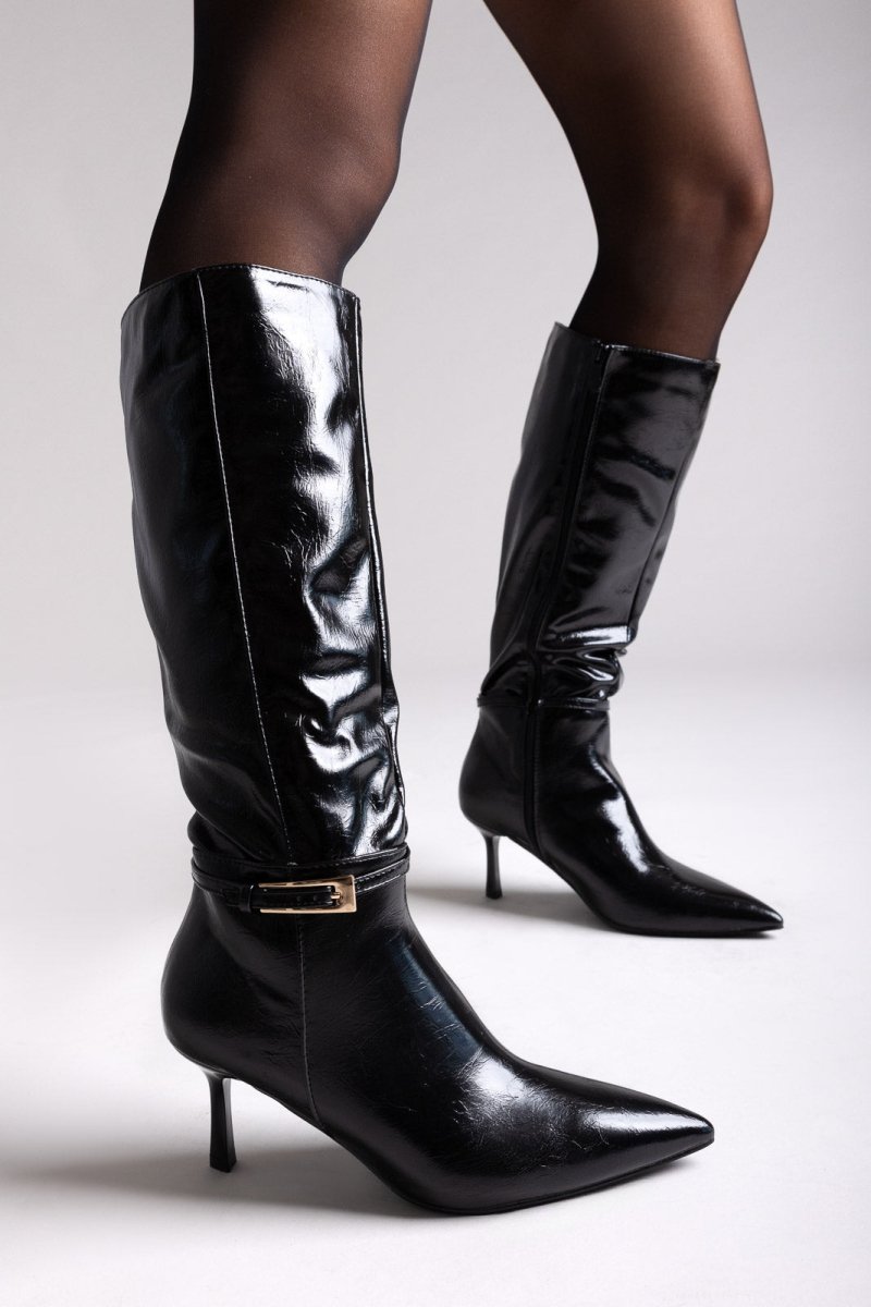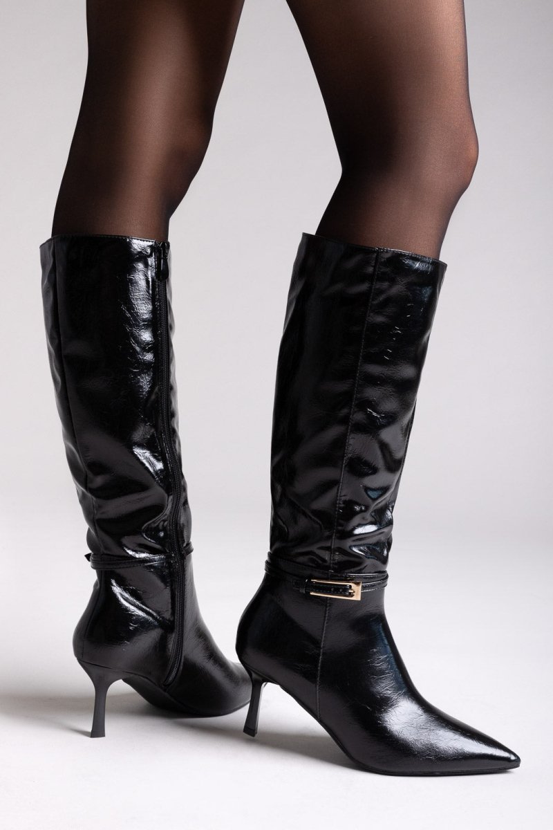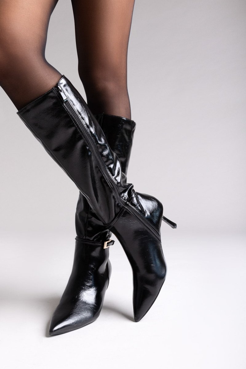 Μυτερά μποτάκια με λεπτό λουράκι με αγκράφα, τακούνι στιλέτο και πλαϊνό φερμουάρ. Μια κομψή σιλουέτα που συνδυάζει την κομψότητα με μοντέρνες λεπτομέρειες.