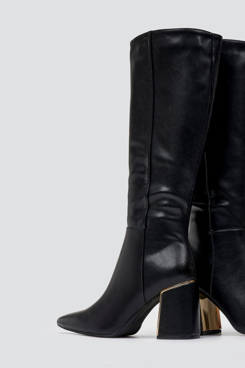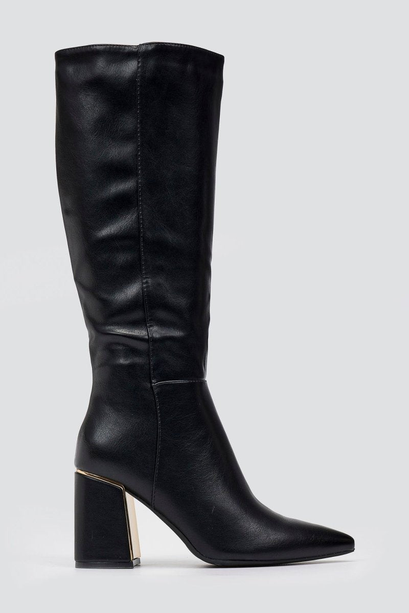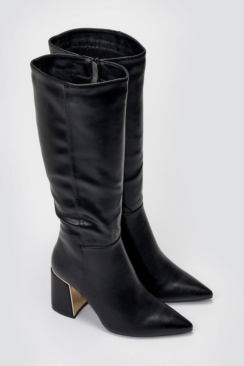 Μυτερά μποτάκια με χοντρό τακούνι block, μεταλλική λεπτομέρεια και φερμουάρ στο πλάι. Ένας τολμηρός αλλά κομψός σχεδιασμός για μοντέρνο στυλ