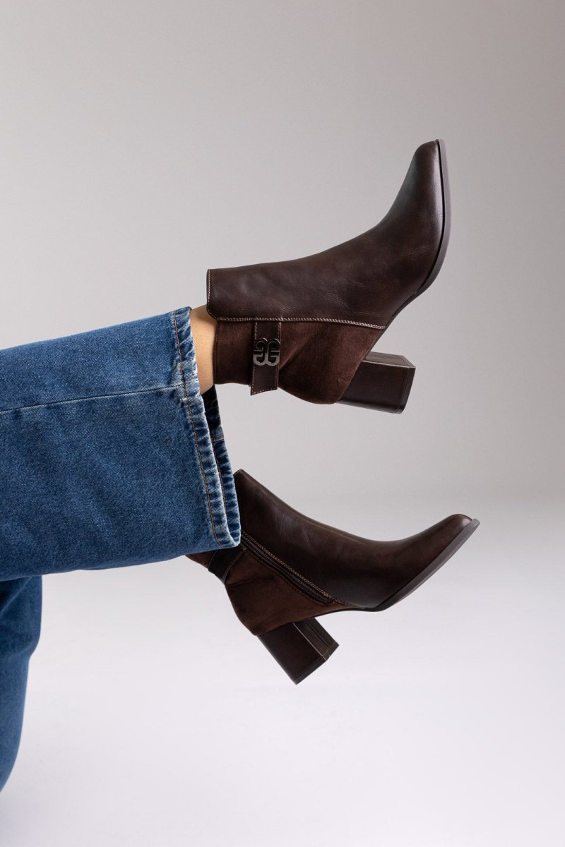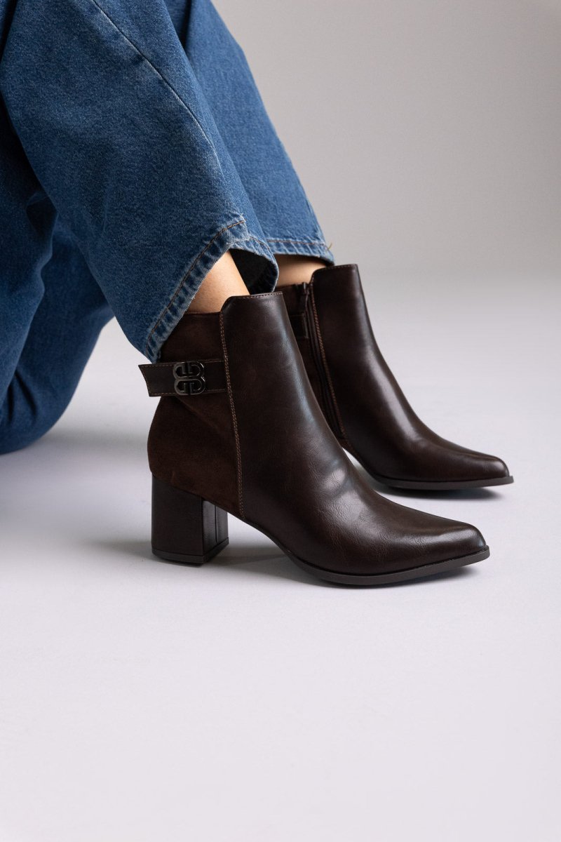 Μυτερά μποτάκια που συνδυάζουν σουέτ και συνθετικό δέρμα με χαμηλό τετράγωνο τακούνι, πλαϊνό φερμουάρ και μεταλλική λεπτομέρεια. Κομψό καθημερινό σχέδιο.
