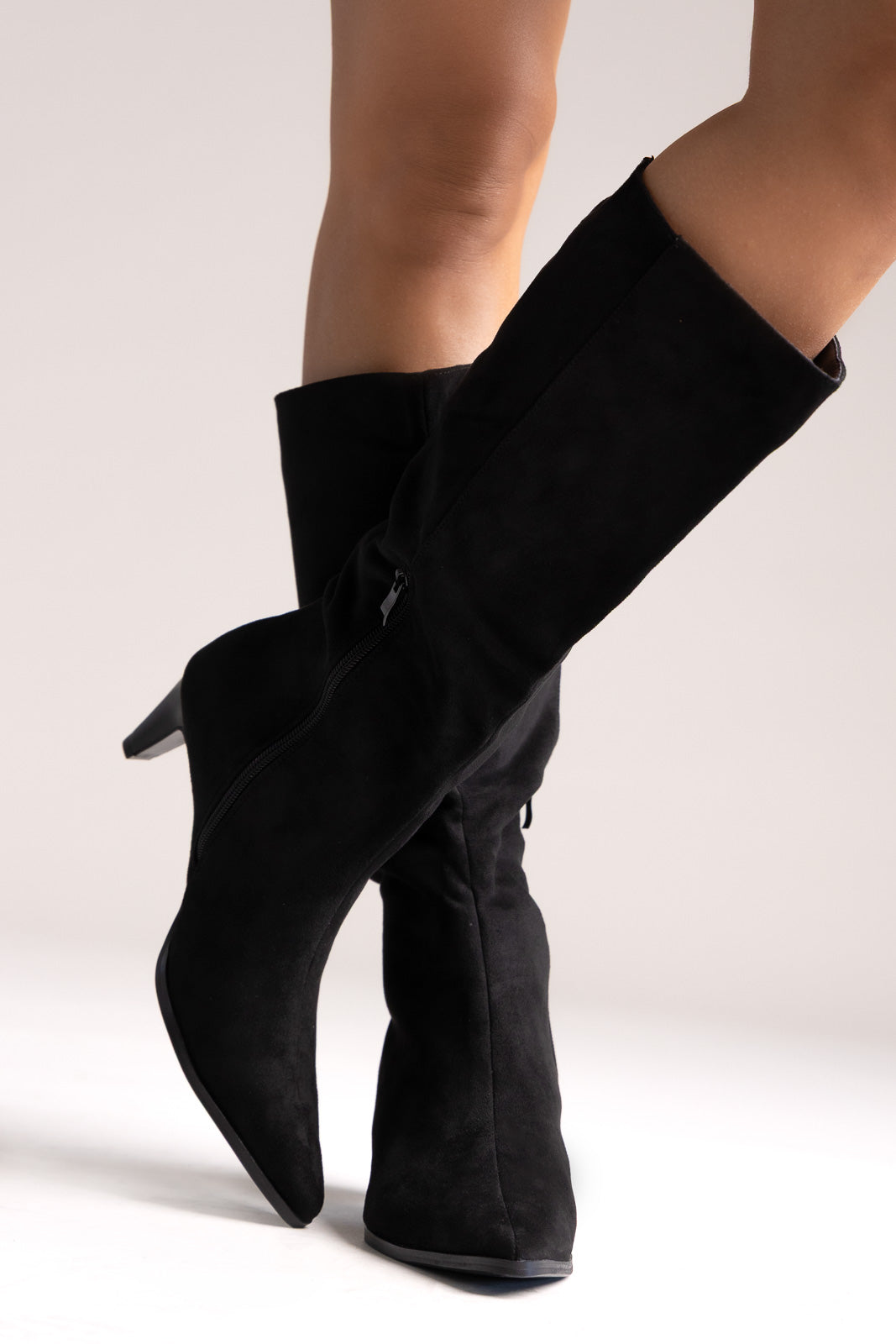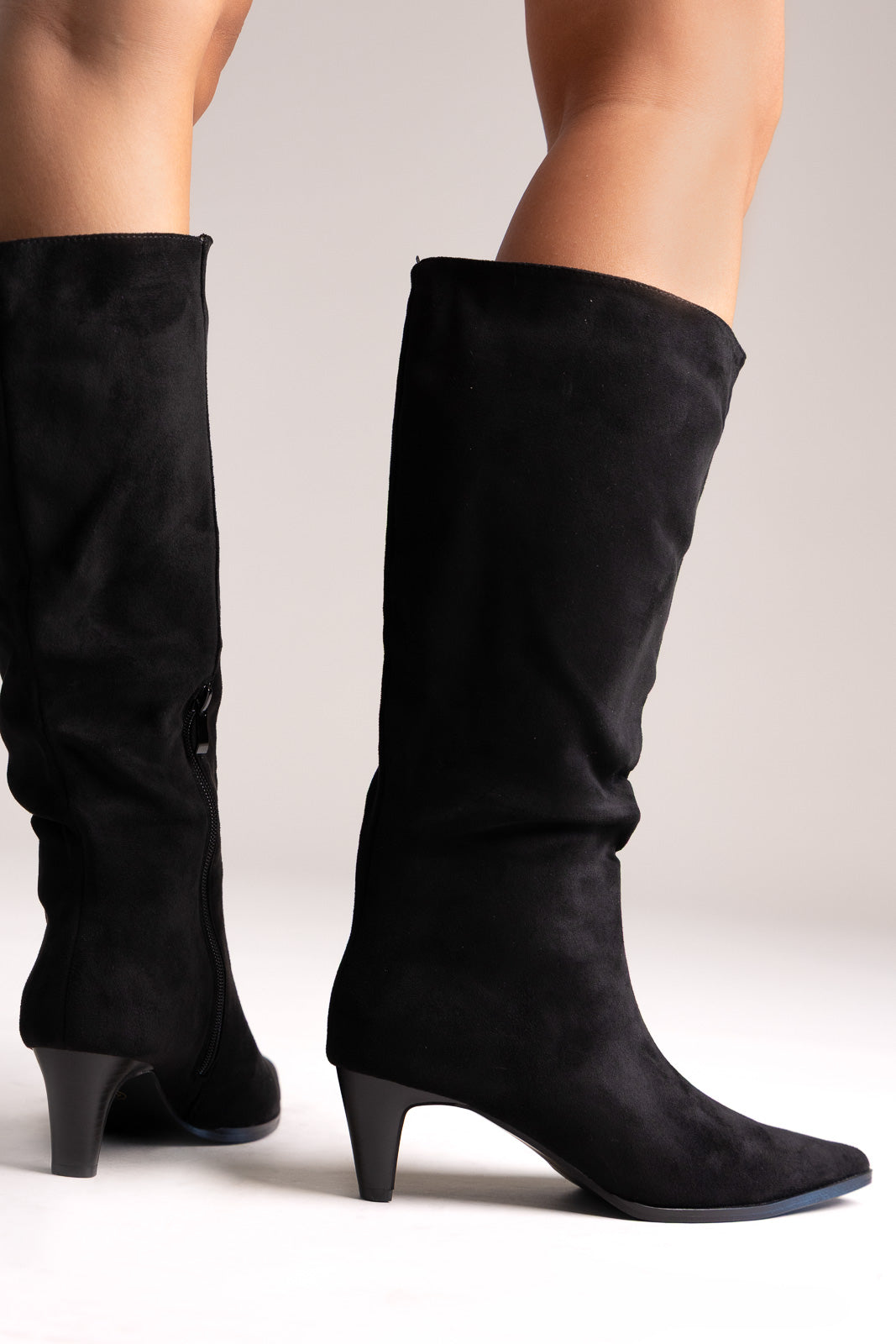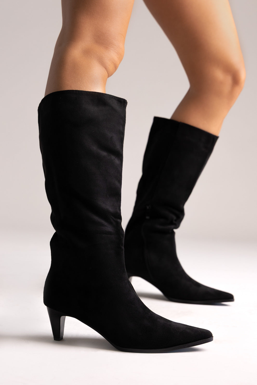 Μυτερές σουέτ μπότες με λεπτό τακούνι kitten και πλαϊνό φερμουάρ. Η απαλή υφή του σουέτ προσφέρει εκλεπτυσμένη κομψότητα στις καθημερινές εμφανίσεις.