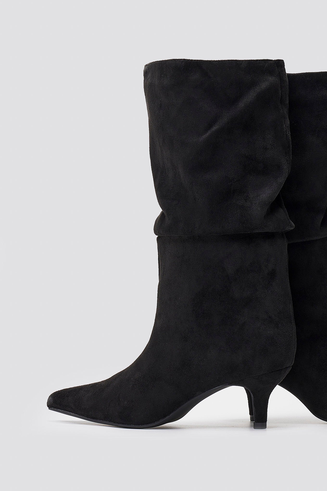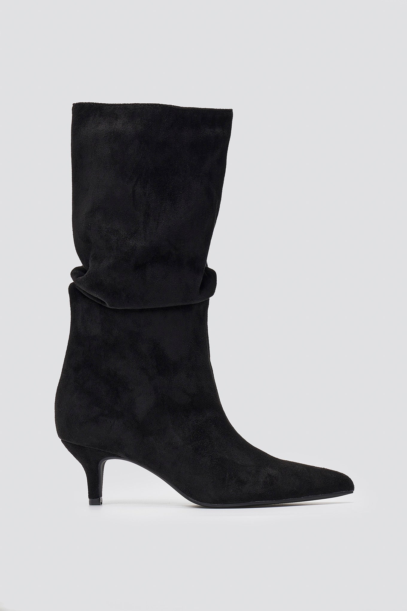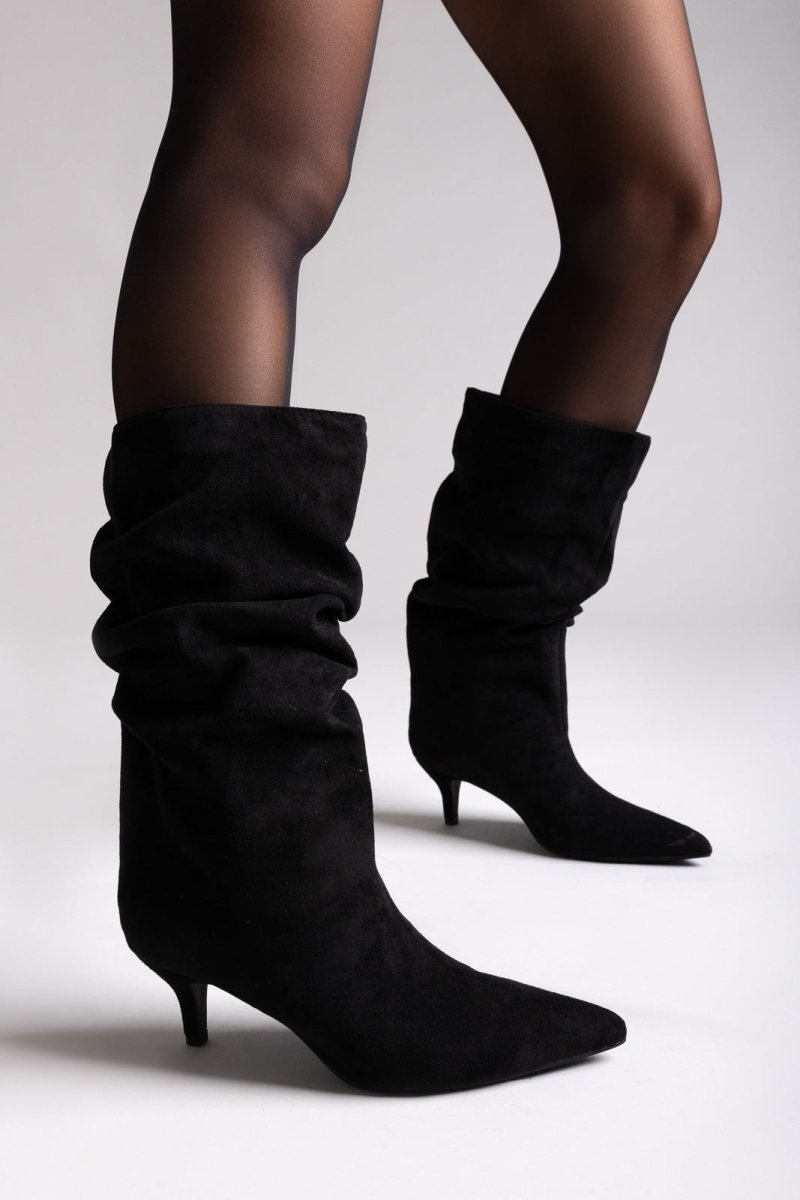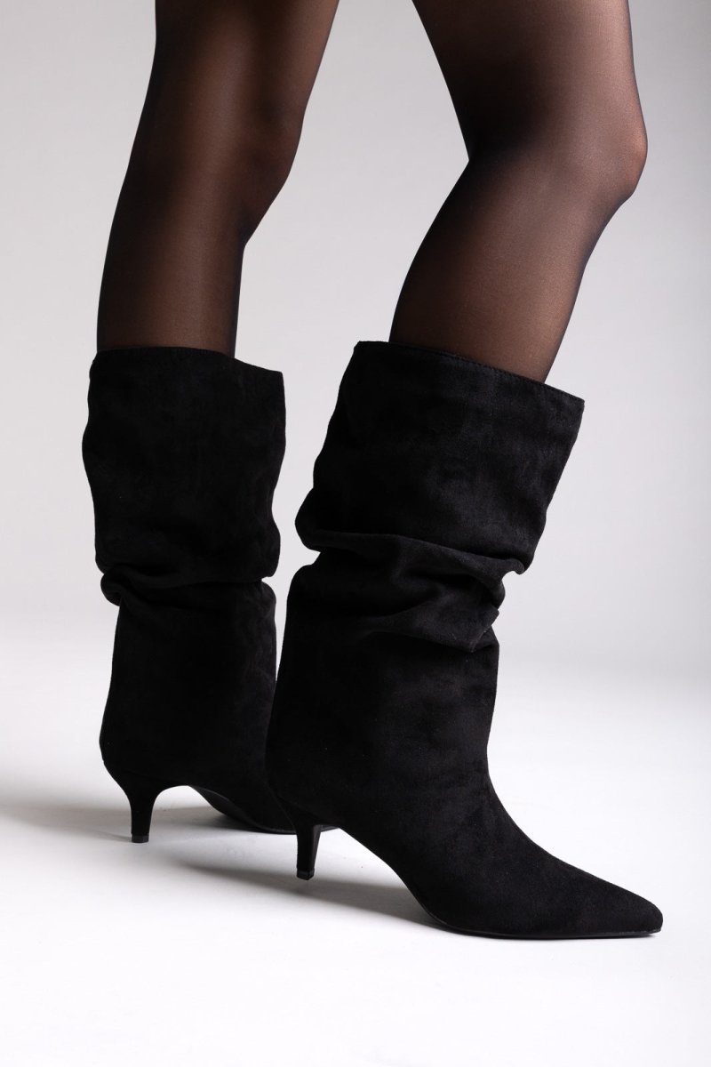 Μυτερές μπότες slouch από σουέτ με απαλή υφή, χαμηλό τακούνι kitten και μήκος μέχρι τη μέση της γάμπας. Κομψός σχεδιασμός με εκλεπτυσμένη εφαρμογή.