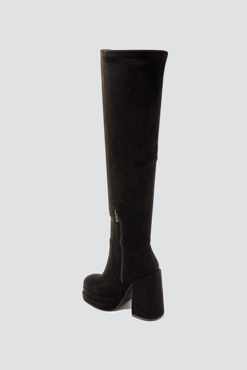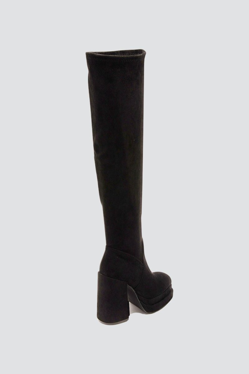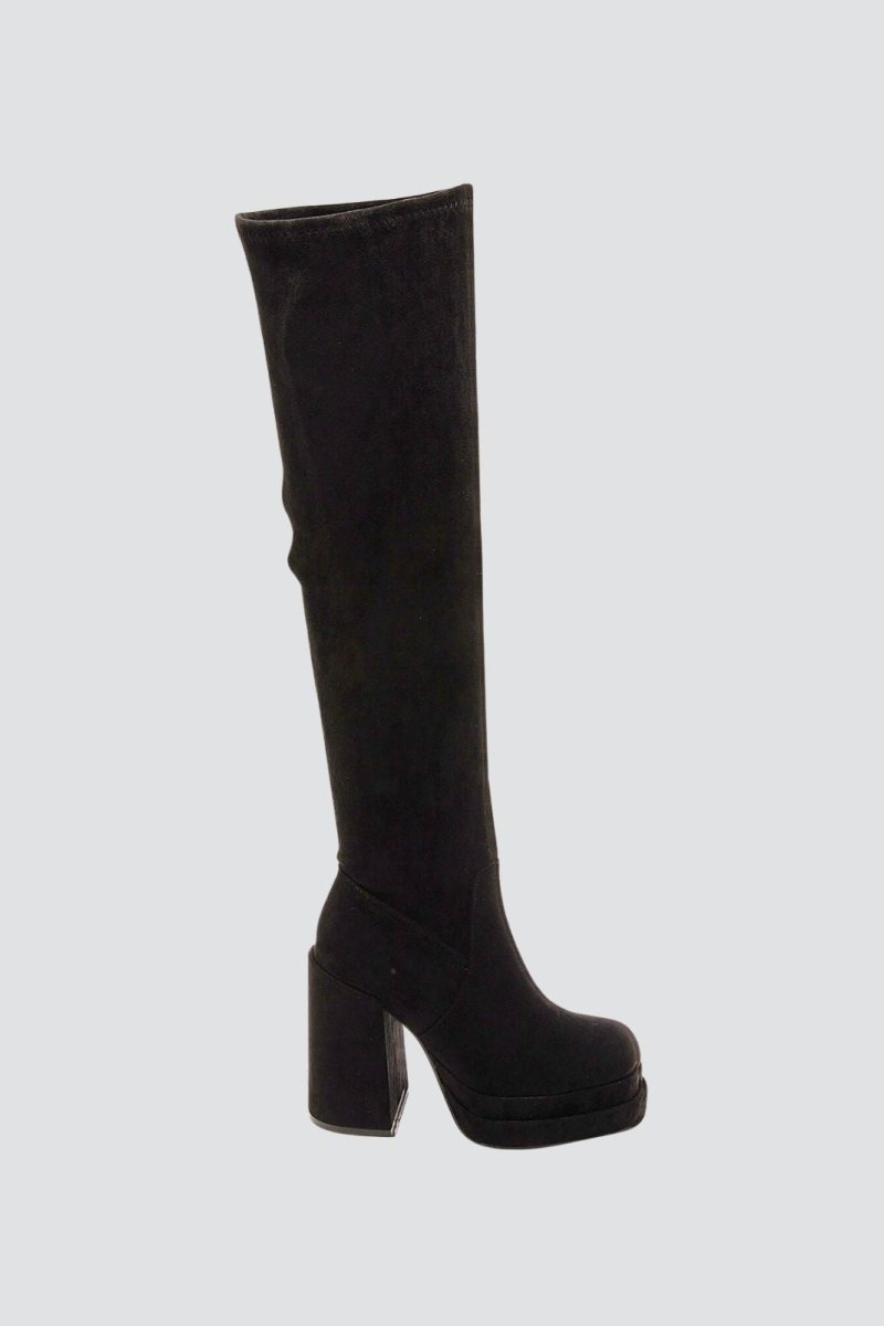Μπότες πάνω από το γόνατο από ελαστικό σουέτ με πλατφόρμα, ψηλό τακούνι και φερμουάρ στο πλάι. Η εφαρμοστή γραμμή και η απαλή υφή συνδυάζουν κομψό στυλ με αυτοπεποίθηση και άνεση.