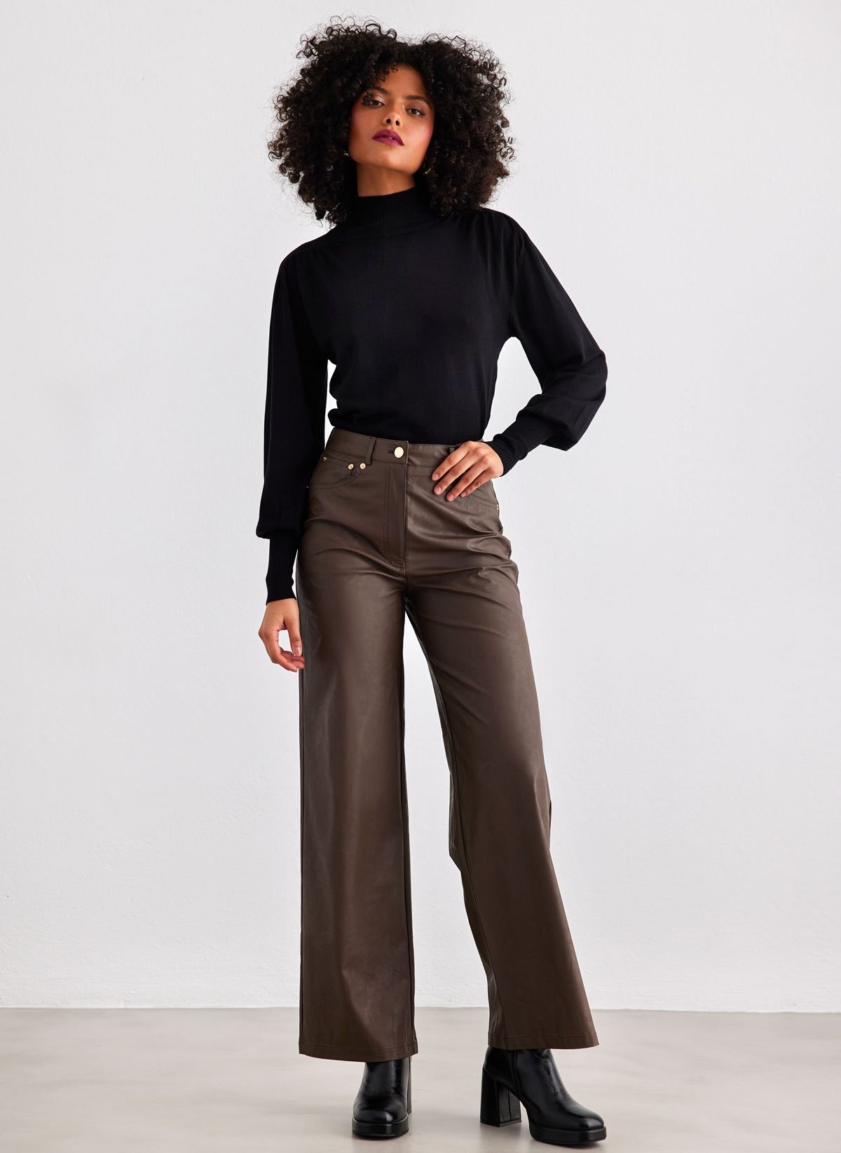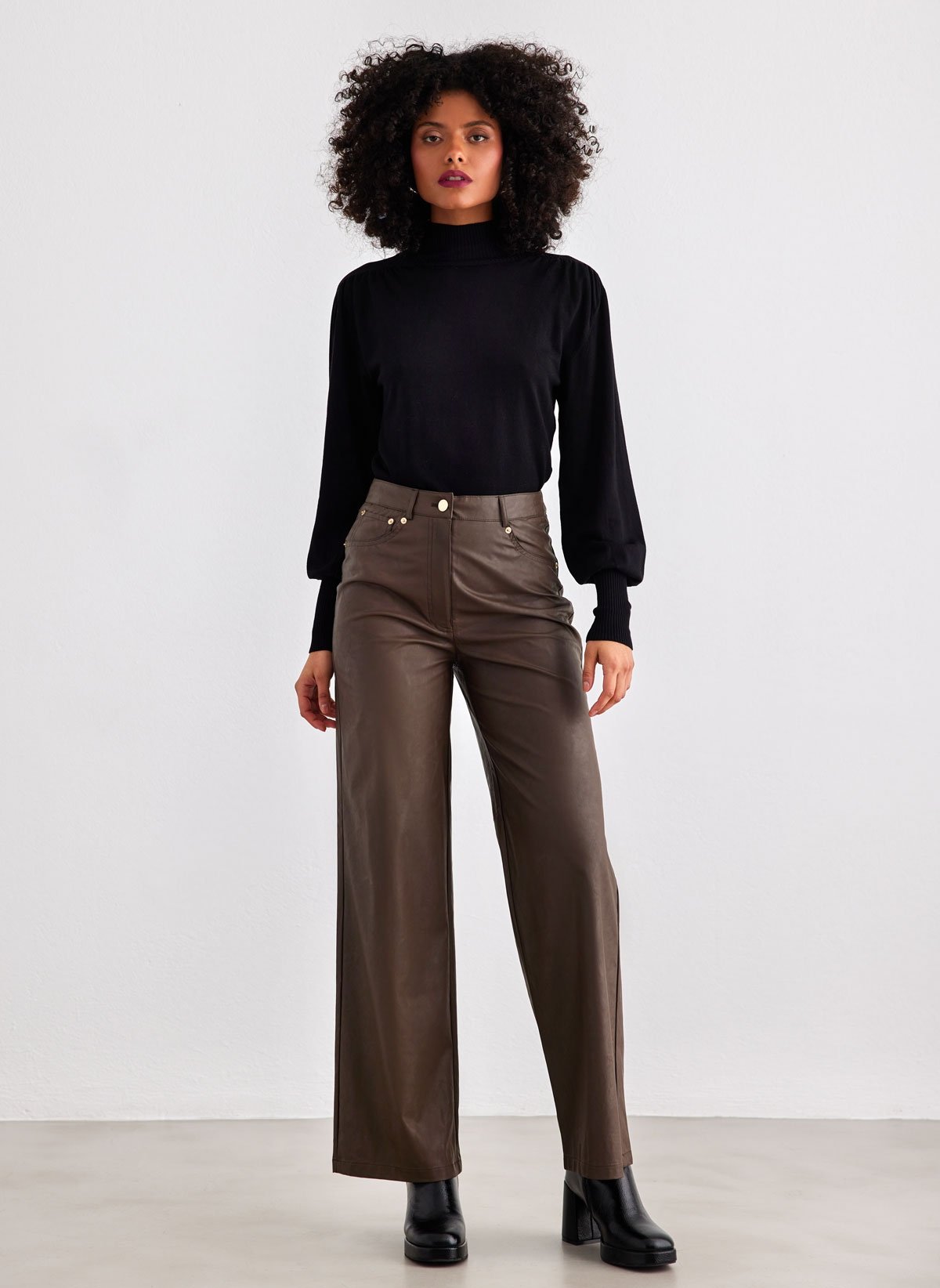 Παντελόνι ψηλόμεσο δερματίνη ΜΟΝΟ. Wide leg γραμμή με τσέπες στο πλάι και το πίσω μέρος. Κλείνει με φερμουάρ και κουμπί.