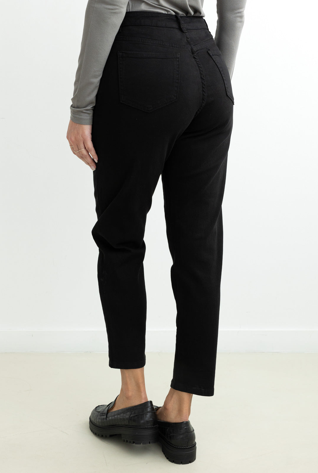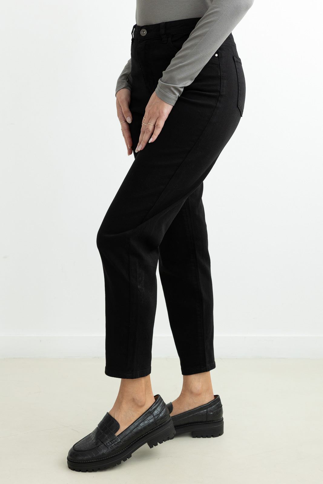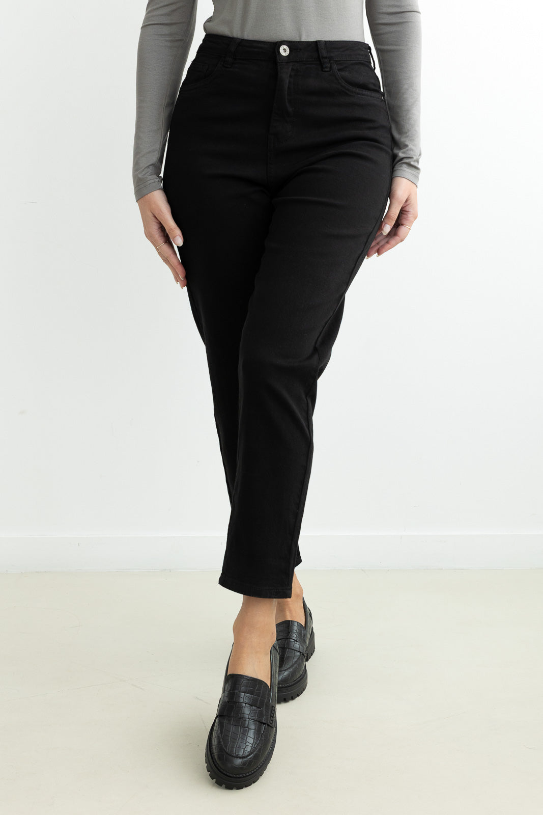 Παντελόνι μαμά fit ψηλόμεσο. Ελαστικό ύφασμα. Τσέπες μπροστά και πίσω. Κλείνει με φερμουάρ και κουμπί.