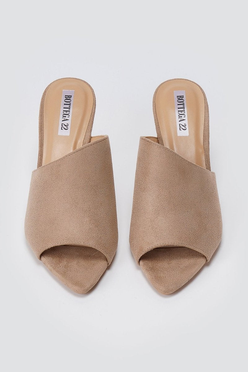 The BOTEGGA 22 Peep Toe Mules in Taupe Suede combine contemporary design with timeless elegance. Featuring a distinctive wide asymmetric strap and refined slim heel, these mules deliver sophisticated styling for any occasion. The peep toe silhouette and neutral taupe colorway make them a versatile addition to your footwear collection, seamlessly transitioning from day to evening wear.