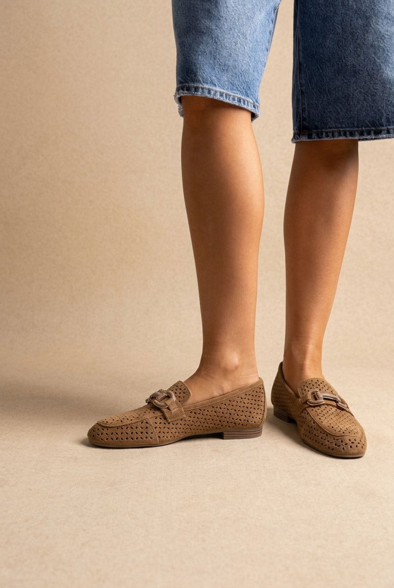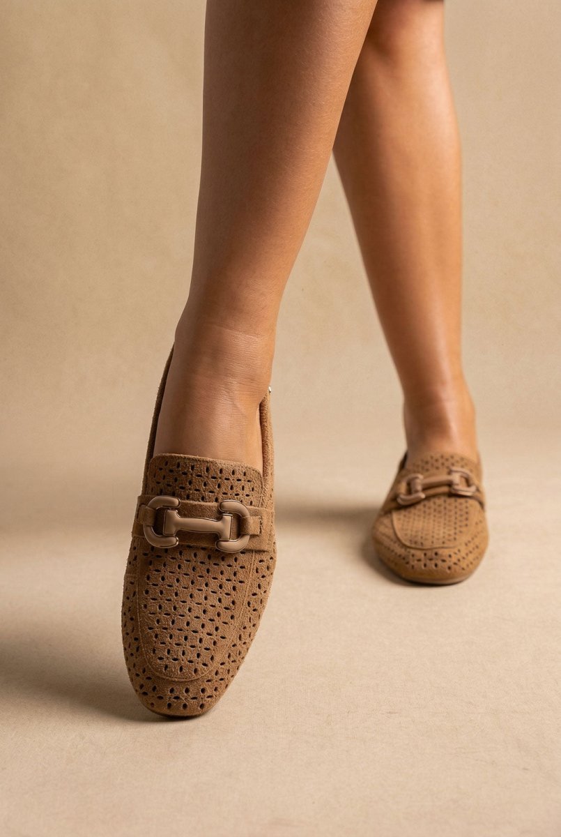 Perforated Suede Moccasins Metal Detail - Camel Suede