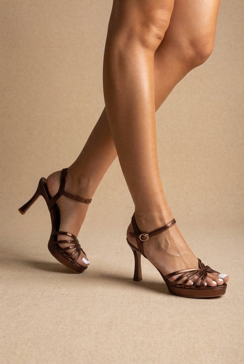Material: Metallic leather upper with adjustable ankle strap closure. Sole construction features a durable platform base with high heel design. The bronze metallic finish provides a luxurious, reflective appearance suitable for evening wear.