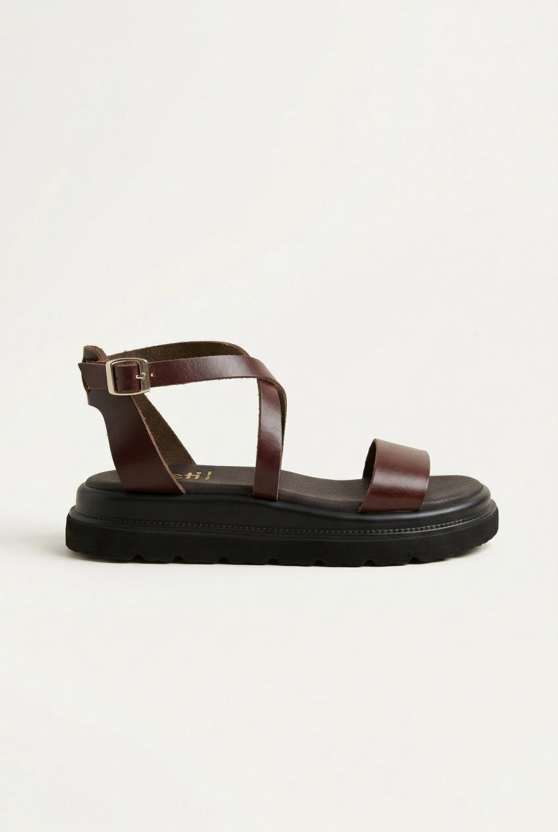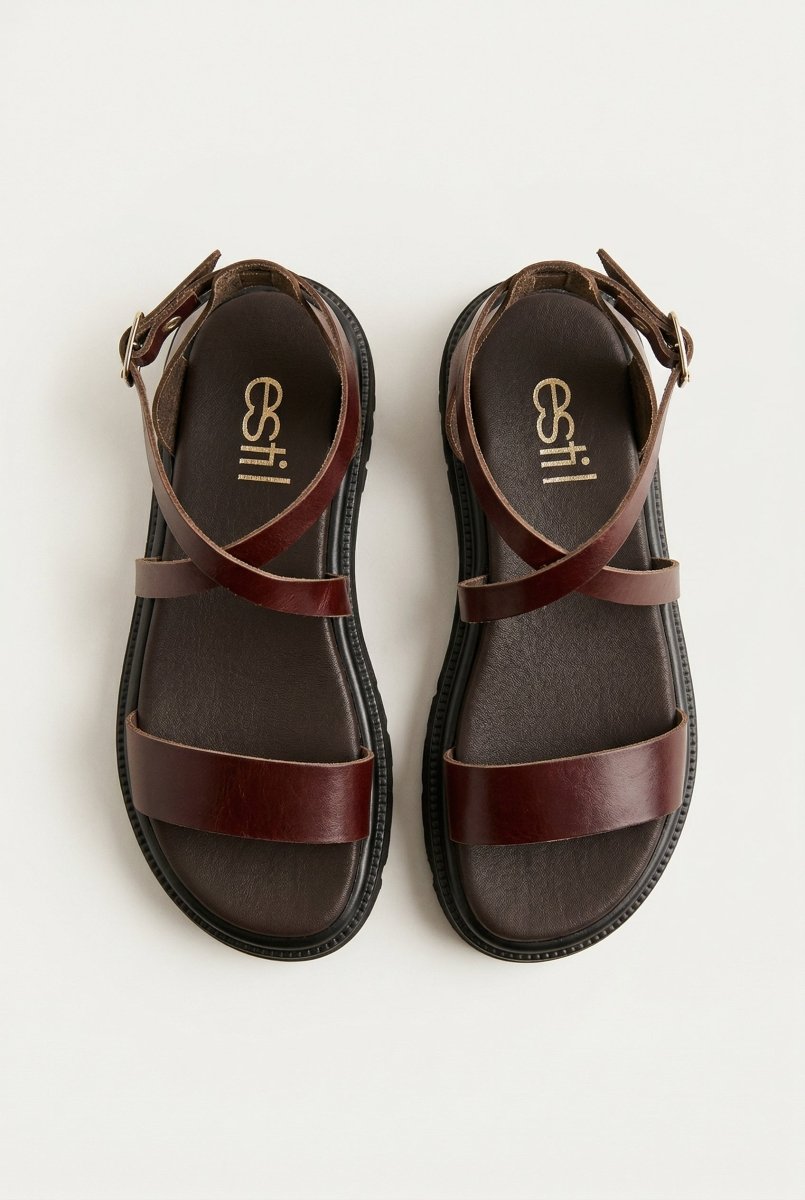 Estil Platform Sandals in Brown Matte combine contemporary design with timeless elegance. Crafted from genuine leather, these flatform sandals feature a distinctive toe band and crisscross instep straps secured with a refined side buckle. Perfect for modern women seeking versatile footwear that transitions seamlessly from casual to semi-formal occasions, these sandals deliver both style and comfort.