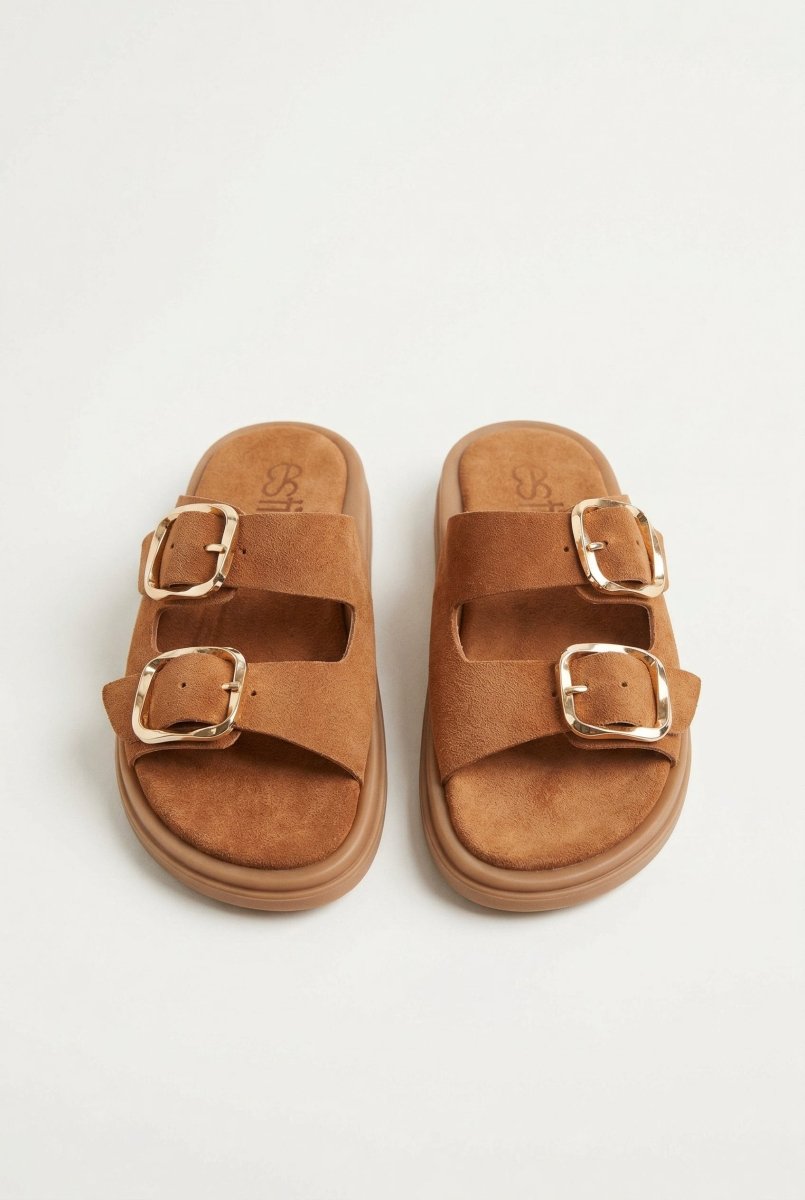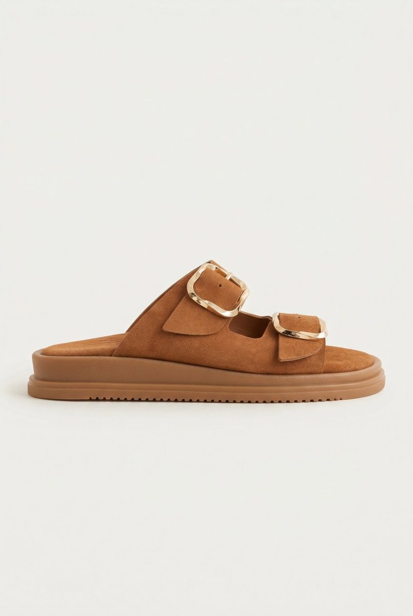 Estil's Platform Sandals in Camel Suede combine contemporary design with everyday wearability. These flatform suede leather sandals feature wide straps and bold buckle accents that elevate any casual or smart-casual outfit. The soft cushioned suede footbed provides supportive comfort for all-day wear, making these sandals an essential addition to your footwear collection.