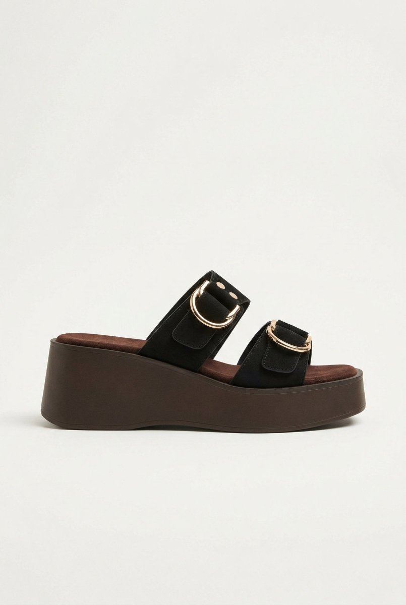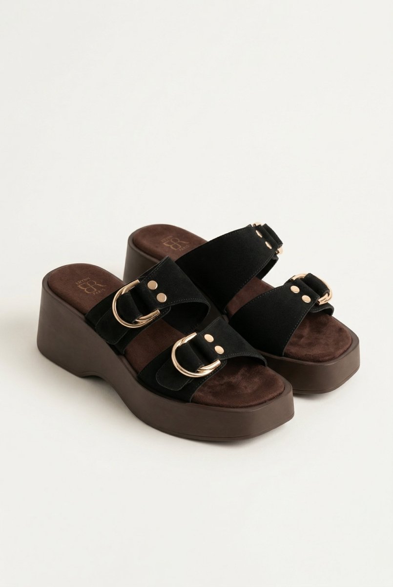 The ERYNN Platform Sandals Metal Detail in Black Suede combine contemporary style with everyday comfort. These striking platform sandals feature luxurious black suede construction, wide supportive straps, and eye-catching metallic accents that elevate any summer wardrobe. The cushioned footbed ensures all-day wearability, making these sandals an ideal choice for those seeking both fashion-forward design and practical comfort.