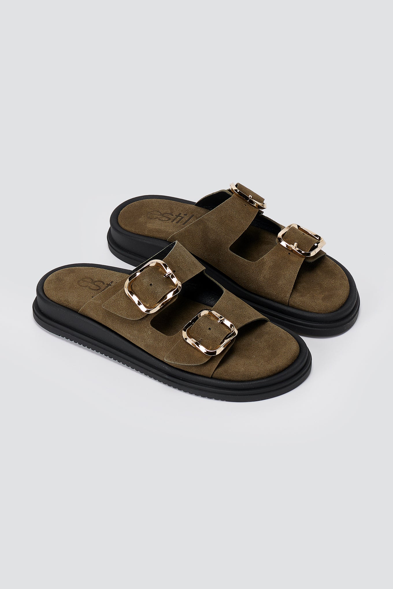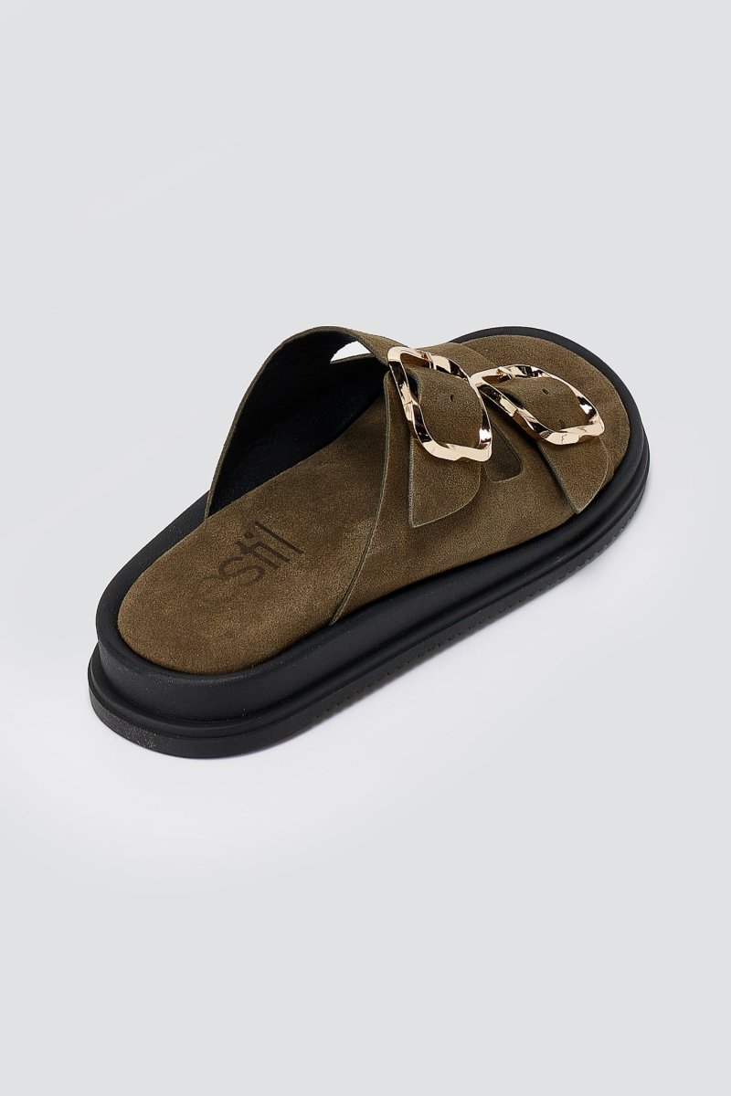 Estil's Platform Sandals in Olive Suede combine contemporary design with everyday wearability. These flatform suede leather sandals feature wide straps and bold buckle accents that elevate any casual or smart-casual outfit. The soft cushioned suede footbed provides supportive comfort for all-day wear, making these sandals an essential addition to your wardrobe.