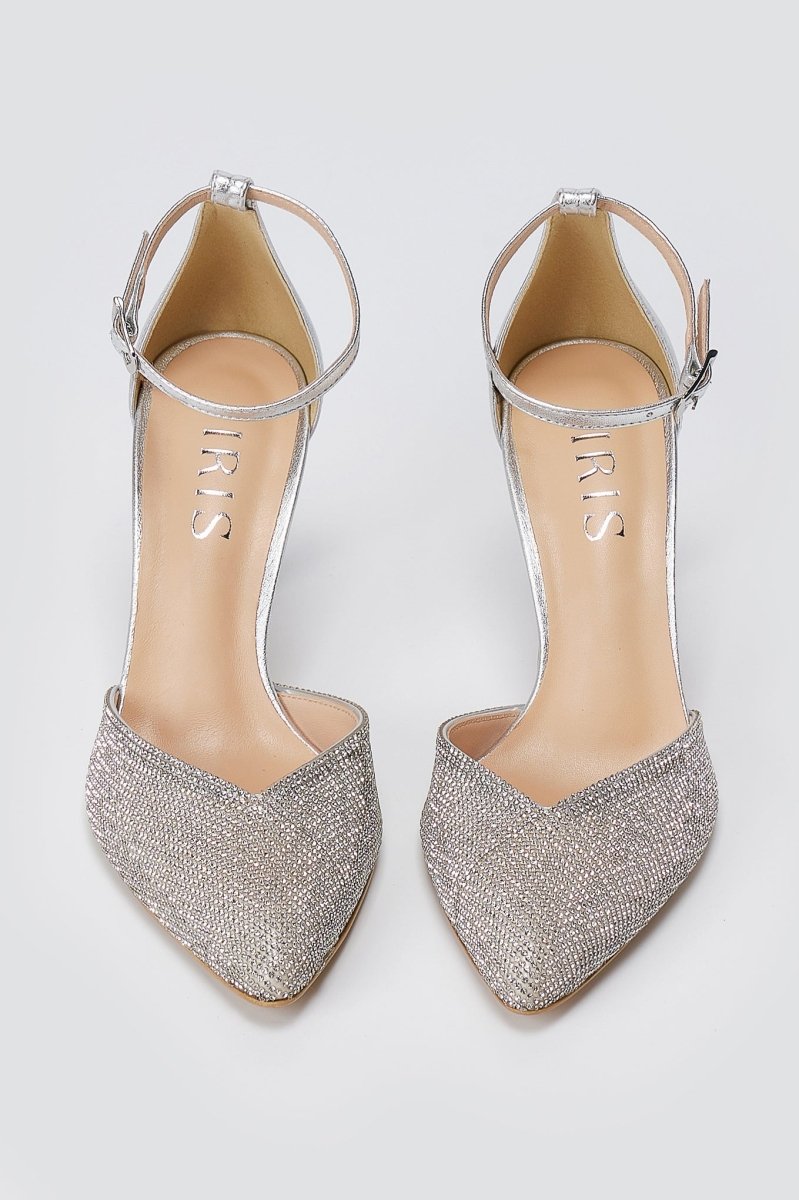 The IRIS Pointed Ankle Strap Pumps in Silver Strass are a sophisticated choice for those seeking glamorous evening footwear. These stunning heels feature a pointed toe silhouette adorned with sparkling rhinestones that catch the light beautifully. The slim ankle strap provides secure support, while the high slim heel delivers an elegant lift. Designed for special occasions, weddings, and formal events, these pumps combine style with refined craftsmanship.