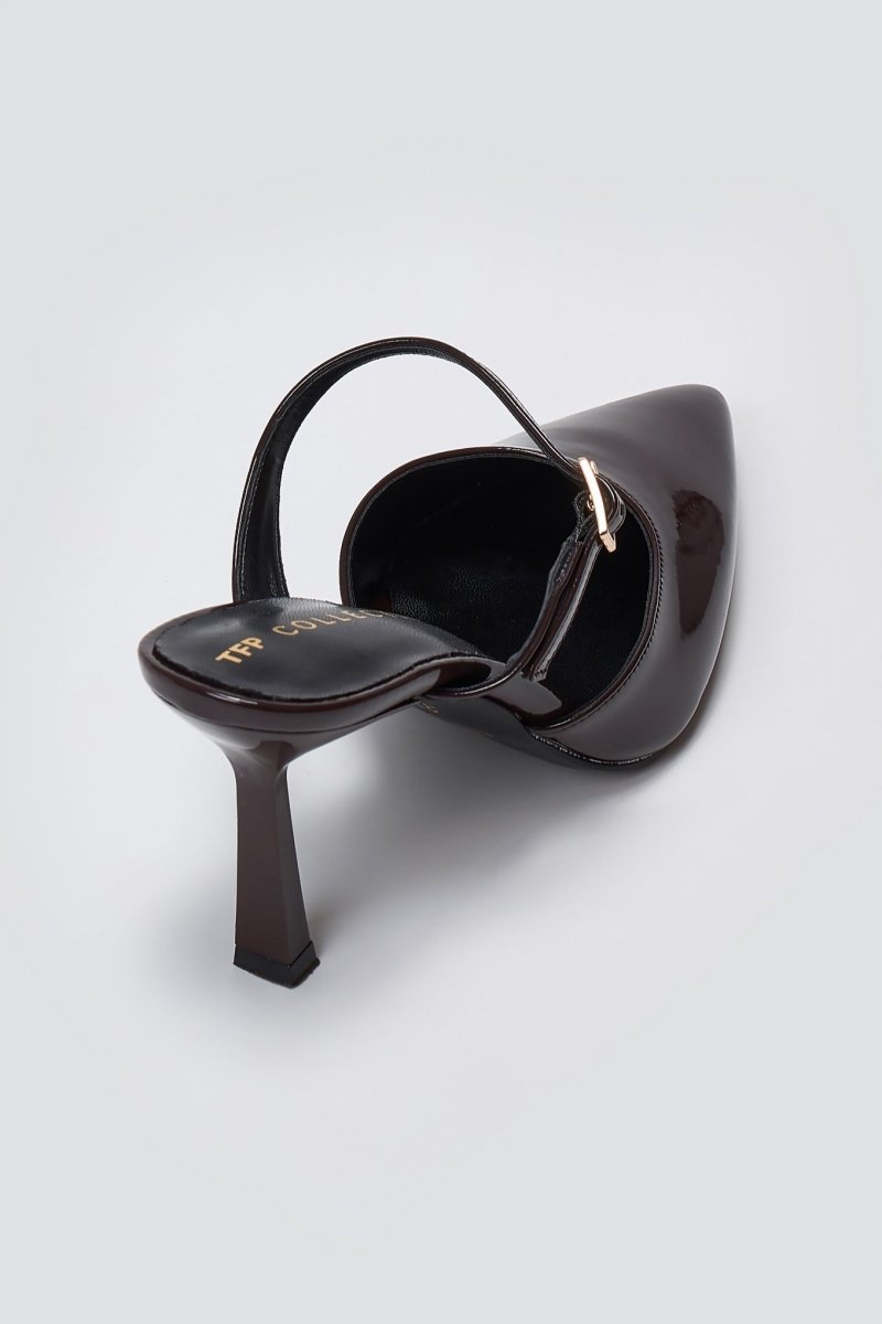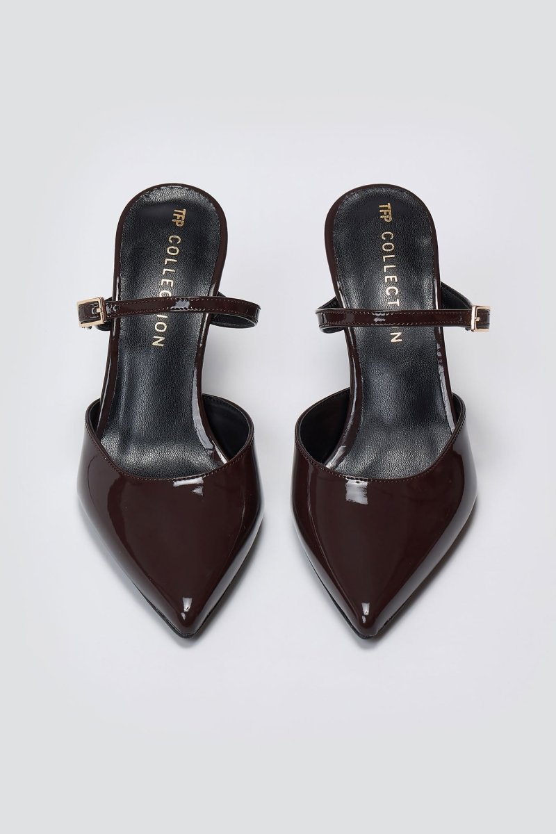 Κομψά μυτερά mules με λεπτό ψηλό τακούνι και διακριτική λεπτομέρεια λουριού. Μίνιμαλ σχεδιασμός, μοντέρνα κομψότητα και διαχρονική φινέτσα σε ένα.