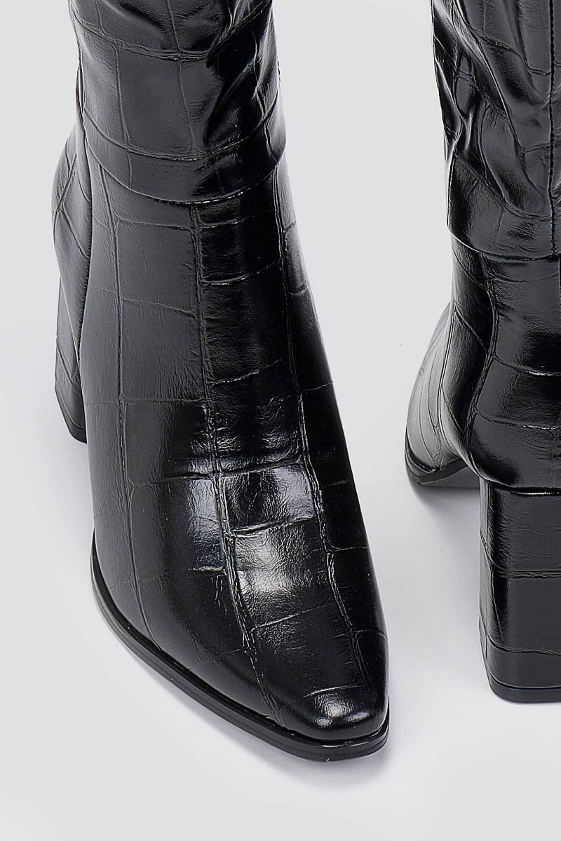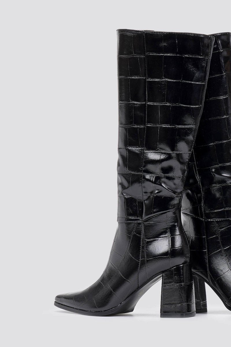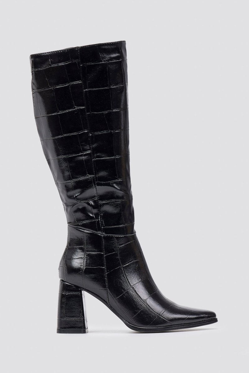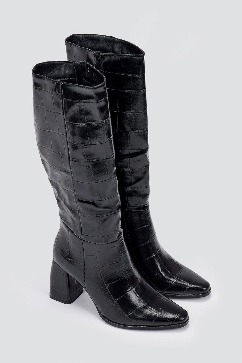 Μυτερές Μπότες με Τετράγωνο Τακούνι - Μαύρο Croc