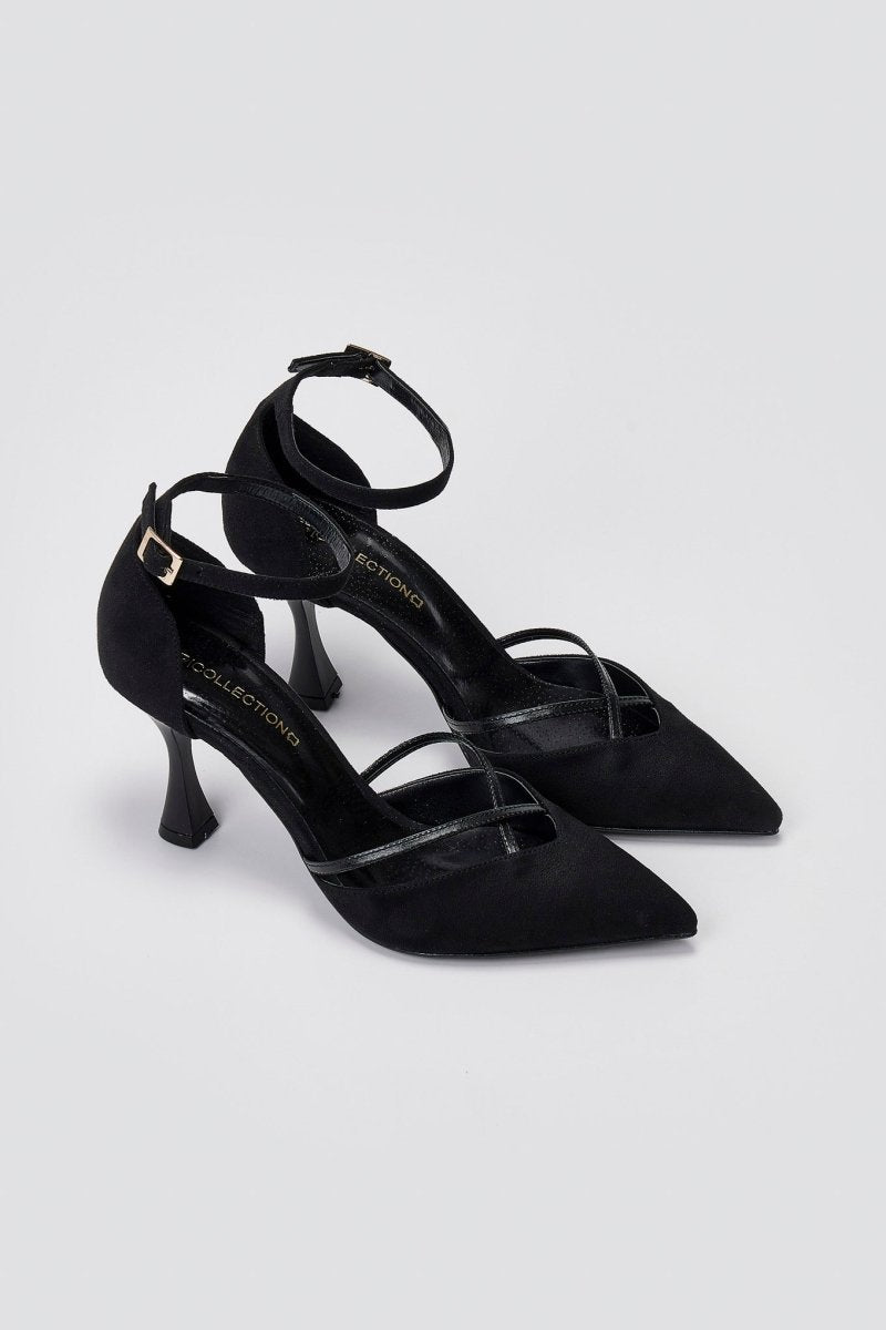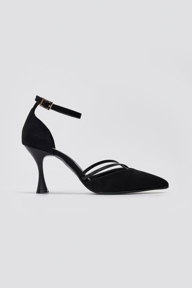 Κομψές γόβες με μυτερή μύτη, πλαϊνά ανοίγματα και λουράκι στον αστράγαλο. Ψηλό τακούνι στιλέτο για εντυπωσιακή, εκλεπτυσμένη εμφάνιση.