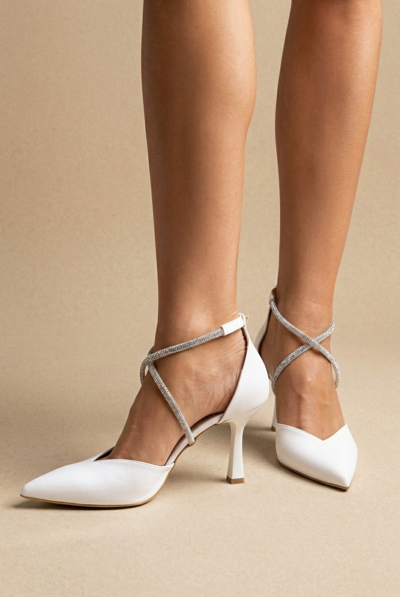 Pointed pumps with open sides, slim stiletto heel and crossover rhinestone straps. Side buckle fastening ensures a secure fit. Elegant lift crafted for modern women.