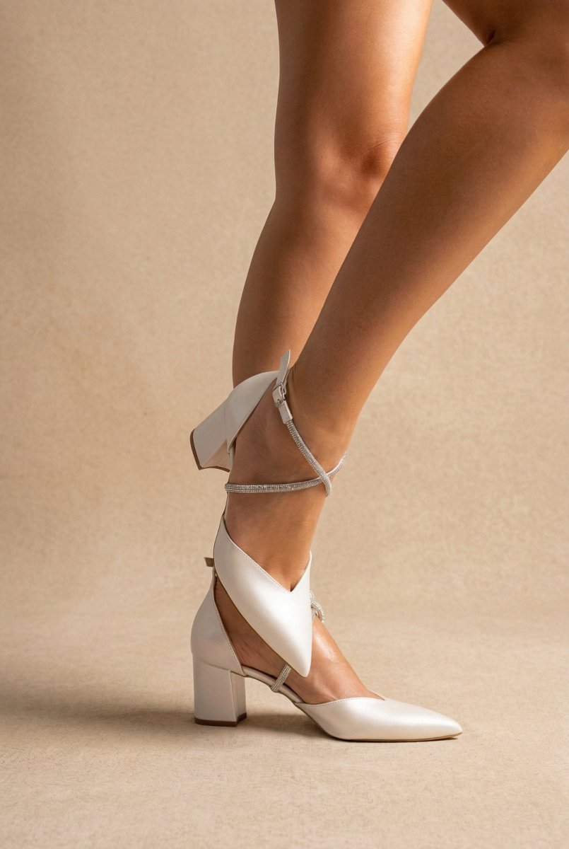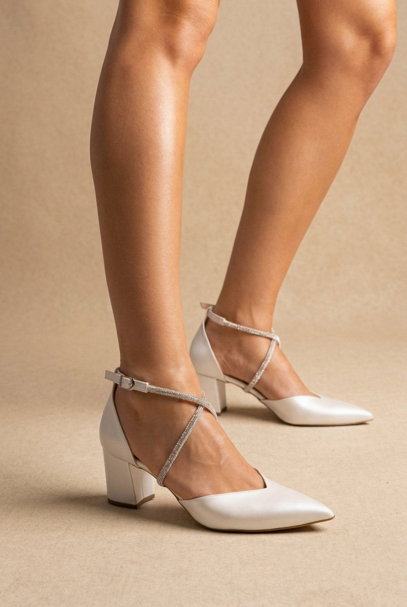The TFP Pointed Toe Pumps in White Pearl combine contemporary elegance with sophisticated design. These refined heels feature a striking pointed toe silhouette, open sides, and decorative crisscross rhinestone straps across the instep. The closed heel and side buckle fastening provide secure support, while the elevated heel offers a flattering lift perfect for both professional and special occasion wear.