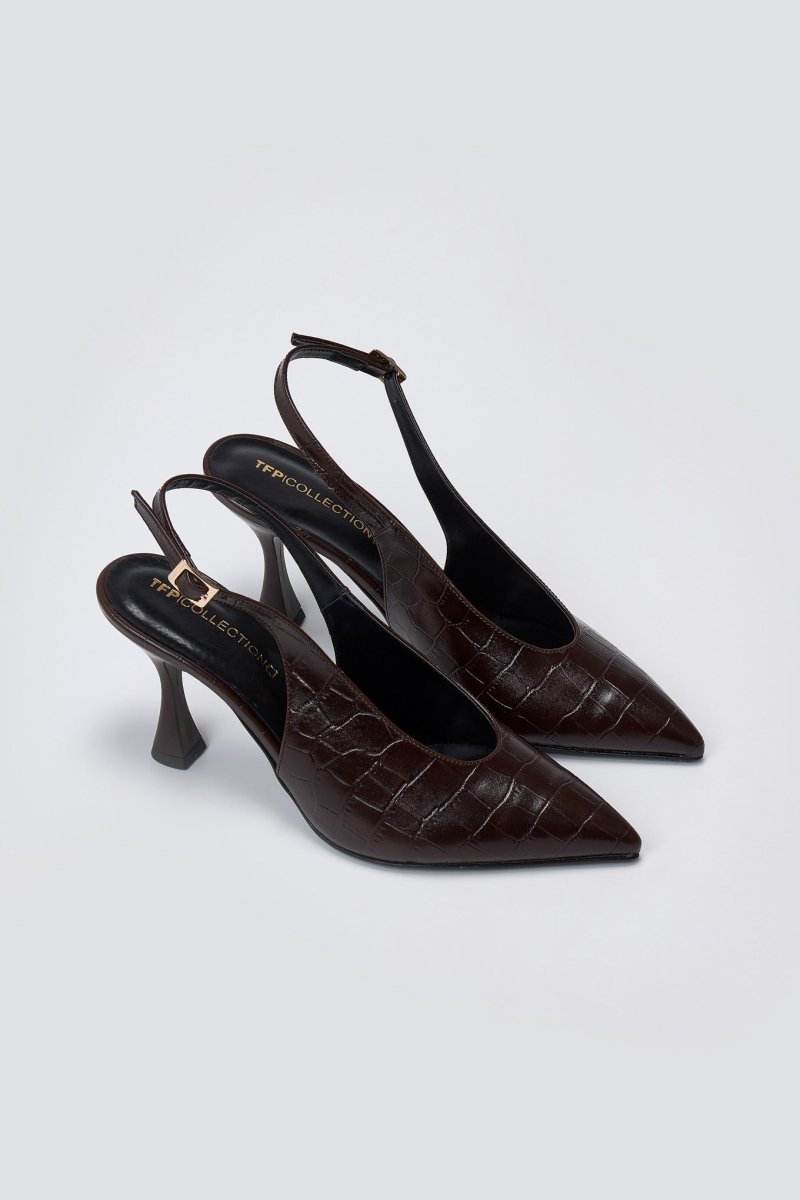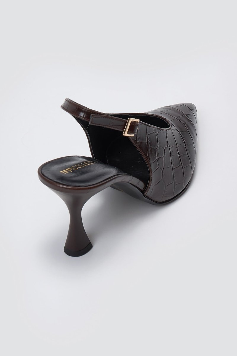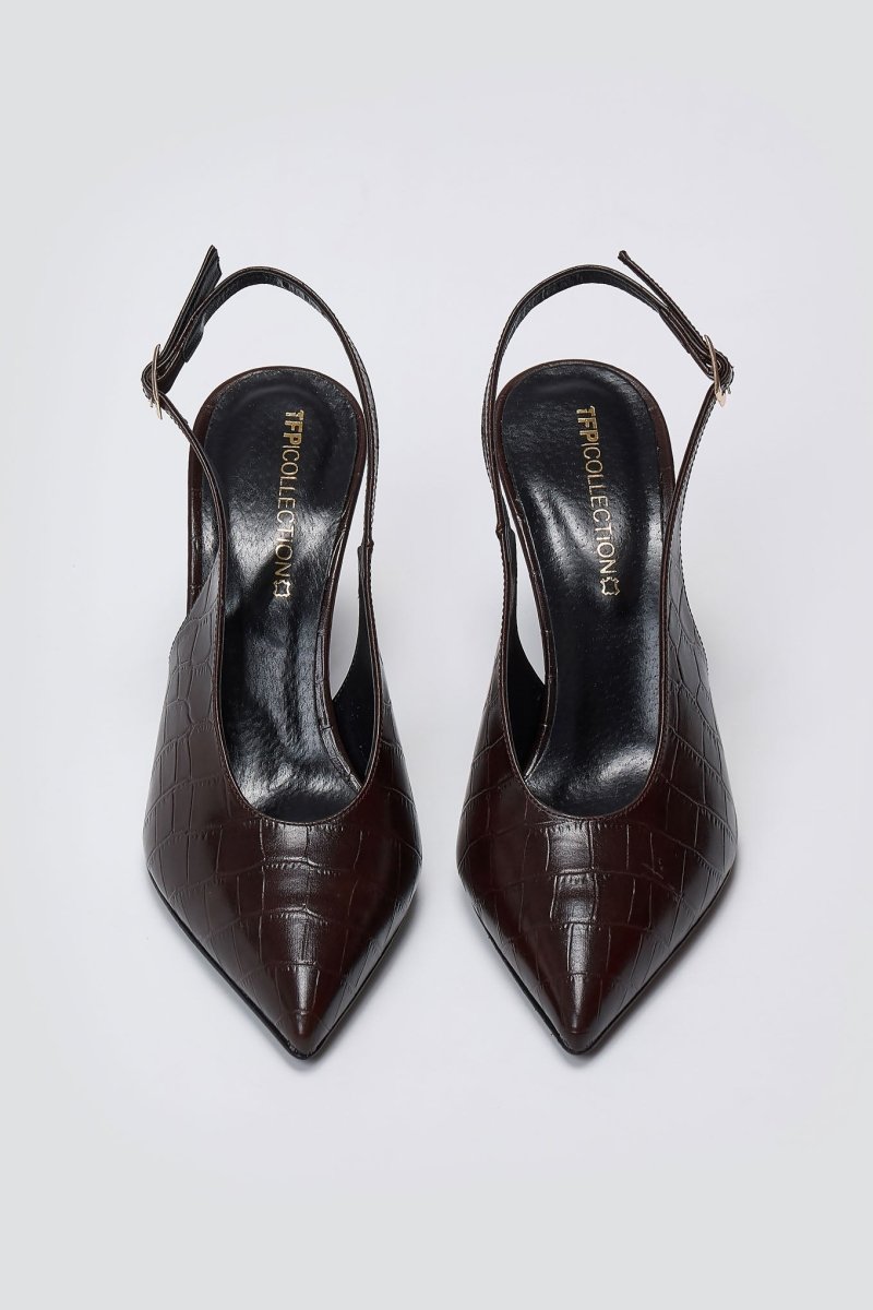 Γόβες slingback με croc ανάγλυφο, λεπτό τακούνι στιλέτο και πλαϊνό λουράκι με αγκράφα. Μαλακός πάτος και κομψή γραμμή σχεδιασμένες για μοντέρνο στυλ.
