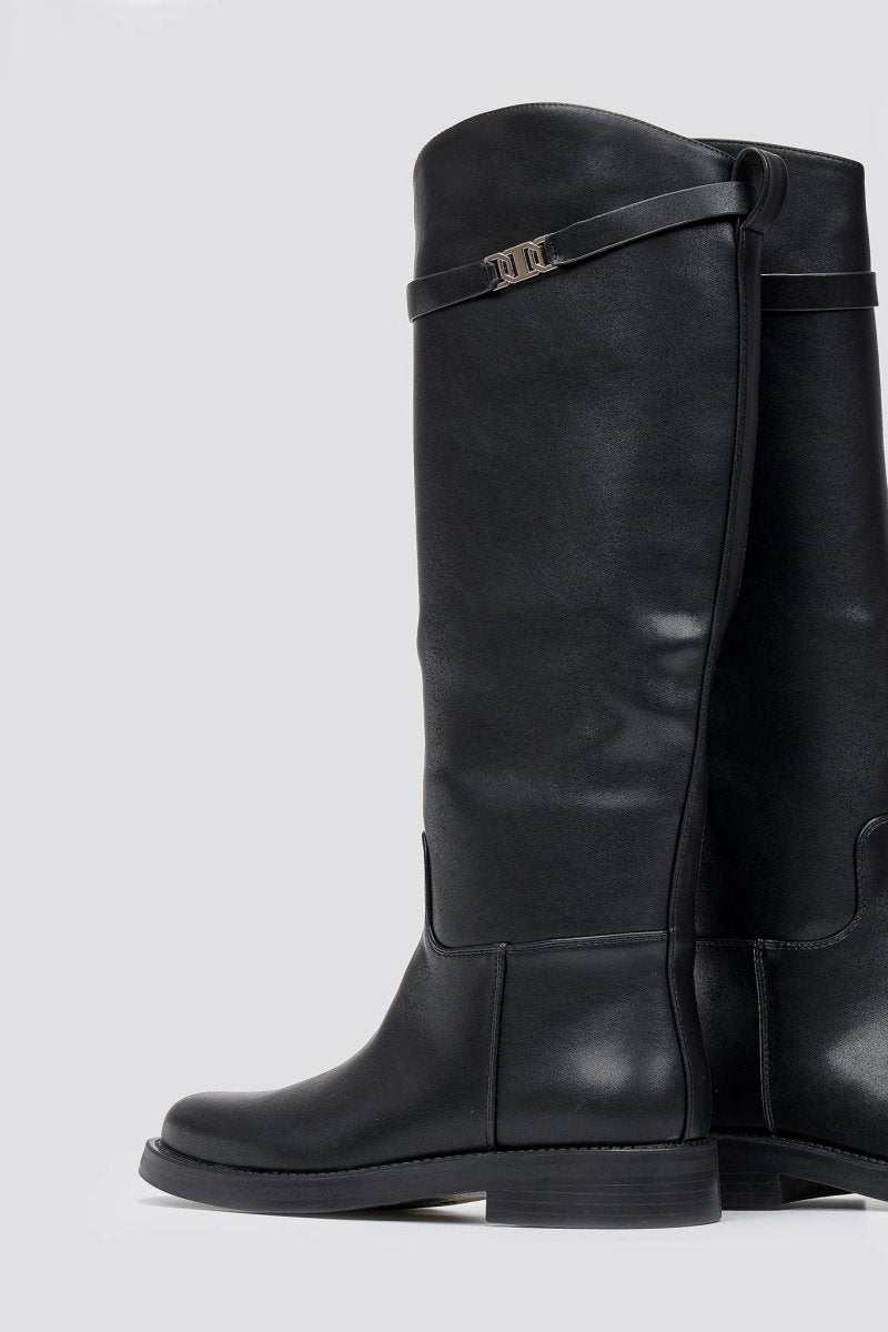 Κομψές μπότες ιππασίας με στρογγυλή μύτη, πλαϊνό φερμουάρ και λεπτό λουράκι με μεταλλική λεπτομέρεια. Καθαρές γραμμές και άνεση όλη μέρα, σχεδιασμένες για μοντέρνο στυλ.