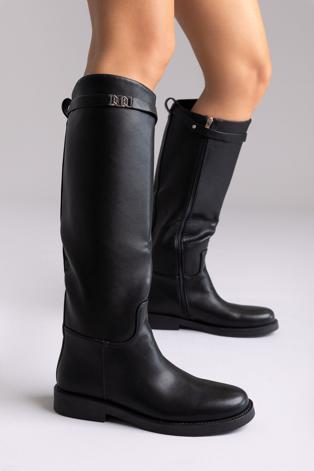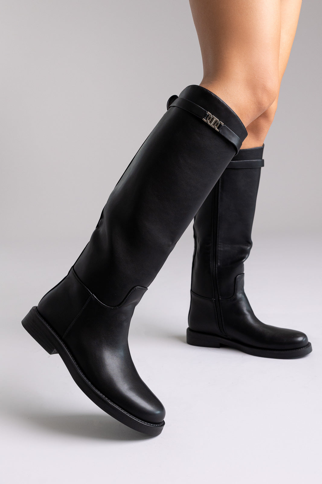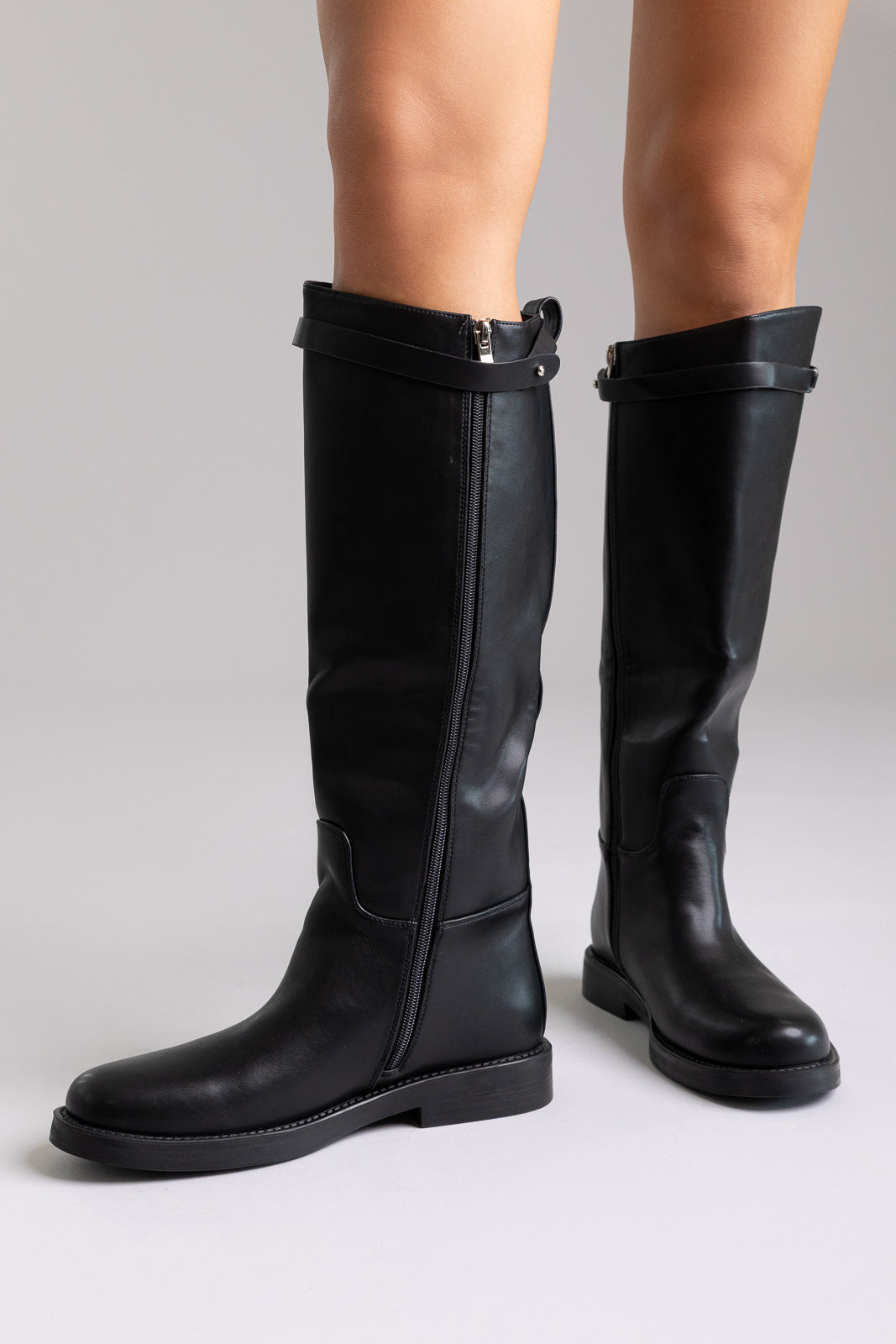 Κομψές μπότες ιππασίας με στρογγυλή μύτη, πλαϊνό φερμουάρ και λεπτό λουράκι με μεταλλική λεπτομέρεια. Καθαρές γραμμές και άνεση όλη μέρα, σχεδιασμένες για μοντέρνο στυλ.