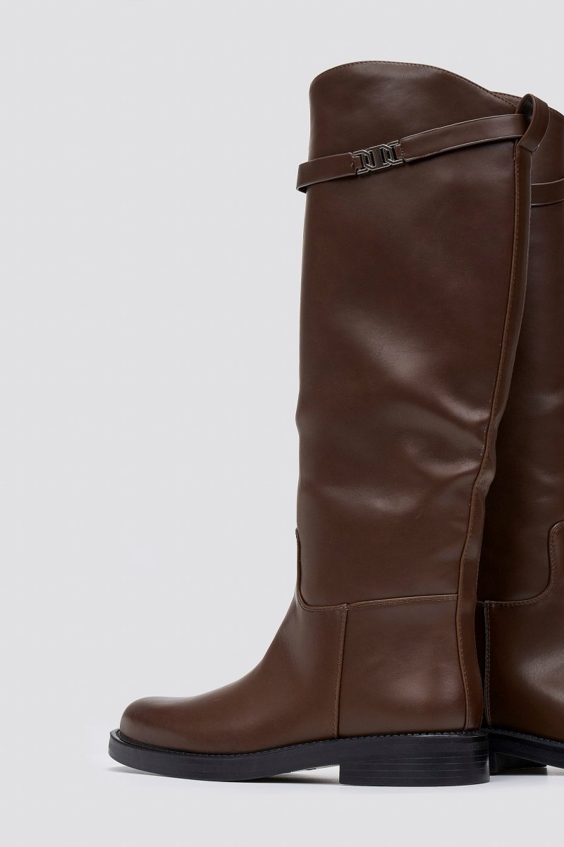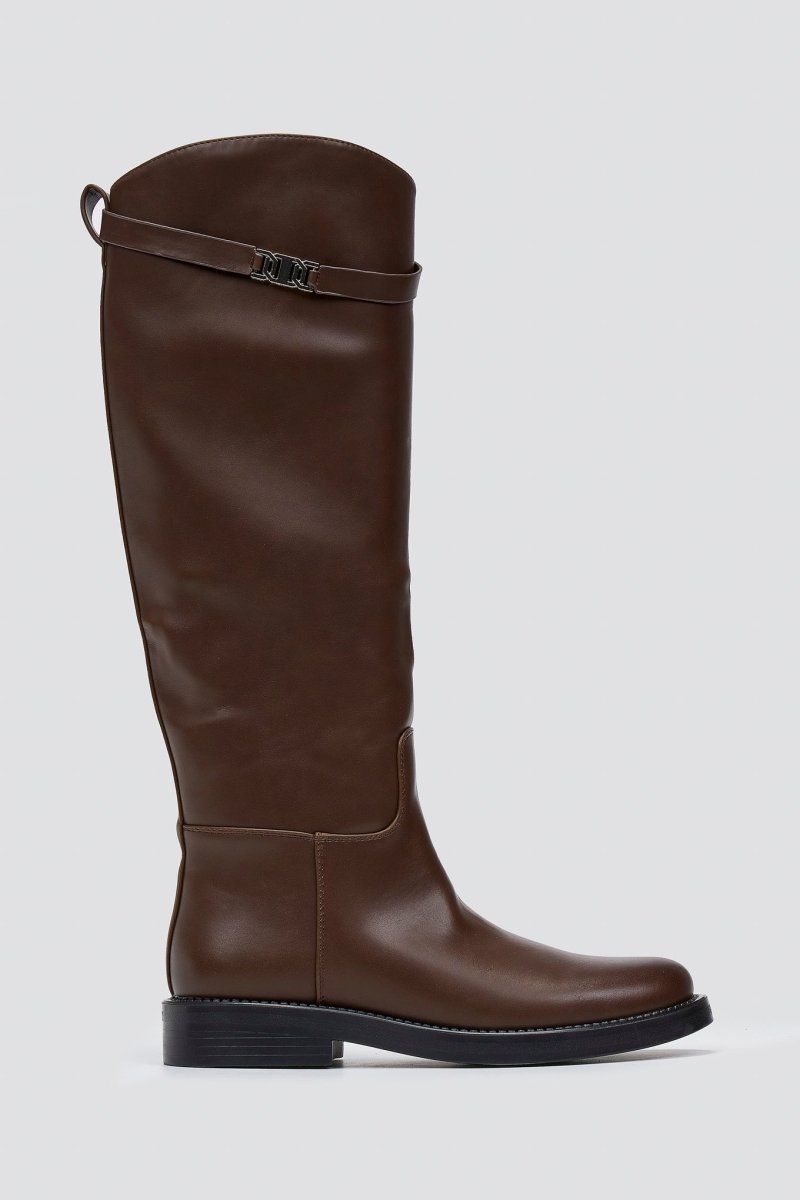 Κομψές μπότες ιππασίας με στρογγυλή μύτη, πλαϊνό φερμουάρ και λεπτό λουράκι με μεταλλική λεπτομέρεια. Καθαρές γραμμές και άνεση όλη μέρα, σχεδιασμένες για μοντέρνο στυλ.