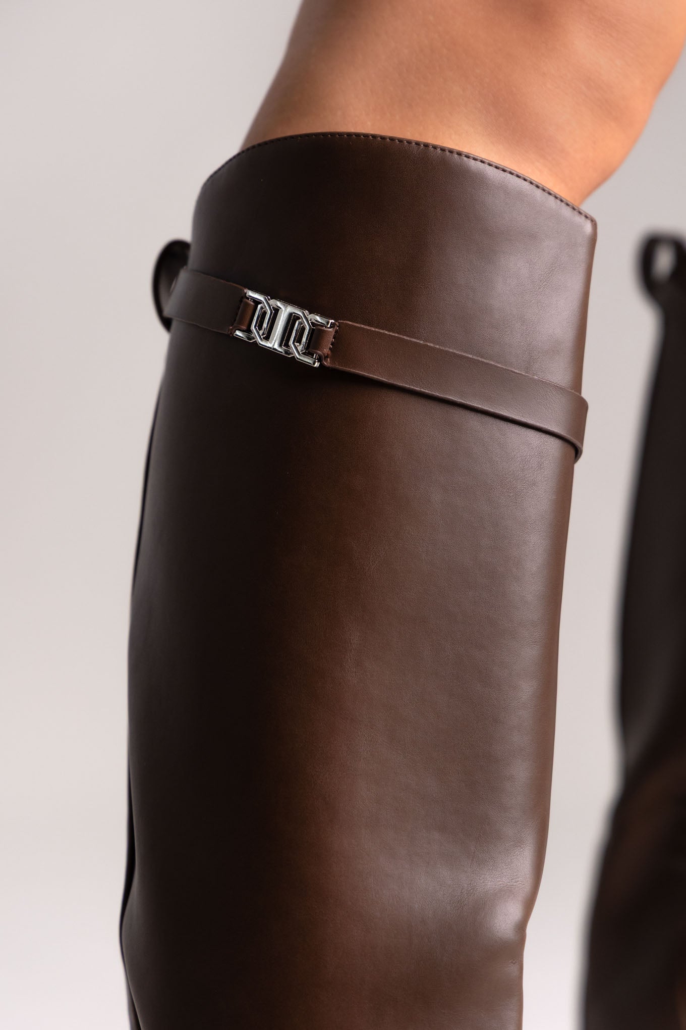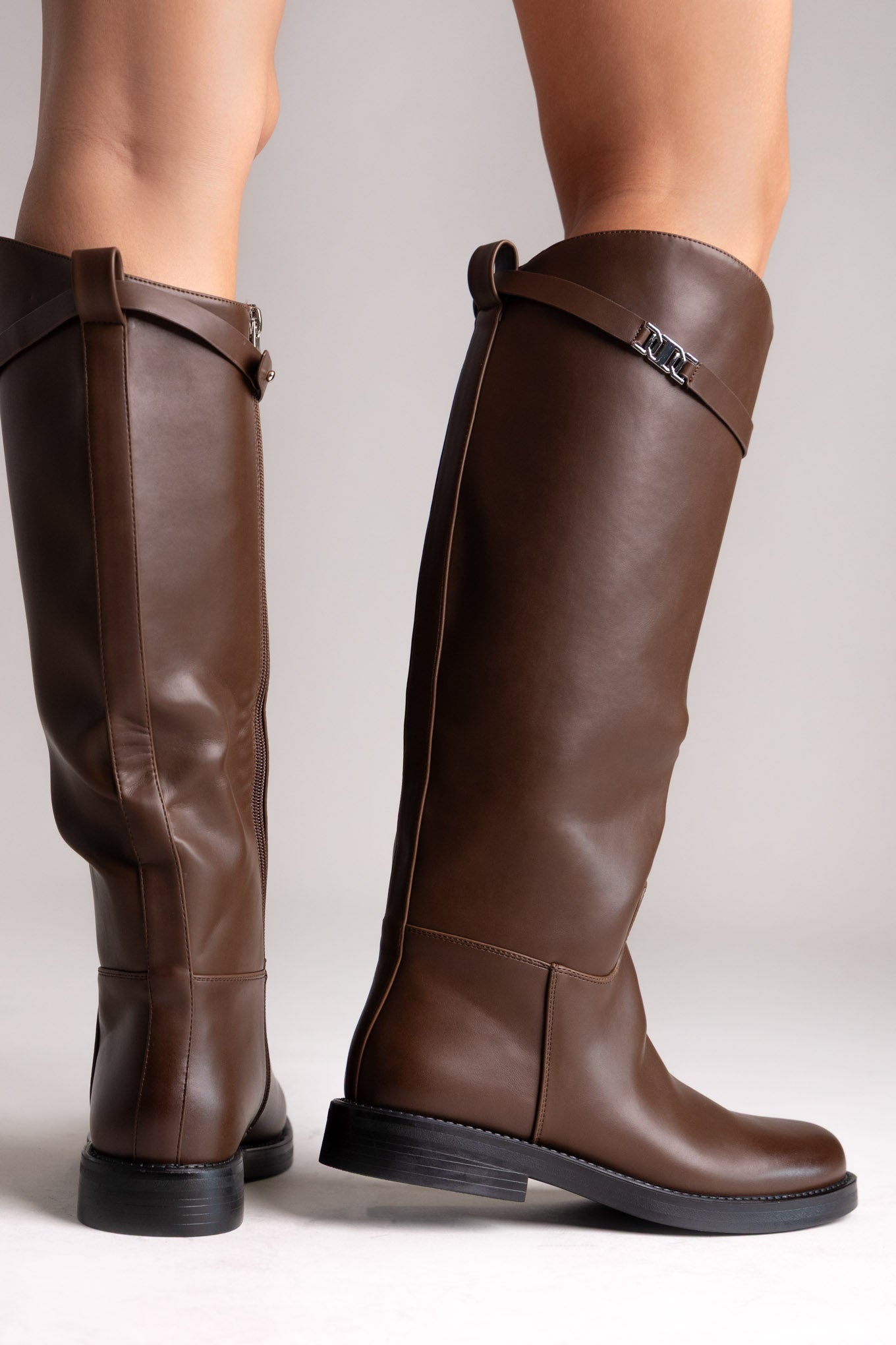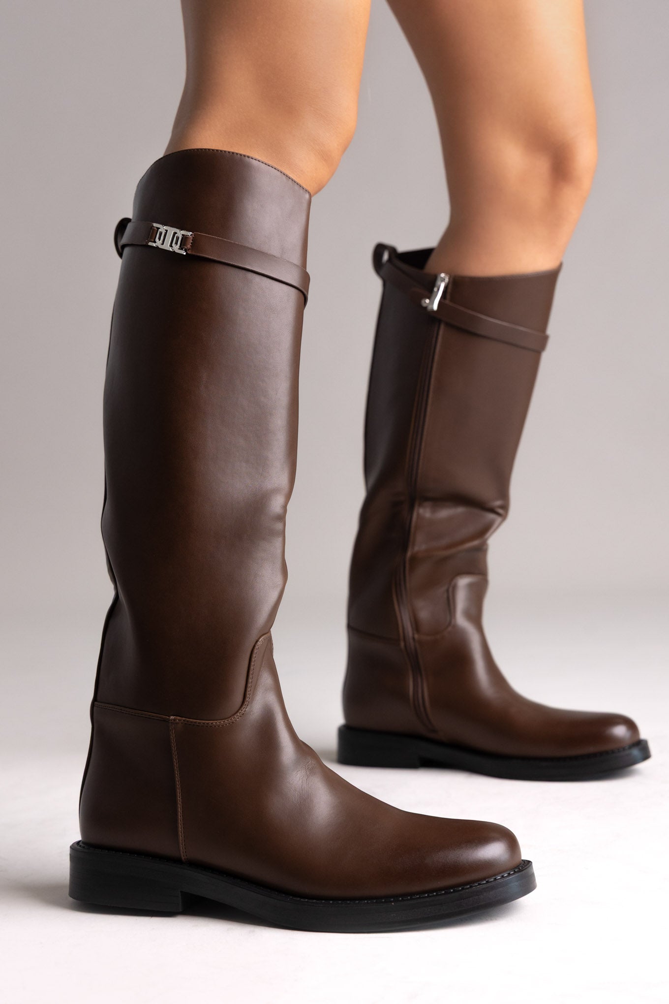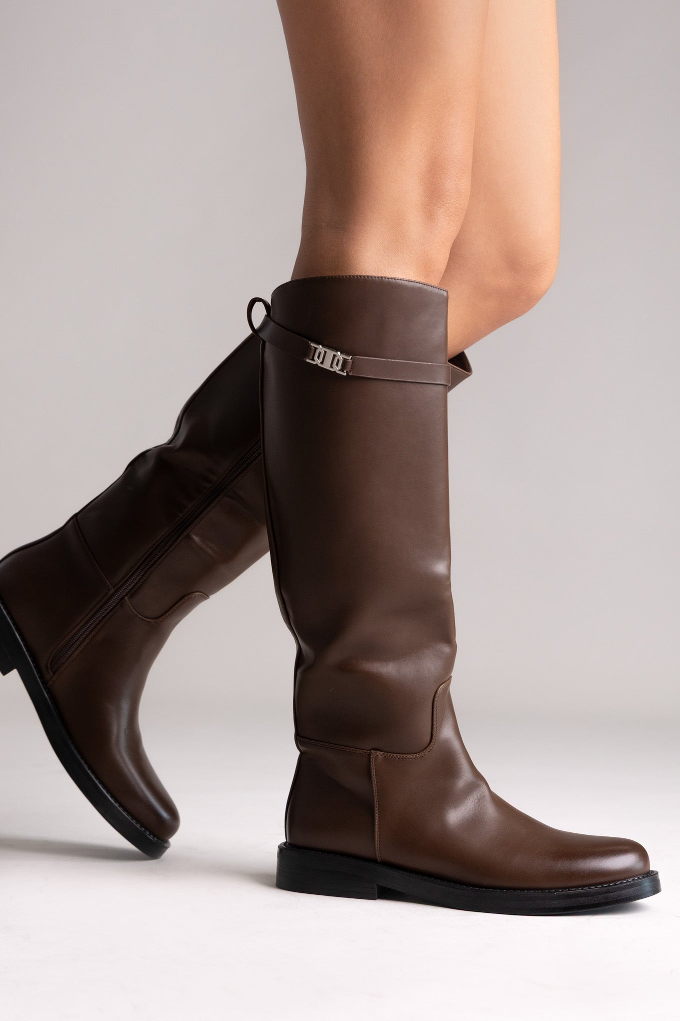 Κομψές μπότες ιππασίας με στρογγυλή μύτη, πλαϊνό φερμουάρ και λεπτό λουράκι με μεταλλική λεπτομέρεια. Καθαρές γραμμές και άνεση όλη μέρα, σχεδιασμένες για μοντέρνο στυλ.