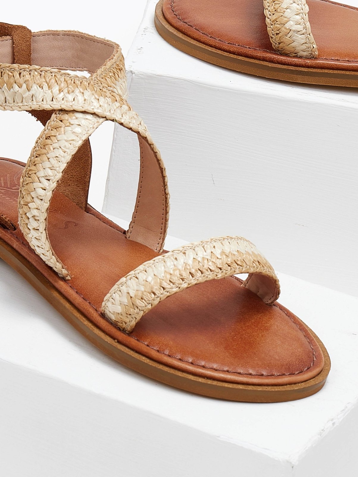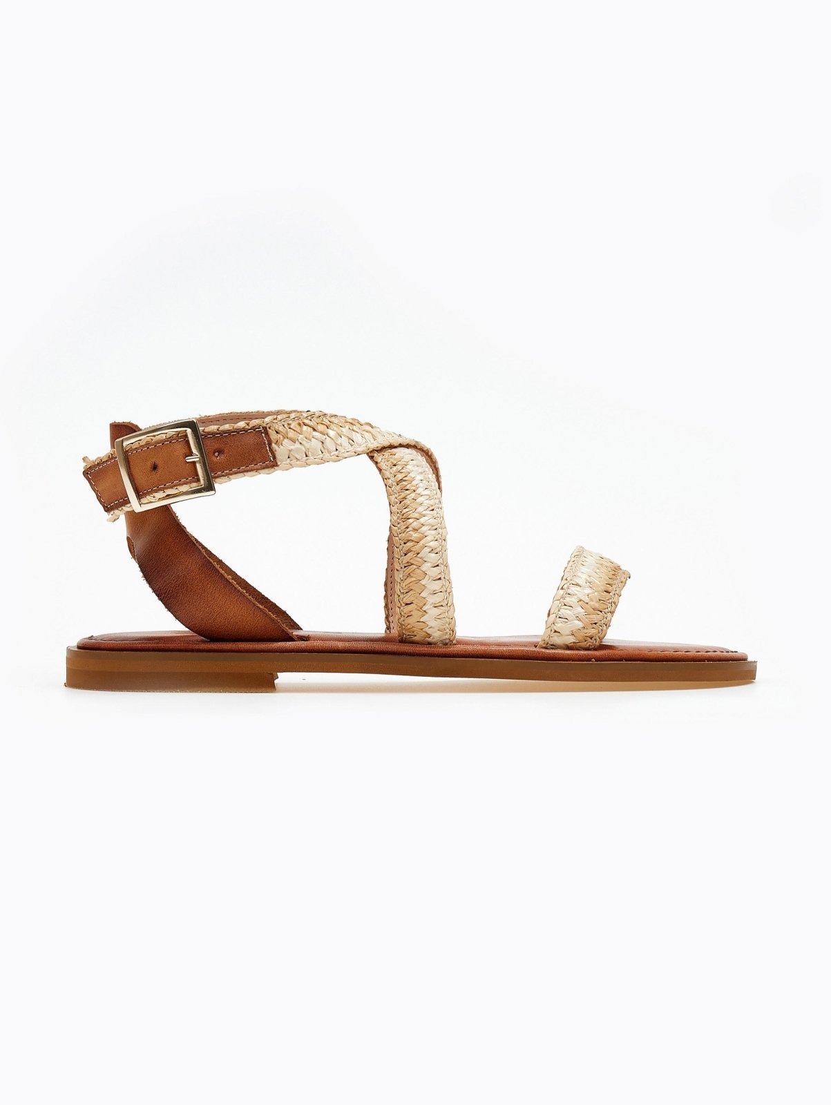 Σανδάλια δερμάτινα Iris Sandals. Έχουν crossover φάσες από ψάθα με διχρωμία. Δένουν με μπαρέτα στο ύψος του αστραγάλου. Δερμάτινος πάτος με ενίσχυση. Ελληνικής κατασκευής.